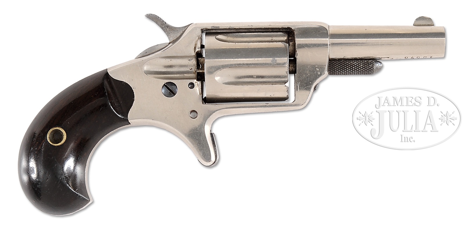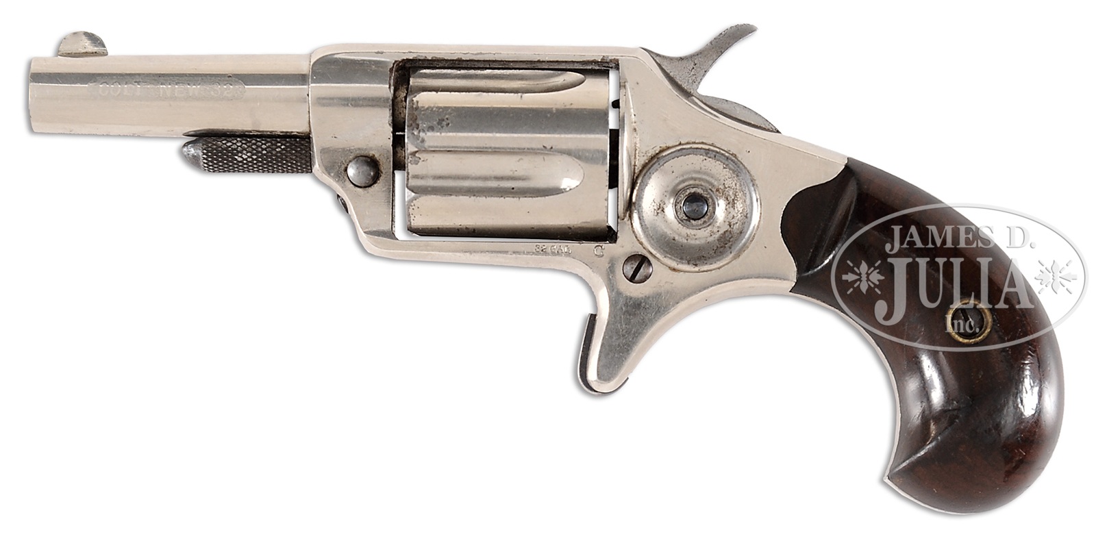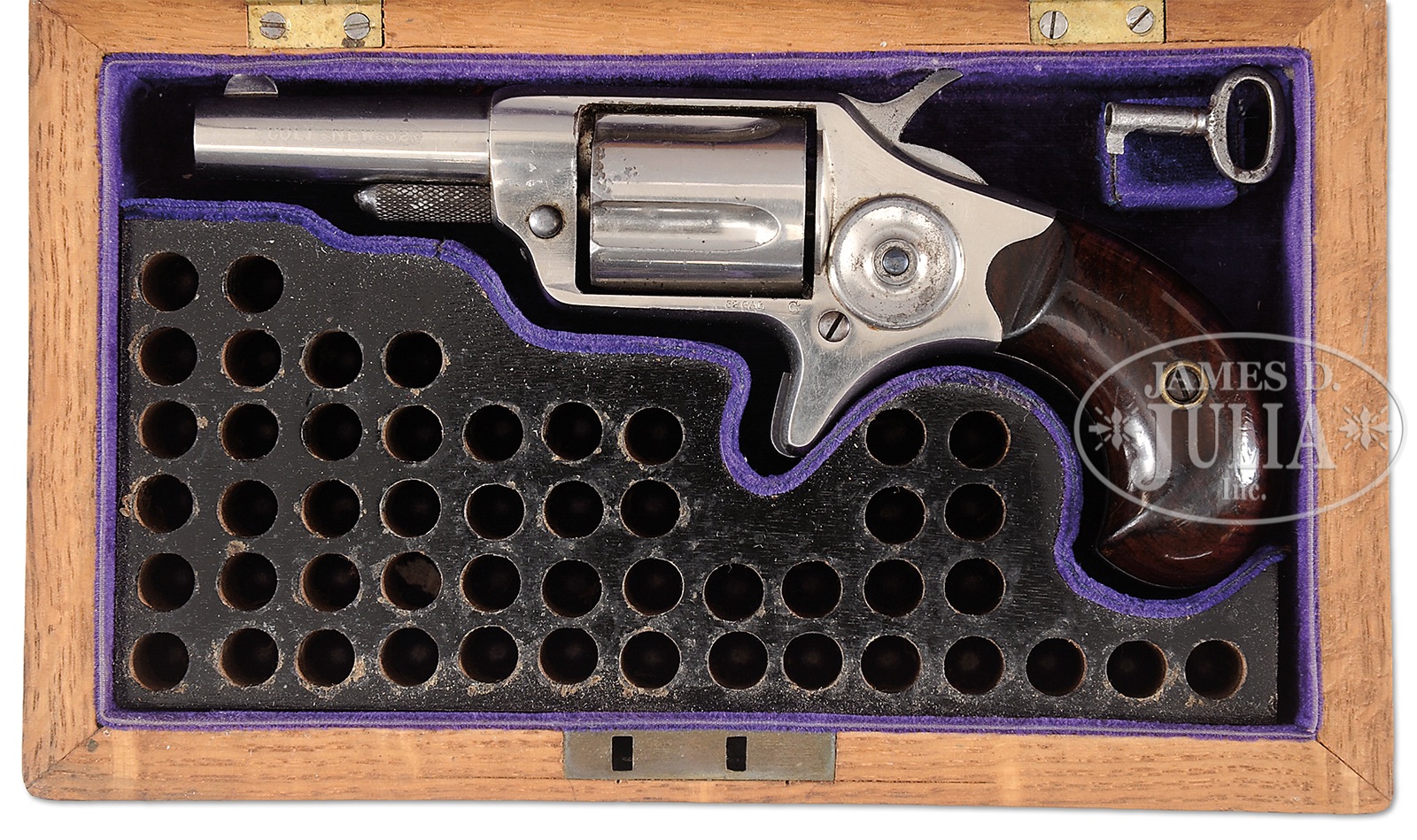 CASED COLT NEW LINE 2ND MODEL 38 CALIBER REVOLVER.SN 10576. Cal. 32 CF. 2-1/4″ rnd bbl with Hartford address, semi-circular front sight and etched panel cal marking. 5 shot long flute cyl. Single action with spur trigger having full nickel finish. 2-pc birdshead rosewood grips. Housed in a oak trade case with purple velour interior containing 49 rnd cartridge block and case key. PROVENANCE: The Dr. Robert G. Cox Estate Collection. CONDITION: Fine. Over 90% orig nickel. Grips show light wear. Knurled cyl pin has spots of flattening. Front sight has slight left hand bend. Sound mechanics. Bore has good rifling with small spots of corrosion. Case has good exterior finish with lightly worn relined interior. 50582-63 DS (1,500-2,500) – Lot 2313 Click here to view provenance