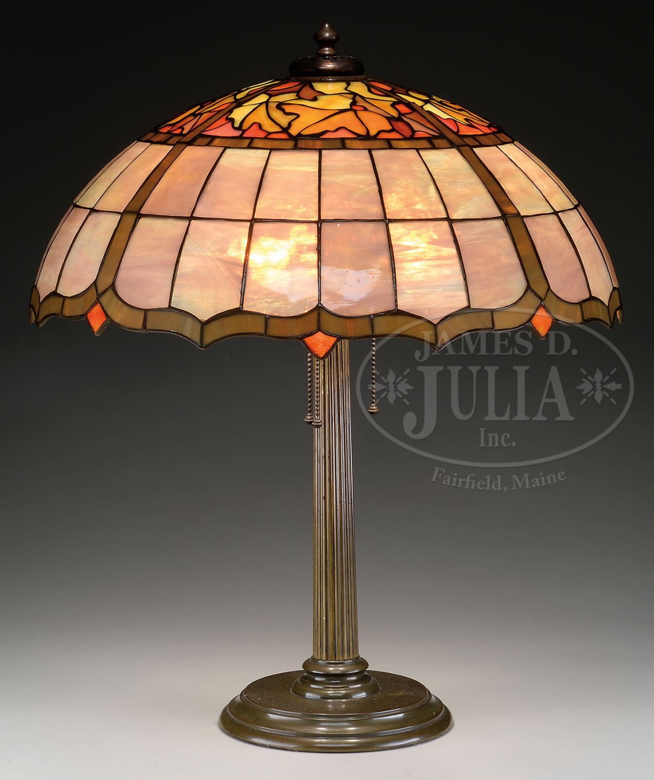 DUFFNER & KIMBERLY LEADED LEAF TABLE LAMP.Duffner & Kimberly table lamp has leaded autumn leaf design encircling the top 1/3 of shade with shaded yellow, amber and cream oak leaves against a striated pink background. Bottom 2/3 of shade consists of large lavender geometric panels with green and brown striated border along with pink striated glass diamonds evenly spaced around scalloped border. Shade rests on original Duffner & Kimberly base with round stepped platform foot and vertically ribbed stem. Base is complete with three socket cluster and fleur-de-lis heat cap. Base is finished with light brown patina. Similar example is pictured in the book Mosaic Shades, Volume II, by Paul Crist, pg 217. SIZE: Shade is 19-3/4″ dia. Lamp is 24″ t. CONDITION: Shade has diagonal tight hairline crack in one large geometric panel and several inconspicuous tight hairlines in leaded leaf design. Base has minor wear and discoloration to patina, heat cap is slightly darker color then rest of base. Re-wired with appropriate cloth cord. 50490-5 (3,000-4,000) – Lot 2315