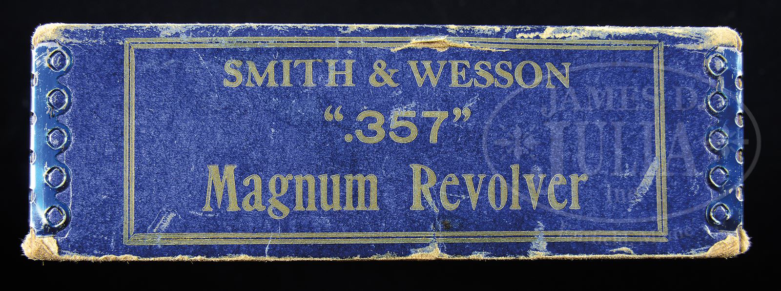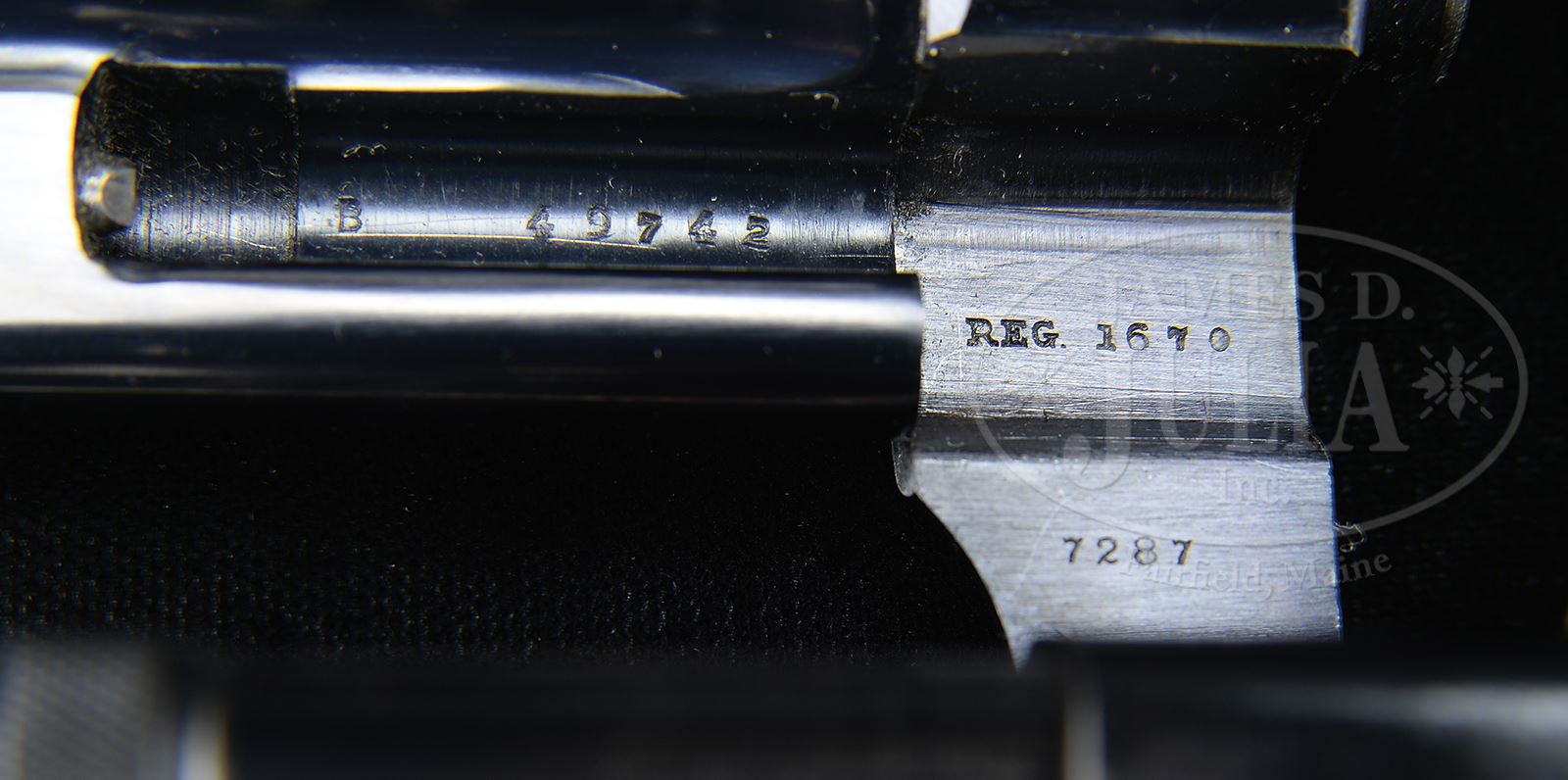*RARE SMITH & WESSON PRE-WAR REGISTERED MAGNUM DA REVOLVER WITH BOX.SN 49742. Cal. 357 Magnum. Blue finish with 8-3/4″ ribbed bbl, partridge front sight with McGivern bead front sight and adjustable rear sight in the rnd top frame. Top of rib & top strap are nicely checkered. Frame is 5-screw type with standard trigger and hammer that has fine checkered spur and serrated sides. Mounted with large silver medallion, diamond checkered Magna grips, matching numbered to this revolver. Rear face of cyl and inside ejector housing are marked with matching SN. Inside the crane, frame is marked “REG 1670”. Accompanied by an orig royal blue & gold, Chinese red inside, 2-pc cardboard box which contains, what appears to be orig wax paper and a brass cleaning rod. Also accompanying is a 2-page Smith & Wesson factory letter which identifies this revolver as a pre-WWII Registered Magnum in cal 357 Magnum, registration number 1670, shipped Nov. 24, 1936 to “The Palace, 220 Main St., Kalispell, MT”. It was shipped with 8-3/4″ bbl and Sheard gold bead front sight, walnut grips with grip adapters attached, now missing. Additionally accompanied by a Smith & Wesson owners pamphlet for the Magnum revolver which pictures the long barreled revolver and the grip adapter. It is also accompanied by a 1936 Smith & Wesson, 80th Anniversary catalog. This is the model of revolver touted by the renowned author and Magnum Guru, Elmer Keith. This was Smith & Wesson’s finest double action revolver. PROVENANCE: Larry Baer Estate Collection. CONDITION: Very fine to extremely fine, all matching. Overall retains 96-97% strong, orig factory blue with only faint muzzle edge wear and very faint sharp edge wear. Grips are crisp, showing only light diamond point wear. Mechanics are crisp. Brilliant shiny bore. Has been fired, but not a lot. Box has a break in one side and shows corner & edge wear with some missing surface paper on one side. It also has evidence of old tape having been removed. Interior is bright & clean. Catalog, cleaning rod & owners pamphlet are bright & clean. 49427-11 JR C&R (5,000-8,000) – Lot 2316 Click here to view provenance