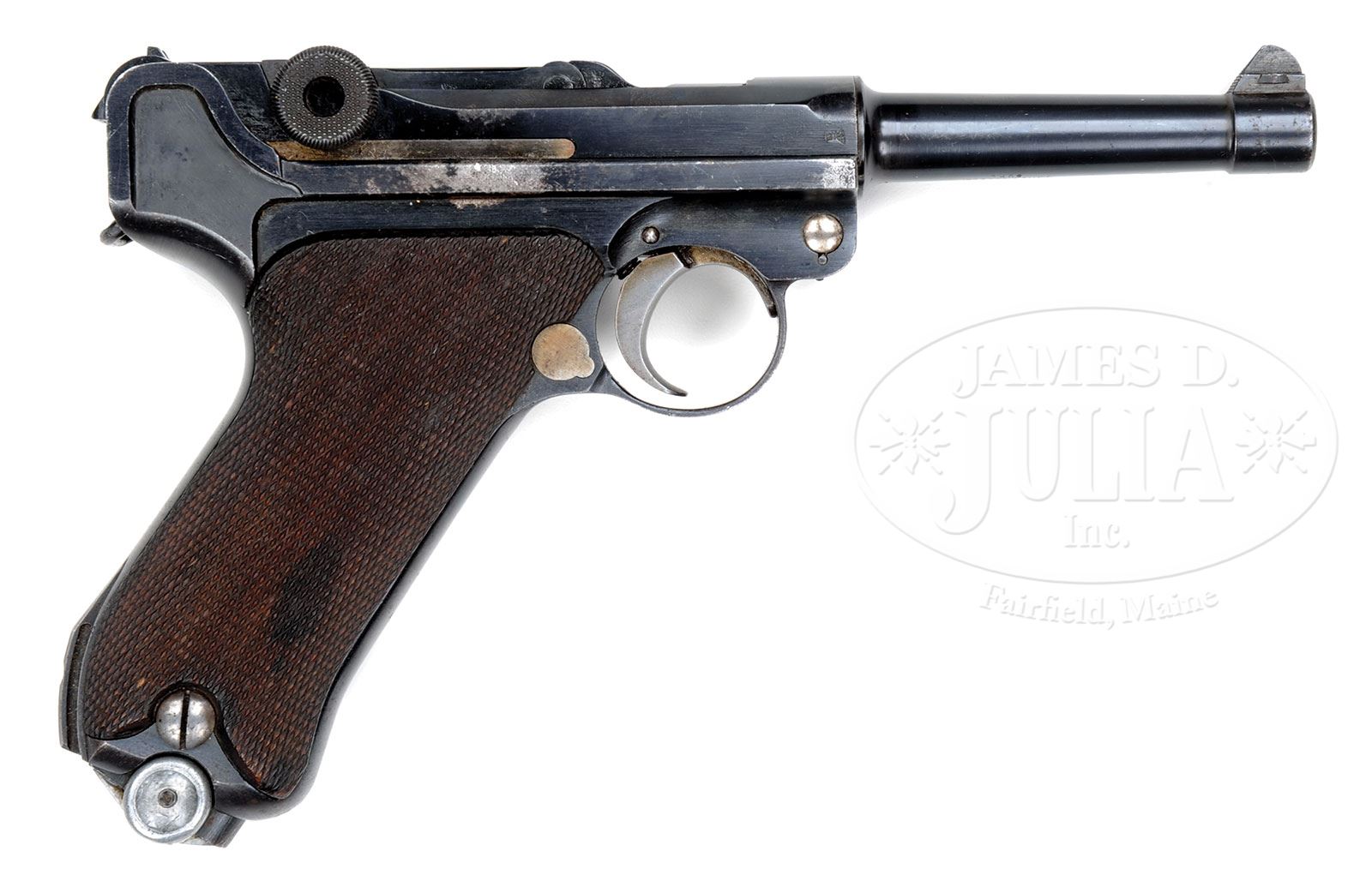 *◊ RARE FRITZ KIESS COMMERCIAL REWORK DWM LUGER PISTOL.SN 9269. 30 cal. 4″ bbl with Eagle/N and Eagle/J (scarce Nazi era repair mark) proofs above “FRITZ KIESS & CO./SUHL” Next to “M MULLER” on bottom of bbl. DWM scroll on center toggle link. Eagle/N proofs on toggle assembly and right receiver. Numbered parts on gun are matching including checkered walnut grips. Aluminum bottom fxo magazine is unnumbered. PROVENANCE: Collection of Dr. Geoffrey Sturgess. CONDITION: Fine retaining 95% Fritz Kiess blue and 90% straw. A couple of areas of pitting on the right frame rail. Grips are lightly worn and dark. Bore is bright and sharp. Mag body retains 75% blue and has light scattered pitting. Aluminum bottom has normal wear. Mechanics are fine. 4-52819 (2,000-3,000) – Lot 2317