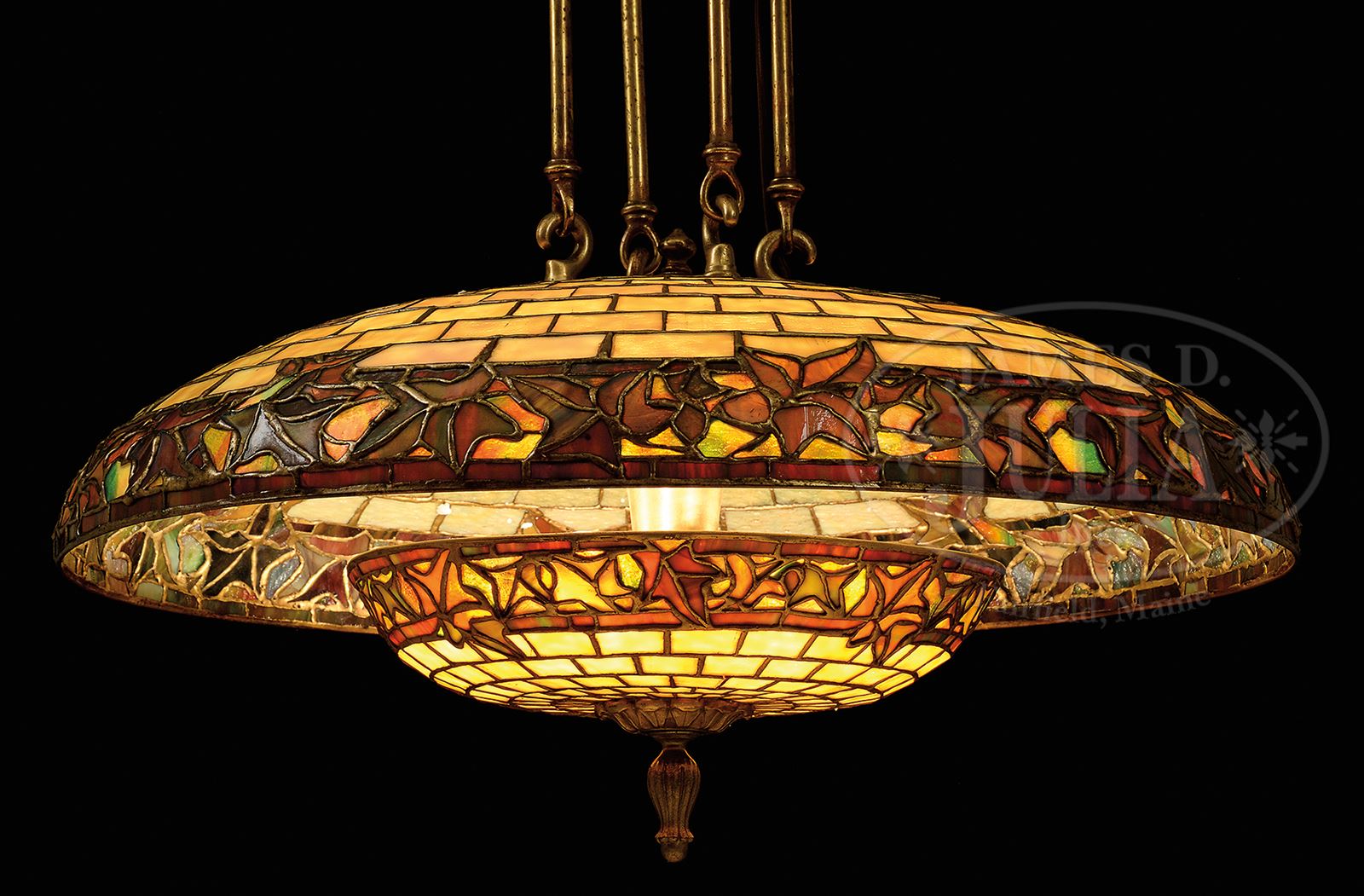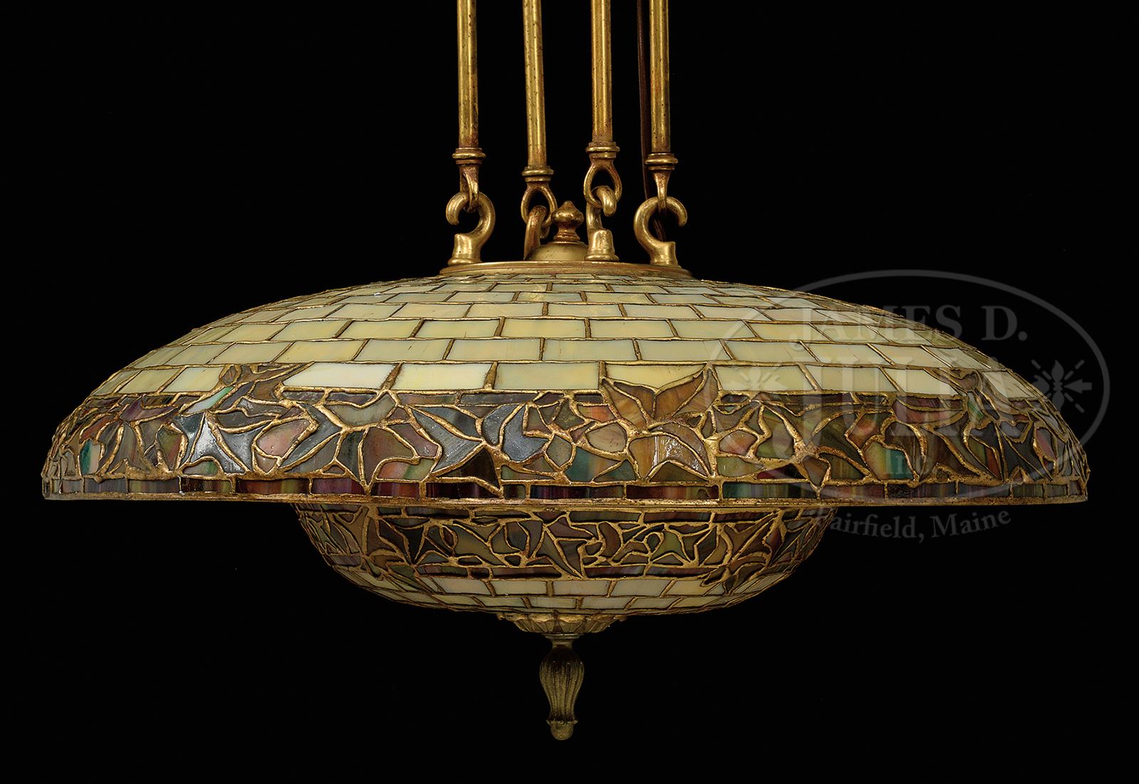 DUFFNER & KIMBERLY DOUBLE DOME CHANDELIER.Duffner & Kimberly chandelier has rare double dome construction. The domes are each made up of a geometric brickwork design of stippled caramel glass leading to a border oak leaf design in autumnal colors of rust, red, yellow and green. The chandelier is suspended on four solid decorative arms from a flat ceiling cap with cast brass tassel pendant. SIZE: Large dome is 26″ dia. Small dome is 14″ dia. CONDITION: Very good to excellent with little if any slumping evident. 50331-1 (10,000-15,000) – Lot 2317