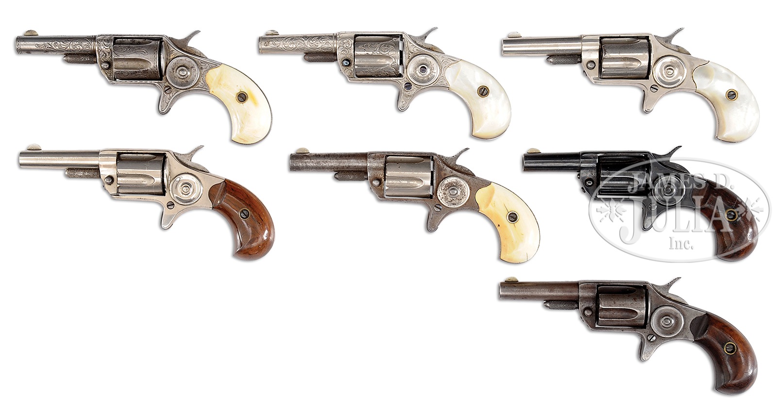 GROUP OF SEVEN COLT NEW LINE 30 CALIBER REVOLVERS.1) COLT NEW LINE. SN 5345. Cal. 30 RF. 2-1/4″ bbl with Hartford marking. Bbl, cyl and frame have open foliate scroll engraving with punch dot background. 5 shot long flute cyl. Full nickel finish. Orig 2-pc “certified antique elephant ivory” birdshead grips numbered to gun. PROVENANCE: The Dr. Robert G. Cox Estate Collection. CONDITION: Good. Frame retains 30% nickel with balance of gun faded to gray, showing small spots of light pitting. Very good grips. Cyl is not rotating when action is cycled. Dark bore with spots of pitting. IVORY 2) COLT NEW LINE. SN 1875. Cal. 30 RF. 2-1/4″ bbl with Hartford address. Bbl, frame and actin have full coverage foliate scroll engraving with punch dot background. Bottom of frame has inscription “Julia / Apr. 3, 1878”.5 shot long flute cyl. Full nickel finish. 2-pc birdshead pearl grips. PROVENANCE: The Dr. Robert G. Cox Estate Collection. CONDITION: Fine, retaining over 80% nickel. Very good grips. Stiff mechanics. Dark bore with small spots of pitting. 3) COLT NEW LINE. SN 9043. Cal. 30 RF. 2-1/4″ bbl with Hartford address and etched panel cal marking. 5 shot long flute cyl. Full nickel finish. 2-pc pearl birdshead grips. PROVENANCE: The Dr. Robert G. Cox Estate Collection. CONDITION: Fine. Over 90% nickel finish with weak etched panel marking. Cyl pin has flattened points on knurling. Grips show light wear. Good mechanics. Pitted bore. 4) COLT NEW LINE. SN 7439. Cal. 30 RF. 2-1/4″ bbl with Hartford address and etched panel cal marking. 5 shot long flute cyl. Full nickel finish. 2-pc rosewood birdshead grips. PROVENANCE: The Dr. Robert G. Cox Estate Collection. CONDITION: Fine. Over 90% nickel finish with weak etched panel marking. Cyl pin has flattened points on knurling. Grips show light wear. Good mechanics. Pitted bore. 5) COLT NEW LINE. SN 570. Cal. 30. 2-1/4″ bbl with Hartford address. 5 shot long flute cyl. Full nickel finish. Orig 2-pc birdshead “certifiable antique elephant ivory” grips numbered to gun. PROVENANCE: The Dr. Robert G. Cox Estate Collection. CONDITION: Fair. Bbl and frame retain small amounts of nickel finish, faded to gray, with light pitting. Cyl retains 90% nickel and may be replacement. Grips show slight age related shrinking with cracks on both sides. Cyl does not rotate when action cycled. Dark pitted bore. 6) COLT NEW LINE. SN 5601. Cal. 30 RF. 1-3/4″ bbl with Hartford address. 5 shot long flute cyl without knurled end on cyl pin. Orig 2-pc rosewood birdshead grips numbered to gun. PROVENANCE: The Dr. Robert G. Cox Estate Collection. CONDITION: Fair. Bbl, frame and cyl retain 95% bright polished reblued finish. Grips show moderate wear. Good mechanics. Pitted bore and chambers. 7) COLT NEW LINE. SN 8087. Cal. 30. 2-1/4″ bbl with Hartford address. 5 shot long flute cyl. 2-pc rosewood birdshead grips. PROVENANCE: The Dr. Robert G. Cox Estate Collection. CONDITION: Good. Metal finish has faded to gray. Grips show moderate wear. Good mechanics. Dark bore with spots of pitting. Special Note: This item(s) contains plant or animal properties that may be covered by the Endangered Species Act (ESA). We have taken care to ensure that this item(s) meets the standard for sale under the ESA. However, certain states and other countries have laws that are more restrictive than the ESA. It is the bidder’s responsibility to ensure that it is lawful to purchase or transport this item(s) into their state, and to obtain the necessary import and export approvals. Delay or failure to obtain any such permit or approval does not relieve the buyer of paying for the item(s) and consummating the purchase. 50582-14, 50582-15, 50582-17, 50582-18, 50582-20, 50582-74, 50582-75 (3,000-3,500) – Lot 2317 Click here to view provenance