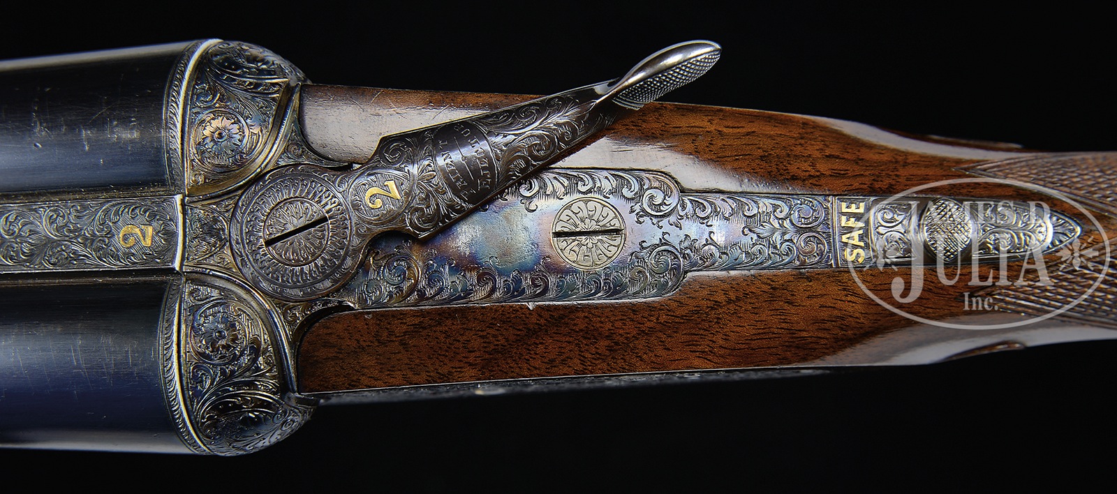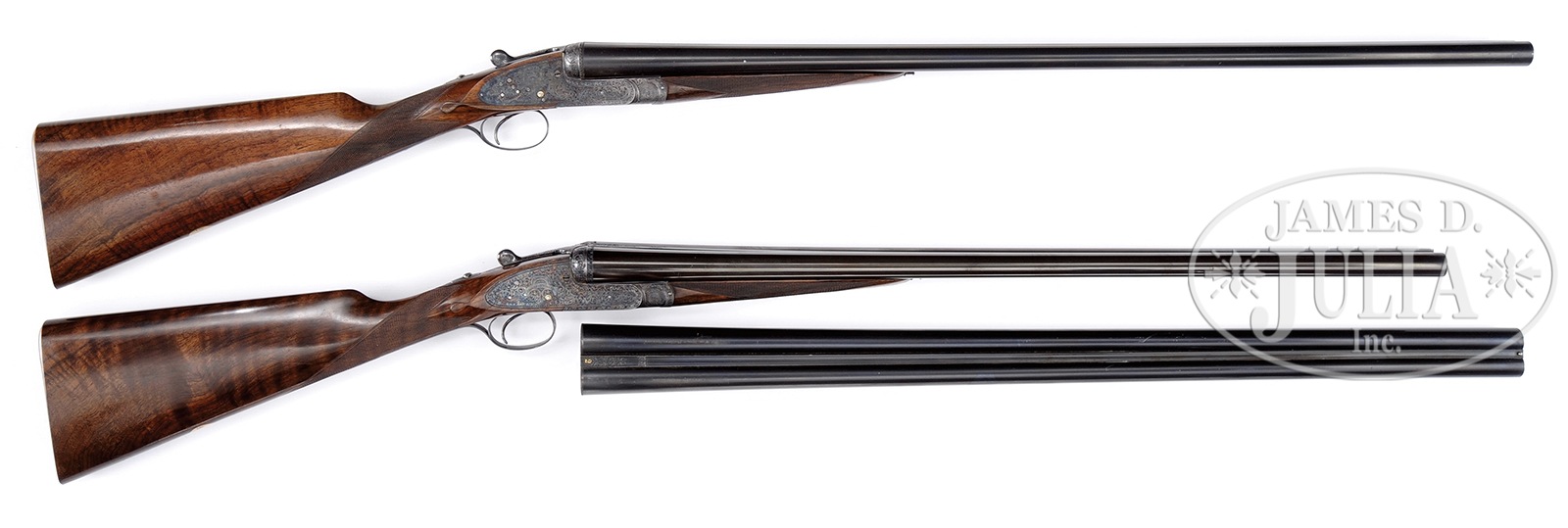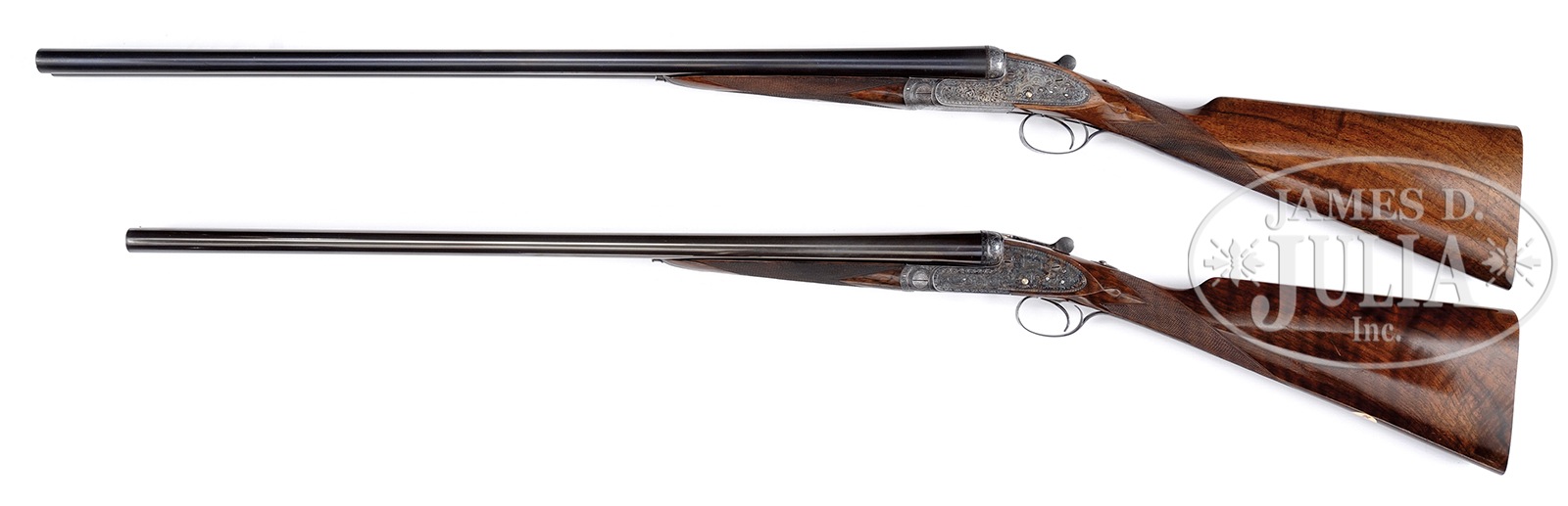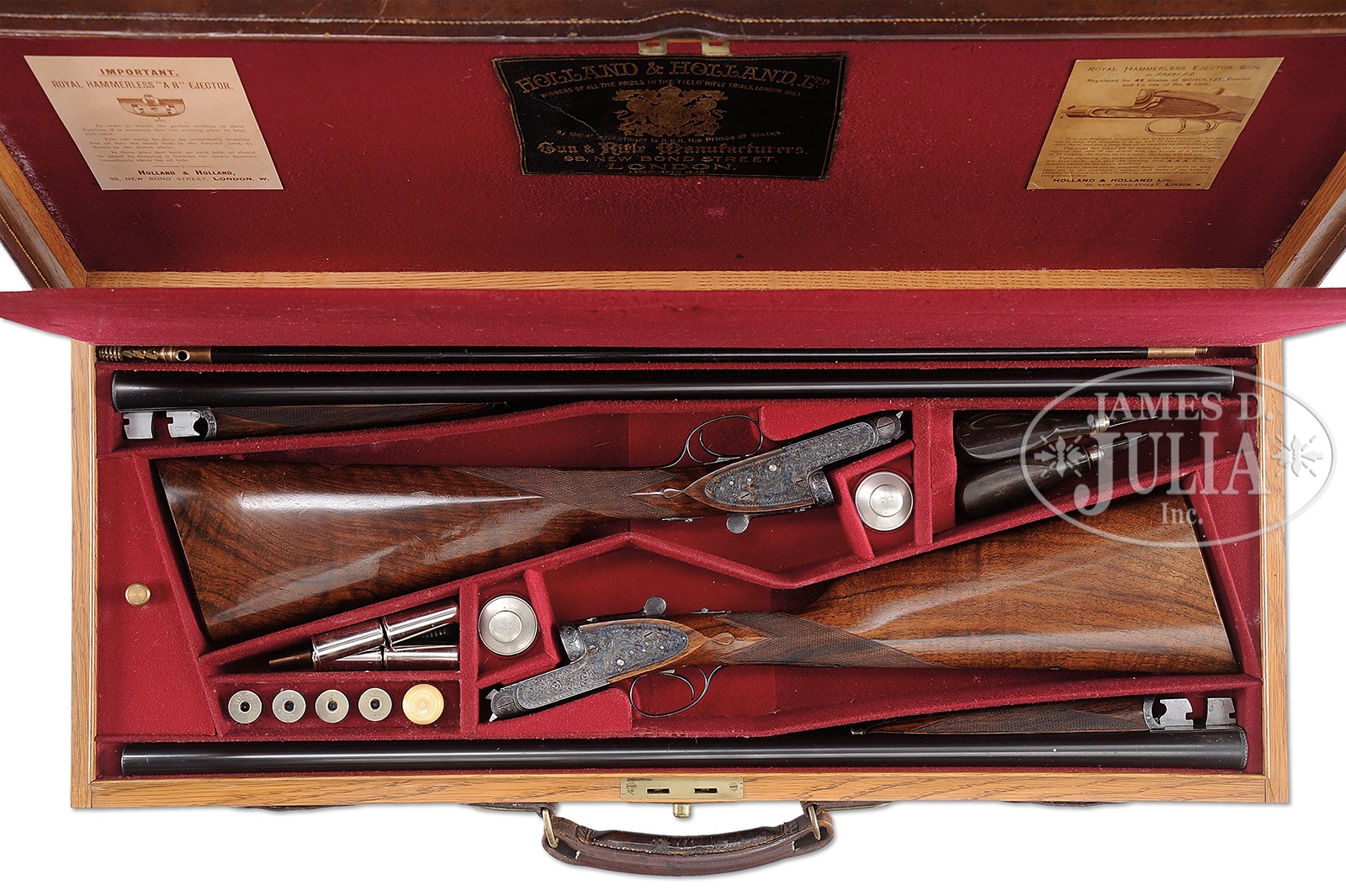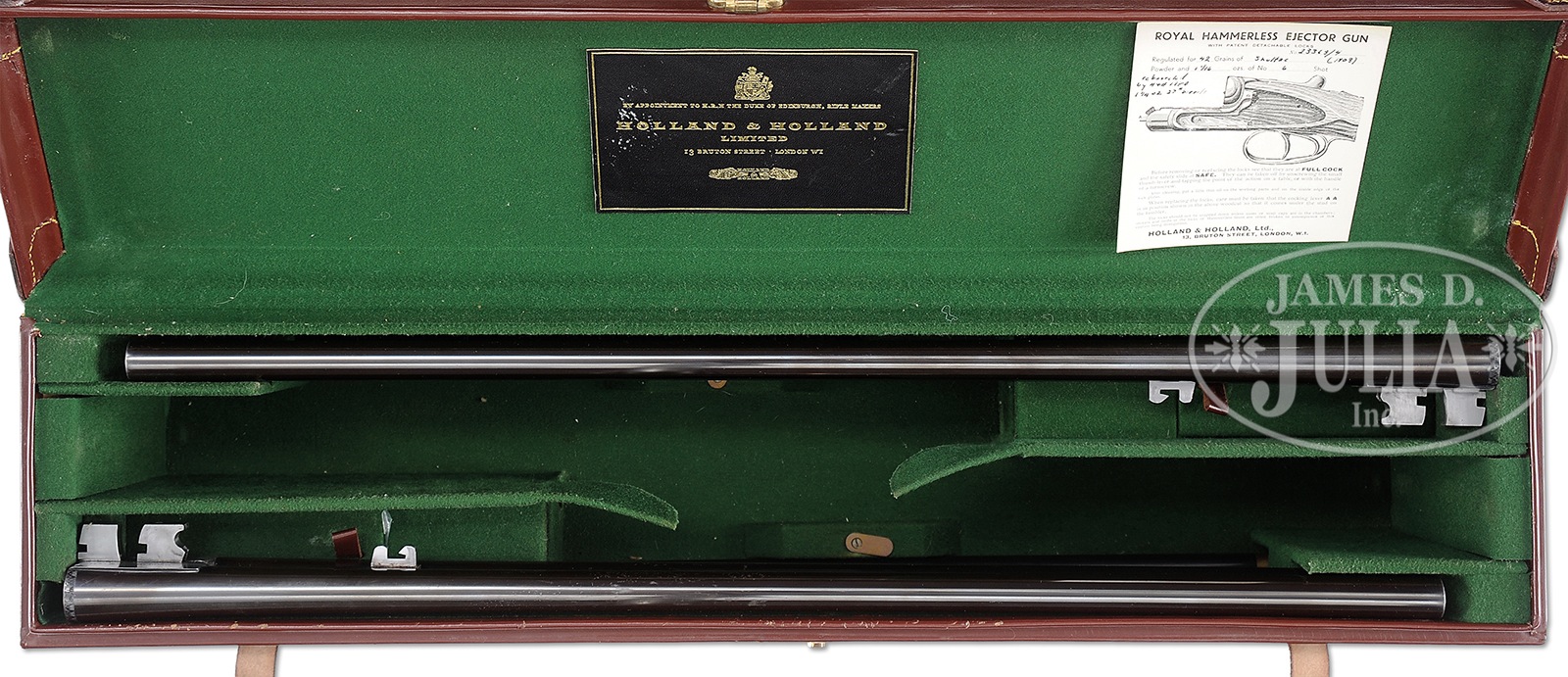 *VERY FINE PAIR OF HOLLAND & HOLLAND ROYAL HAMMERLESS EJECTOR SINGLE TRIGGER GAME GUNS WITH CASE, WITH NEW FACTORY EXTRA BARRELS AND REFURBISHING DONE IN 1980.SN 23364/23363. (1904) Cal. 12 ga. 30″ Orig dovetailed bbls have 2-1/2″ chambers, and are fitted with specially ordered sunken game ribs. They are engraved “Holland & Holland 98 New Bond Street, London.” on tops. The numbers “1” or “2” are gold inlaid on rear portions of ribs, and top levers, and are engraved on bosses for Anson releases on forend irons, as these guns are a true pair. Bbl flats are stamped with London black powder proofs for 2-1/2″ chambers (nitro proof was not mandatory until 1904). 27″ Bbls have matching ribs and top markings, but carry the “13 Button Street” address. Bbls are of dovetailed construction, and flats are marked with 1980 London nitro proofs for 2-3/4″ chambers. SNs are on each bbl set, and newer bbls are engraved “Griffin & Howe Inc New York NY” on bottoms of left bbls. Typical Royal sidelock actions are case hardened and feature automatic safeties (SAFE inlaid in gold), gold band tumbler end cocking indicators, and single non-selective triggers. They are somewhat unusual in that guns were never fitted with hand detachable locks. Actions and lockplates are engraved in typical Holland Royal house style with nicely cut varying sized open shaded scroll surrounding “Holland & Holland” in typical device on each lockplate. Bottoms of actions are engraved “Royal” “Hammerless” “Ejector”. Trigger plate is engraved “Patent” “Single Trigger”. Top levers are engraved “Patent” “Ejector”. Blued small bow trigger guards have SNs engraved on short tangs. Well matched, nicely fiddle figured and lightly streaked European walnut straight grip buttstocks measure 14-1/2″ over checkered wood butts, and feature typical checkering on diamond grips, drop points, and gold ovals on toe lines, one engraved “S. P. R.”, the other with this engraving mostly erased. Matching splinter forends featuring Holland’s “A.B” ejectors, have Anson releases. Gun no. “1”: 30″ BBLS: Bore diameter: left – .730, right -.730. Bore restrictions: left -.000 (cyl), right -.000 (cyl). Wall thickness: left -.026, right -.028. Drop at heel: 2-5/16″, drop at comb: 1-1/2″. Weight: 6 lbs. 8 oz. LOP: 14-1/2″. 27″ BBLS: Bore diameter: left – .734, right -.731. Bore restrictions: left -.027 (IMod), right -.013 (Lt Mod). Wall thickness: left -.018, right -.025. Drop at heel: 2-1/2″, drop at comb: 1-1/2″. Weight: 6 lbs. 4 oz. LOP: 14-1/2″. Gun no. “2” 30″ BBLS: Bore diameter: left – .731, right -.733. Bore restrictions: left -.008 (IC), right -.002 (Skeet). Wall thickness: left -.028, right -.021. Drop at heel: 2-9/16″, drop at comb: 1-1/2″. Weight: 6 lbs. 6 oz. LOP: 14-1/2″. 27″ BBLS: Bore diameter: left – .731, right -.728. Bore restrictions: left -.024 (IMod), right -.011 (Lt Mod). Wall thickness: left -.021, right -.025. Drop at heel: 2-9/16″, drop at comb: 1-1/2″. Weight: 6 lbs. 0 oz. LOP: 14-1/2″. Guns are fitted in an old oak and leather Holland & Holland two-gun case with brass corners and leather and canvas outer cover. Interior is lined in scarlet cloth, and lid has gold embossed black leather Holland label, along with “A.B” ejector label, and a charge card numbered for guns 23551 and 23552. Case has Hollands typical folding divider, and contains two H&H marked oil bottles, four relatively new H&H marked snap caps, along with four vintage H&H patented horn bodied snap caps, a bone striker bottle, and two H&H marked horn handled turnscrews. Also included is a 2-pc brass and ebony cleaning rod with short handle, with some brushes, horn striker block, and an old jar of “HOLLANDS” “ANTI-RUST”. New bbls are housed in brown leather two-gun motor case with stitched leather corners, lined in green cloth, with Holland black label and charge card, with notes “re-barreled by H&H in 1980”. Case contains a 2-pc black composition and brass cleaning rod, round H&H marked oil bottle, cleaning brushes, and a bench cloth. PROVENANCE: Weapons history for both guns from H & H, giving specifications and confirming 1980 re-barrel. Copies of orig ledger pages. Copy of Invoice for purchase of guns from H&H. Correspondence regarding same. Consignors notes. Lifelong Collection of Gentleman Collector Herbert Hyatt. CONDITION: Excellent, as refurbished, retaining over 95% of new finishes, applied at time of re-barreling and restocking, with action, beads, and fences slightly silvered, and some light marks in stock finishes. 30″ Bbls have some light marks and scratches. Wood of forends appears original, and have some factory repairs on sharp edges. New bbls are excellent, except one set has a considerable amount of flecking through blue from cleaned oxidation, where ones hand would normally be in front of forend. Bores are excellent. Actions are tight. Bbls are on face. Ejectors are strong and in time. Triggers work. Case leather is very fine, slightly darkened, and with some water staining, as protected by it orig outer cover, which is in good condition, but showing its age with some cracking and deterioration of leather edging. Straps are good. Case handle is fine. Interior cloth is very fine with some slight insect damage to divider. Cloth renewed in lid. Holland leather label is distorted, and has some cracking. Paper label is foxed. Interior partitions are fine, refurbished, some cloth not well matched as to color. Accessories are very fine. Motor case is excellent, with some rubs. Straps are very fine. Interior is excellent. 49896-16 MGM43 C&R (17,500-27,500) – Lot 2318 Click here to view provenance