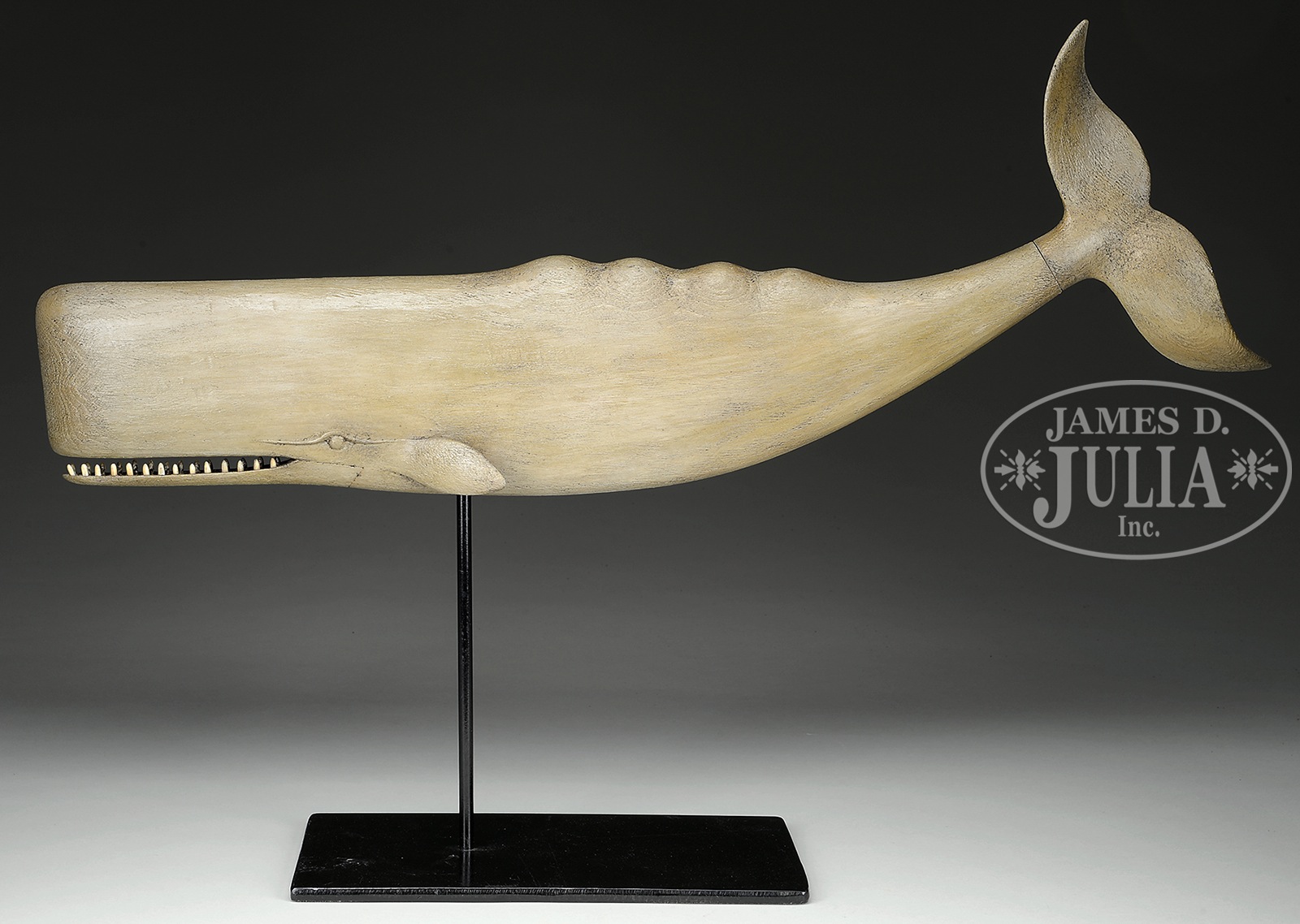 CARVED SPERM WHALE WEATHERVANE.20th century, New England. The folk art rendition of a sperm whale with prominent teeth. The shaped fluked tail designed to pivot in the wind. All in tan paint. Mounting rod absent. Mounted on a museum stand. SIZE: 31″ l. CONDITION: Very good. 9-94116 (1,200-1,800) – Lot 2320