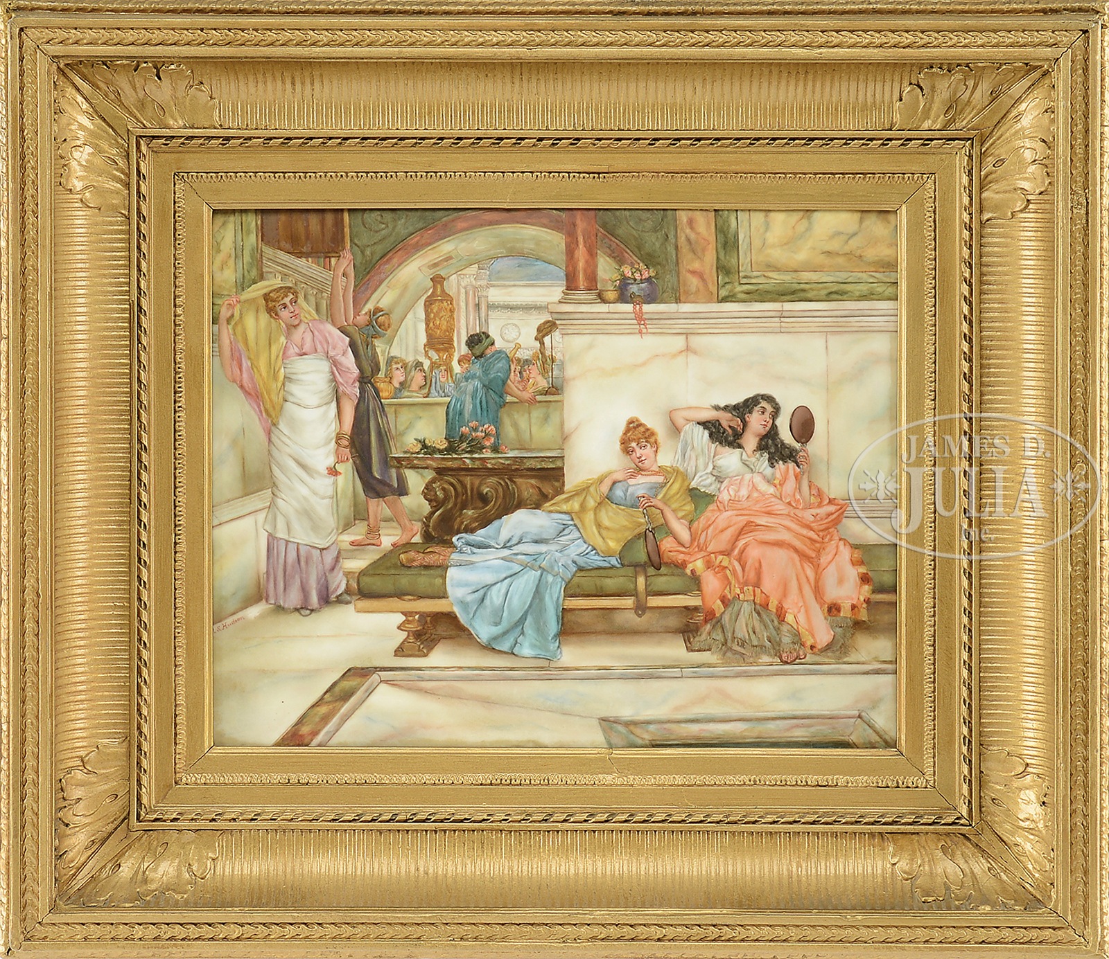 FINE LARGE BERLIN PORCELAIN PLAQUE SIGNED “M.S. HUDSON”.The scene of four women in a Turkish bath type setting with other figures in background, signed left “M.S. Hudson”. Housed in a gold painted antique frame. SIZE: 13″ X 16-1/4″ Overall: 22″ x 25″ CONDITION: Very good. 7-74896 (800-1,200) – Lot 2320