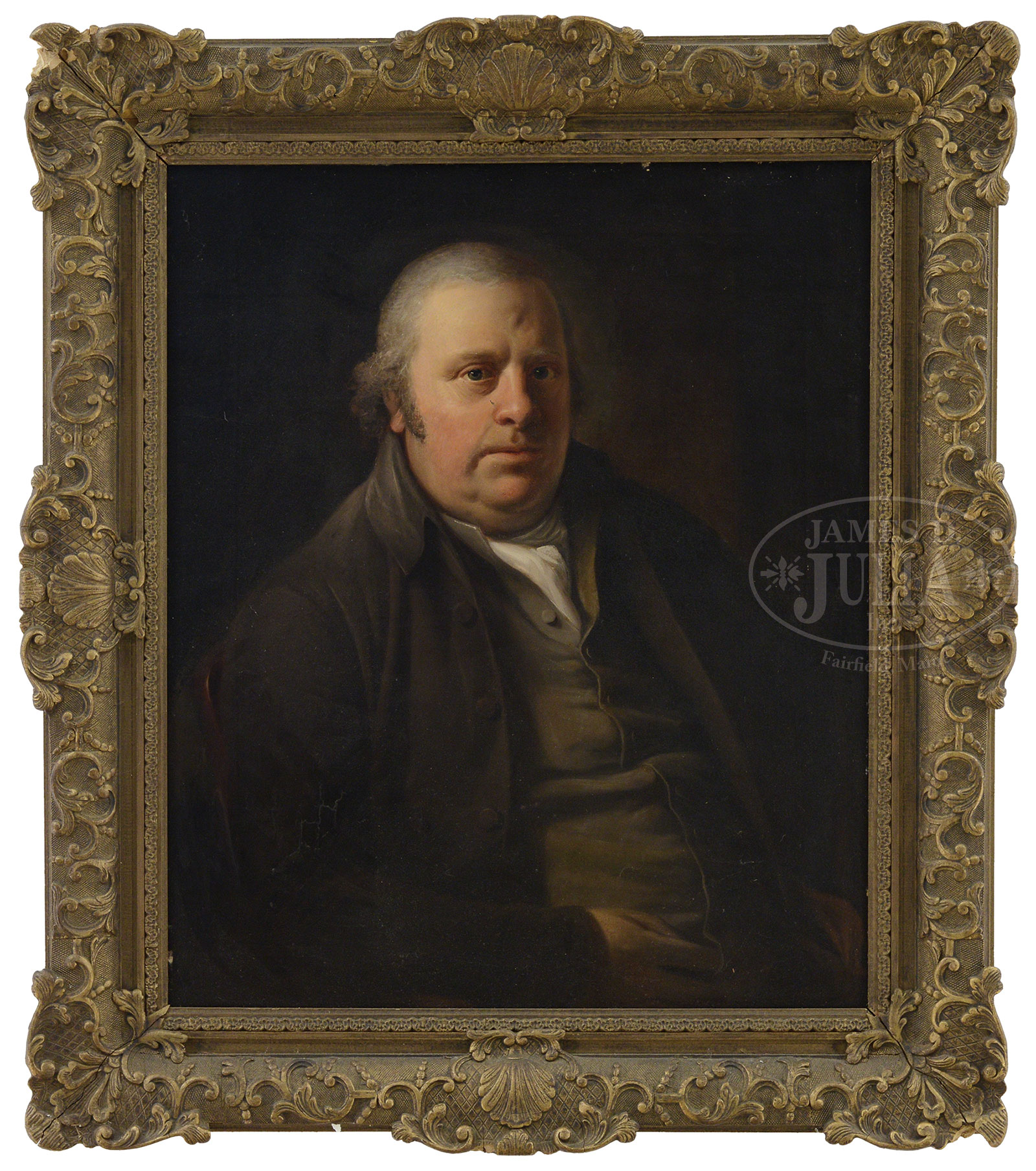 Oil on canvas depicts a half portrait of a seated man with thinning gray hair, bushy sideburns, wearing a brown coat & vest. Signed with an indiscernible monogram under which is “1799” approx. 8″ from bottom left corner. Housed in a later antique gesso decorated gilt frame with corner loss. SIZE: 30″ x 25″. Overall: 38″ x 33″. CONDITION: Old restoration, wax lined, good. 52099-48 (1,000-1,200) – Lot 2320
