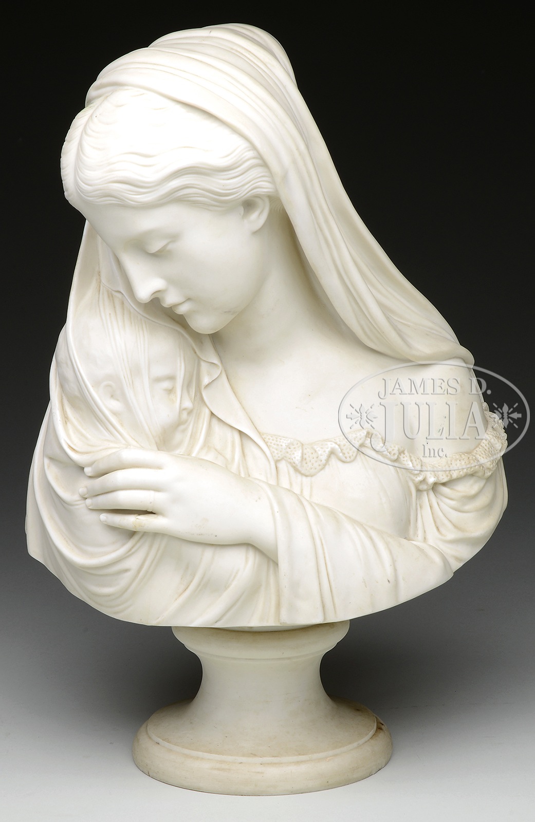 COPELAND PARIAN BUST OF MOTHER AND CHILD.Late 19th century. England. Bearing an incised artist signature “R. Monty – 1871” an impressed mark “Ceramic and Crystal Palace Art Union, Copeland…N”. Molded in 2 pieces and attached with bolt. SIZE: 14-3/4″ t. CONDITION: Minor chip on top of base, re-glued chip in back of drape, and small chip in back of bust. 9-96451 (200-300) – Lot 2325
