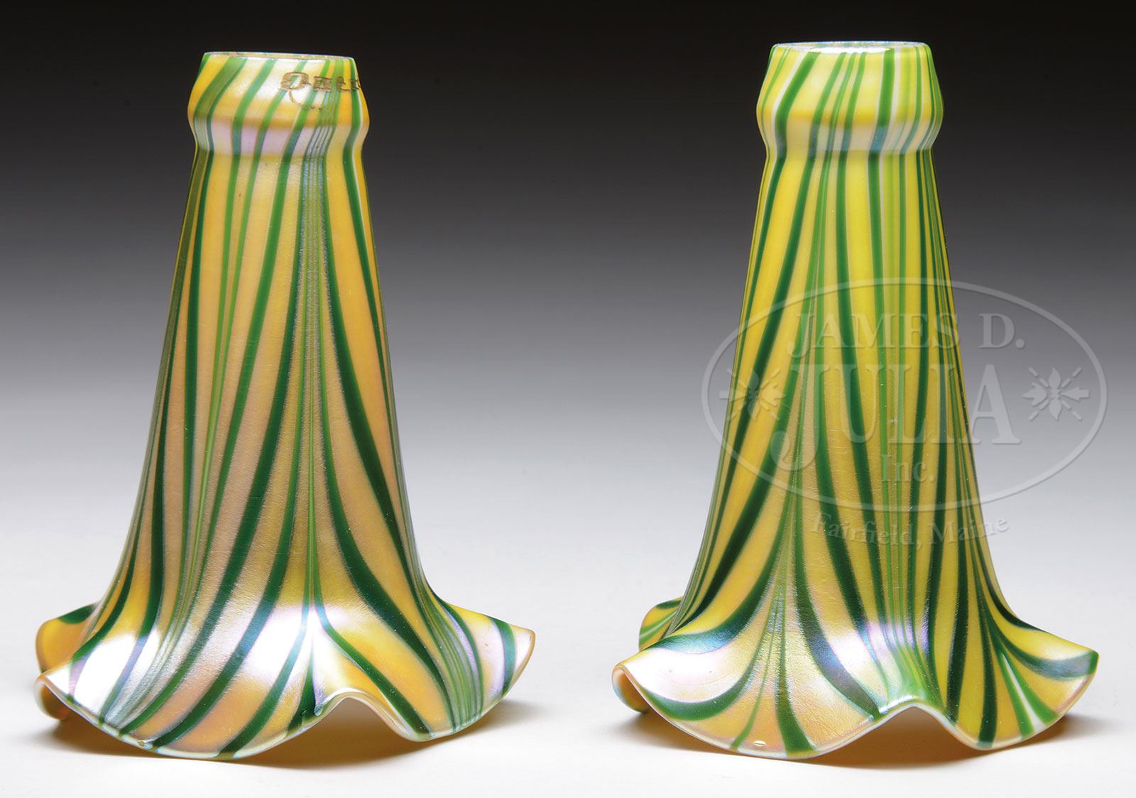 PAIR OF QUEZAL LILY SHADES.Pair of Quezal lily shades have green pulled design against a gold iridescent background with bright gold iridescent interiors. Each is signed on the fitter “Quezal”. SIZE: 4-3/4″ t. CONDITION: Very good to excellent. 5-60017, 6-60018 (600-900) – Lot 2326