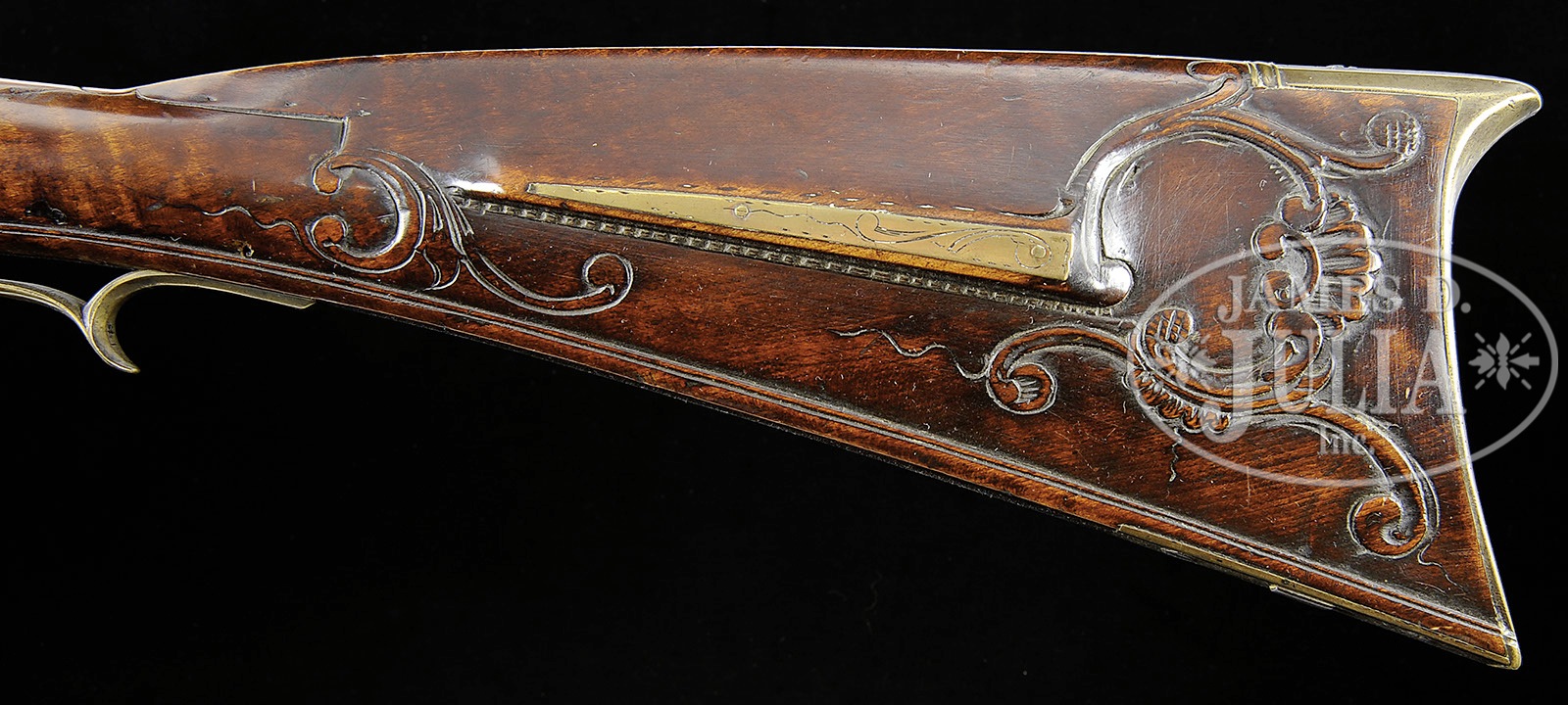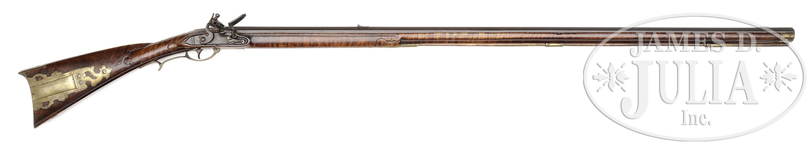 AWARD WINNING 18th CENTURY RELIEF CARVED DAUPHIN COUNTY PETER BERRY KENTUCKY RIFLE.SN NSN. 44-1/4″ full oct .45 Cal rifled bbl signed “P Berry”. Overall 61″, butt is 4-3/4″ x 1-1/2″. 4-pc brass engraved patchbox has 3 piercings and is very similar to the Peter Berry pictured on plate number 112 in Kindig’s Thoughts on the Kentucky Rifle in it’s Golden Age. Brass sideplate is also similar to rifle number 112. Brass 4″ triangular engraved inlay is inlet to the face of cheekpiece. Curly maple stock is wonderfully relief carved behind cheekpiece with very deep rococo carving that appears even finer than the rifles pictured in Kindig’s book. Some relief carving forward of cheekpiece and patchbox, and around bbl tang. Deep incised carving around rear ramrod pipe. Hand forged German lock is unmarked and release for patchbox is a rectangular button in the 3-1/2″ buttplate. Forend has nice paneled molding running along the ramrod channel to nosecap. This gun was awarded the Kentucky Rifle Association’s Silver Metal as on of the best five on display at their 1965 annual meeting. Peter Berry is listed as a gunsmith in the tax records of Dauphin County in the years 1786-1789. Peter Berry died in 1795 so all his guns were made before the end of the 18th century. Peter Berry carved beautiful designs of “C” scrolls in high relief and no two of his guns are carved exactly alike. This gun is pictured on p. 55 plate no.48 of Henry Kauffman’s book, The Pennsylvania Kentucky Rifle while in the Collection of Herman Dean. PROVENANCE: Ex Herman Dean Collection. Frank Sujansky Collection. CONDITION: Fine. Bbl has been shortened approximately 3″ from rear. 3-1/2″ wood sliver repair along right hand side of forend 25″ back from muzzle. Wood replacement around tail of flintlock. Small square of wood inlet to rear of tang carving where a screw had been placed to stabilize an old, in-period wrist break. 4-49419 RG104 (30,000-65,000) – Lot 2328