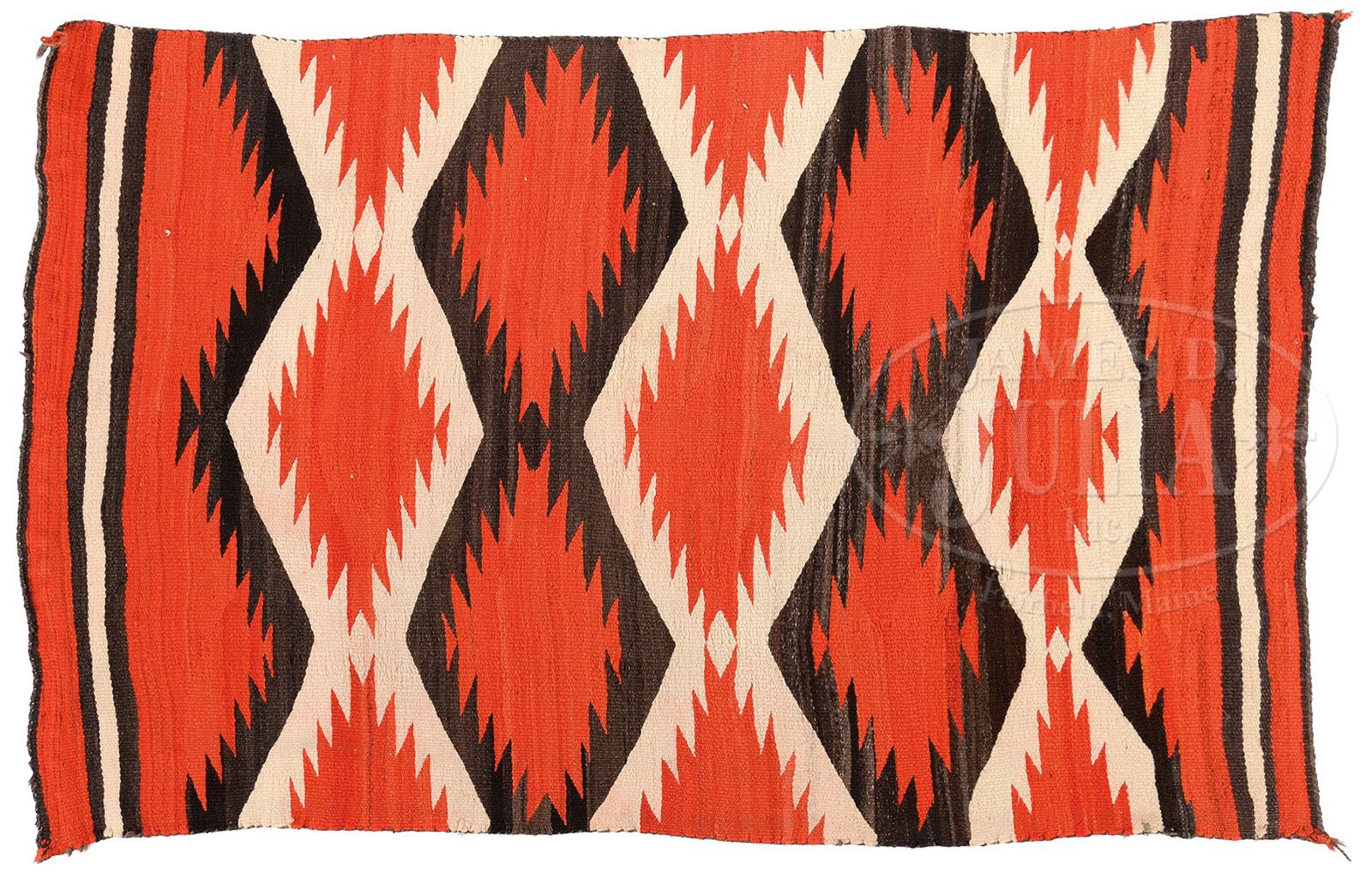 NAVAJO TRANSITIONAL STYLE WEAVING. Circa 1900, large red serrated edge diamond design in red, brown and white, soft home spun wool. SIZE: 42″ W x 64″ L. CONDITION: One small hole, some broken selvage threads on edge, two velcro strips attached to edge for hanging. 7-70424 (600-800)