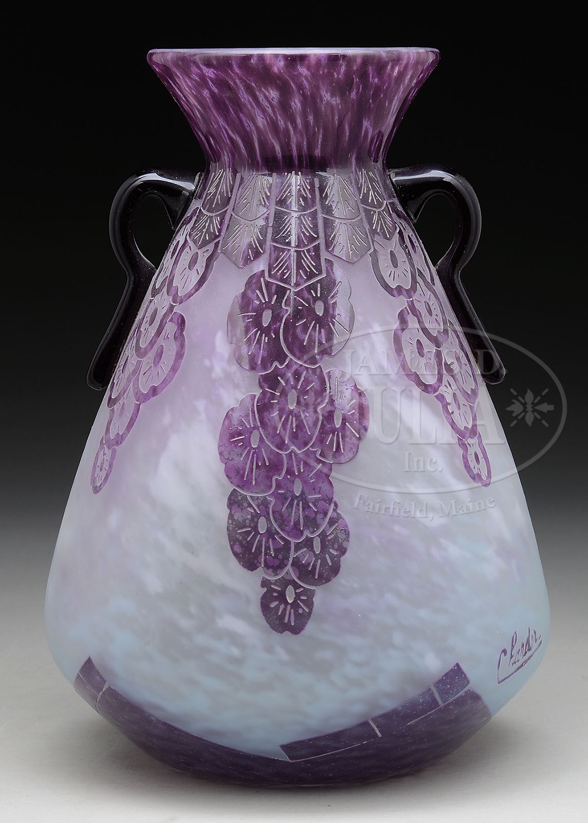 LE VERRE FRANCAIS CAMEO LAVANDE VASE.Le Verre Francais cameo vase in the Lavande pattern has an acid-textured background of mottled white, pale blue and light purple, overlaid with dark purple acid-cut stylized lavender blossoms and leaves, and is further decorated with two violet applied handles. Vase is signed in cameo “Charder” on side, and in script at the foot “Le Verre Francais”. Similar examples are found in the reference book Charles Schneider by Joulin/Maier, pg 127 & 174. SIZE: 10″ t. CONDITION: Very good to excellent, minor scuffing on the underside from normal use. 50250-1 (1,500-2,500) – Lot 2329
