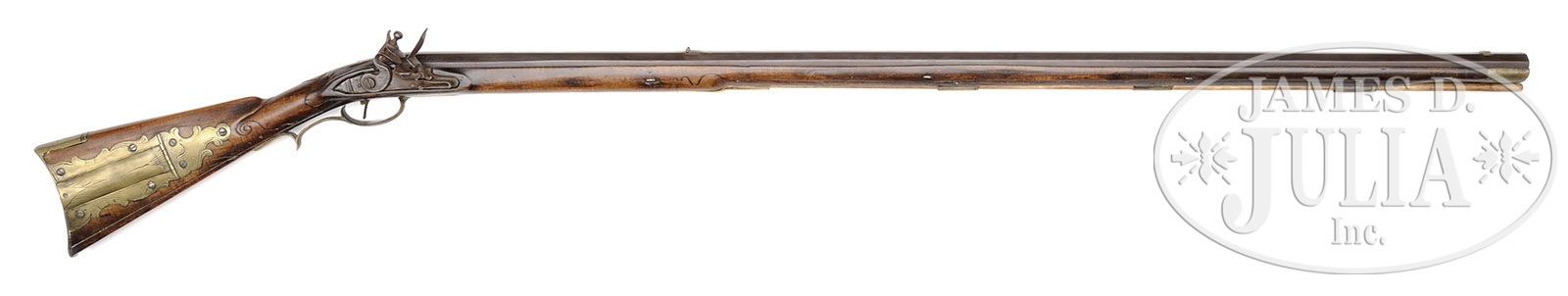 RELIEF AND INCISED CARVED KENTUCKY RIFLE ATTRIBUTED TO LITITZ, PA GUNSMITH ANDREAS ALBRECHT.SN NSN. 45″ full oct unsigned 52 Cal. smooth bbl held to stock by 4 bbl wedges. Overall 60-3/8″, butt is 5″ x 1-7/8″. 4-piece engraved brass patchbox. Maple stock shows very little curl and is relief carved behind cheekpiece and around bbl tang. Carving behind cheekpiece is nearly identical to that found on one of the only signed Andreas Albrecht rifles. Heavy beveled brass sideplate is characteristic of Lititz area. Andreas Albrecht was born in 1718 in central Germany. He sailed to America from London in 1749 and traveled to the Moravian town of Bethlehem in eastern PA that same year where he took over the Christians Springs Gunshop from 1752 to 1766. In 1770-71 Albrecht left Bethlehem for the Moravian town of Lititz to resume his gunmaking trade on a full time basis where he continued to work as a gunsmith until his death in 1802. PROVENANCE: Collection of Dr. Douglas Sirkin. CONDITION: Overall very solid orig condition with sharp and distinct relief carving. 13″ from muzzle of forend wood has been replaced. Lock may be a reconversion. 4-49941 RG8 (28,000-40,000) – Lot 2330