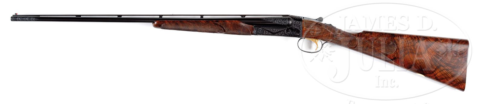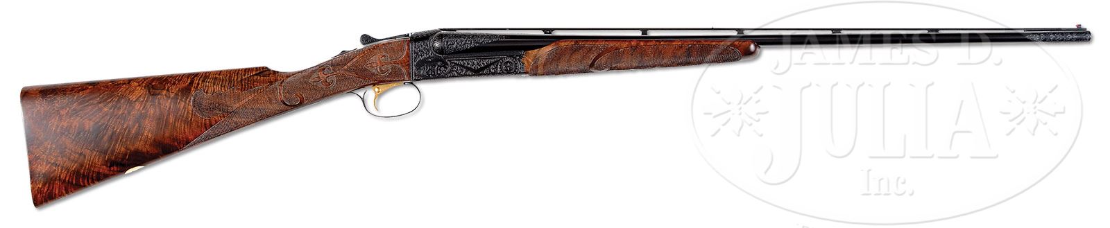 *UNIQUE .410 WINCHESTER MODEL 21 “PIGEON GRADE” – A GUN OF MANY FIRSTS.SN W34004. Cal. .410. 3″ Chambers. 26″ ventilated rib bbls, are choked Full and Full. Milled out portion of rib is engraved “CUSTOM BUILT WINCHESTER”. There are 2-3/4″ triangles of medium scroll at breech ends, and special order 2-3/4″ triangles at muzzles. Flat sided action featuring skeletonized engine turned water table, non-automatic safety, and gold-plated single selective trigger is engraved in “21-6” style (by Howard Dove, per factory letter, which also states “this particular gun was unique in many ways. Not only was it the first .410 bore made by U.S. Repeating Arms, other than .410 in the 3-gauge sets, it is also the first .410 bore Pigeon grade made by U.S. Repeating Arms and the first Model 21 with a shot shell head on the top lever and horse and rider on the trigger plate. Another feature unique on this gun, is that our engraver, Howard Dove, substituted a pigeon on the guard bow in place of where a dog’s head would be and also engraved the words “Pigeon Grade” on that guard bow. A further unique feature which is normally found on Grand Americans, and not simply on Pigeons, is the 21-B style of carving.”). Engraving is of medium scroll outlining dogs on sides of action; a setter on left and pointing pointer on right. Trigger plate is special order engraved with Winchester horse and rider. Trigger guard bow has standing pigeon, and “PIGEON GRADE” is engraved on trigger guard tang. Top lever pivot has facsimile of shot shell head engraved “410 GA WINCHESTER”. Exceptional dark feather crotch figured “full fancy” American walnut straight grip buttstock measures 14-1/4″ over checkered wood butt. Stock is checkered and carved in “21-B” style. A vacant gold oval is on toe line. Matching beavertail forend has black wood inset tip, and engine turned internals. Drop at heel: 2-1/4″. Drop at comb: 1-1/2″. Weight: 7 lbs. 0 oz. LOP: 14-1/4″. Red and white Winchester box has correct end label. PROVENANCE: Order sheet. Factory letters stating that this gun no. W34004 was used on both 1987 and 1988 catalog rear covers. 1988 Winchester catalog where this gun is pictured and featured under “Custom Made”. The Bill Phifer Collection. CONDITION: Essentially as new. Does not appear to have ever been assembled since factory proof and pattern firing (before assembly here for display and photographic purposes). It is difficult to find even the tiniest flaw in wood or metal finishes. Box is very slightly soiled. Label is excellent. 4-51826 MGM164 (30,000-50,000) – Lot 2330 Click here to view provenance