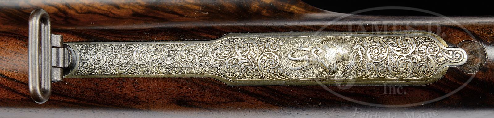 *EXCEPTIONALLY FINE DEEP CHISEL ENGRAVED F. A. SOMMER DUAL CALIBER OVER-UNDER SIDELOCK EJECTOR DOUBLE RIFLE WITH SWAROVSKI SCOPE.SN 24790. Cal. 6.5 x 65R and 9.3 x 74R. 23-5/8″ Mono-bloc bbls are fitted with scroll engraved quarter rib with “F A Sommer – Austria” at central portion. Rib is fitted with one standing leaf rear sight, and claw mount bases. Matching front sight ramp is fitted with bronze sourdough bead. A sling loop is soldered to bottom bbl. Bbl flats are stamped with Ferlach nitro proofs and calibers. Coin finished O-U sidelock action has beautifully sculpted fence with mustache side bolsters, and features non-automatic safety (S gold inlaid), raised rib tumbler end cocking indicators, and double triggers (both set). Action is engraved with well cut and shaded large scroll at nearly full coverage, which surrounds deep chiseled side-on view of roe buck in woodlands on bottom. Locks are also deep chisel engraved with game scene which spills over onto sides of action; left lockplate depicts bellowing stag with three interested hinds looking on. Right lockplate depicts a sounder of hogs running through open forest. Stag scene is signed “Runtas” (?) at bottom. Blued top lever has thumbpiece pierced depicting a large horned mountain goat. Blued trigger guard is scroll engraved. Steel grip cap depicts a mouflon sheep. Beautifully marbled and well figured exhibition quality European walnut capped pistol grip buttstock measures 14-9/16″ over black rifle pad, and features slightly hog-backed comb, sculpted and fluted Tyrolean right hand cheekpiece, chinstrap transition from grip to butt, point pattern checkering with line borders at grip, and a cartridge trap engraved with a chamois which is held in place by a sling loop on toe line. Matching 3-pc schnabeled ejector forend has Deeley release. Rifle is fitted with Swarovski 3-9X Habicht scope with three heavy post and crosshair reticle in claw mounts engraved to match rifle. Drop at heel: approx 2-5/8″, drop at comb: approx 1-1/2″. Weight without scope: 7 lbs 8 oz. LOP: 14-9/16″. PROVENANCE: George Reeb Collection. CONDITION: Excellent, essentially as new, appears unfired since proof, with only a few light handling marks in all of its fine factory finishes, with a tiny chip missing from schnabeled tip of forend. Mechanically crisp. 4-53722 (20,000-30,000) – Lot 2331