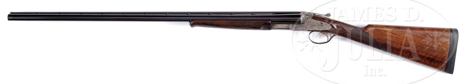 *L. C. SMITH ALL OPTION SPECIALTY GRADE TRAP.SN RE84644. Cal. 12 GA 2-3/4” Chambers. 32” Bbls fitted with raised, ventilated rib are marked “L. C. SMITH Specialty GRADE” and “HUNTER ARMS CO INC M’F’R’S FULTON, N.Y., U.S.A.” on tops. There are sprays of scroll engraving at breech ends. Bbl flats are stamped with SN and grade. Bbls are fitted with reinforced splinter. Typical standard weight case hardened action with no safety, is fitted with Hunter “ONE TRIGGER”. Action and lockplates are engraved in “Specialty” style with spray of large shaded scroll surrounding game birds on lockplates; a pair of quail in grass on left, and a duck flying over marsh on right. “L. C. SMITH” is in Old English script at the front of each lockplate. Nicely fiddle figured American walnut straight grip buttstock measures 14-1/8” over black solid pad. Point pattern checkering with line borders wraps over top of grip. Matching short beavertail ejector forend with reinforcing bolt, has typical J-spring release with knurled button secondary in guitar shaped escutcheon. Bore diameter: left -.730, right -.729. Bore restrictions: left -.037 (full), right -.035 (full). Wall thickness: left -.032, right -.032. Drop at heel: 1-15/16″, drop at comb: 1-7/16″. Weight: 8 lbs 8 oz. LOP: 14-1/8″. PROVENANCE: Factory letter confirming specifications. The William Smith Collection. Special Note: This item contains or is made of ivory. Do not bid on this lot unless you have read and agreed to our "Ivory Position Statement" and the "Waiver of Legal and Financial Risk to James D. Julia in regards to your Purchase of an Ivory Object." This information is located in the front section of our catalog. CONDITION: Fine, as partially refinished. Bbls retain essentially all of a dark satin re-blue. Action and lockplates retain approx. 30 – 40% of their orig case hardening color, balance a bright silver with small spots of oxidation. Stocks retain most of what appears to be orig finish considerably worn, with a few marks and some loss at butt with installation of new pad, checkering considerably worn. There are cracks behind both lockplates, as well as two 1” old cracks on right side of forend. Bores are excellent. Action is tight. Ejectors are slightly out of time. Trigger works. Twin beads are “certifiable pre-ban ivory”. 49312-65 MGM212 IVORY (4,500-6,500) – Lot 2331