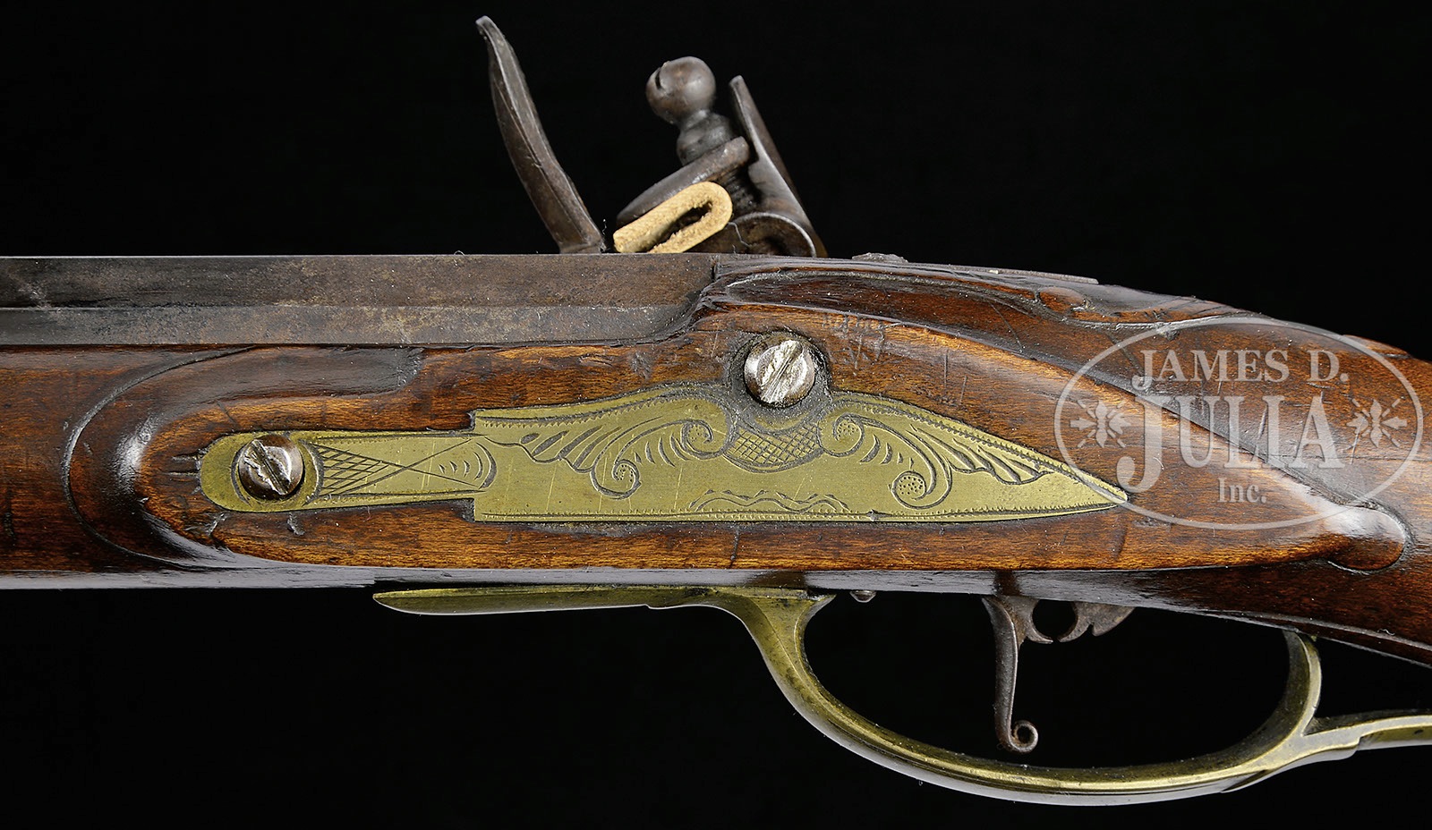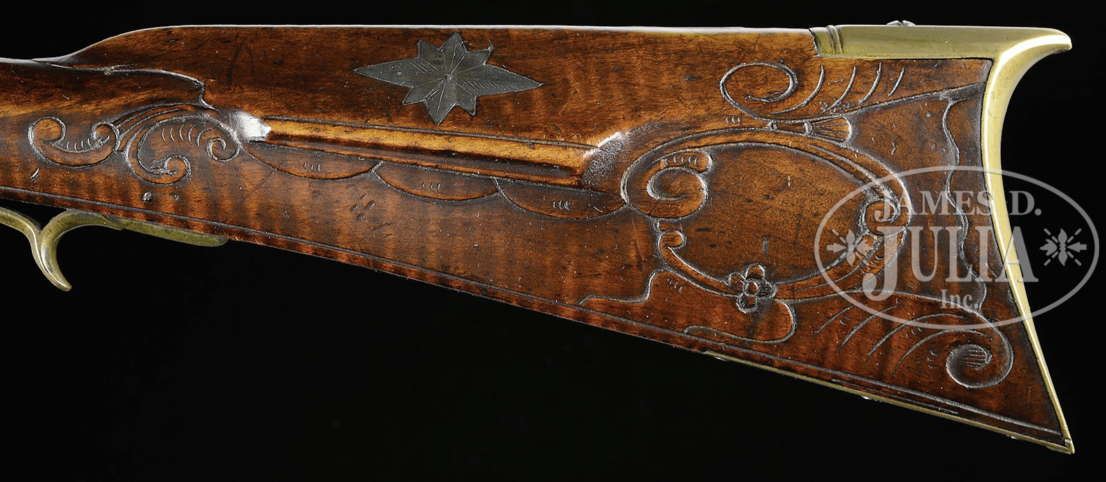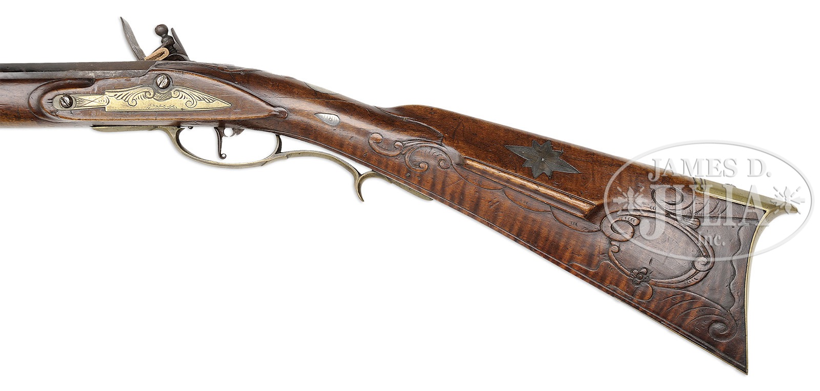 RELIEF CARVED FLINTLOCK KENTUCKY RIFLE ATTRIBUTED TO THE LITTLESTOWN GUNSMITH FREDERICK SELL.Cal. 50. 60″ overall with 44″ full oct unmarked bbl. Bbl is fastened to the stock with 3 bbl wedges. Buttplate is 4-1/2″ high x 1-1/2″ wide. Brass 4-pc engraved patchbox with 5 piercings. The lid is released by pushing toward the butt what appears to be the upper segment of the hinge that overlaps the upper patchbox plate. There is one detail Frederick Sell used quite frequently on the lids of his patchbox, and to some extent it identifies his work even though no two are exactly alike. In about the center of the lid, he often engraved a C-scroll with various details flowing off each end, in this case two engraved 4-petal flowers similar to the 4-petal flower in the cheekpiece carving. Frederick Sell was a maker of quality patchboxes of widely varied design. The cheek side of the butt is profusely relief carved with C-scrolls and a 4-petal flower behind the cheek piece and small C-scrolls forward of the cheekpiece. There is an 8 pointed engraved silver star inlaid on the cheek piece and 3 relief carved semi circles under the cheekpiece. Sells characteristic relief carving extends around the comb and forward of the patchbox. The bbl tang area and the rear ramrod entrance pipe area are nicely relief carved. The curly maple stock has a silver thumb piece inlay and two silver tear drop inlays, one on each side of the wrist. The unmarked flintlock appears to have been reconverted. Brass sideplate is nicely engraved and is characteristic of the “Littlestown School”. Brass trigger guard is identical to the one pictured on page 407 of Kindig’s Thoughts On The Kentucky Rifle In Its Golden Age. Kindig considered Frederick Sell to be one of the great masters of Kentucky Rifle making. Frederick Sell is recorded as a gunsmith in York, PA in 1807, and in 1816 he purchased property in Littlestown. Frederick Sell is noted for his nicely scrolled triggers with a pierced detail to the rear, as found on this gun. Kindig writes he studied twenty-four Frederick Sell guns of which only six were signed. Accompanied by a notarized statement from the consignor indicating the firearm was purchased from the Joe Kindig collection in the 1960s. CONDITION: Very good. There is a 3″ age crack from the nosecap back on the right hand side and the flintlock has been reconverted. The stock was broken at wrist and repaired in period. The remainder of the rifle is in very good condition throughout with all nicely figured relief carving. 4-50167 RG103 (18,000-30,000) – Lot 2333