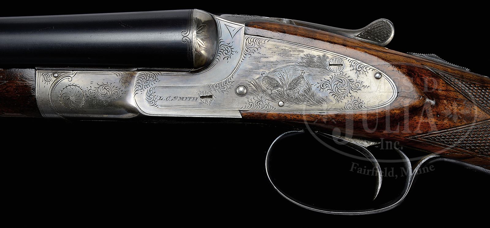 *SCARCE 20 GAUGE L. C. SMITH 3E GRADE WITH SINGLE TRIGGER AND STRAIGHT GRIP.SN 6133E. Cal.20 GA This unusual pre 1913 gun with only 149 made in this gauge, has 30” bbls marked with “HUNTER ARMS COMPANY” and “FULTON, NEW YORK” on rib extension. Bbl flats are stamped with SN and grade. Small featherweight case hardened action features non-automatic safety and Hunter’s selective “ONE TRIGGER”. Action and lockplates are engraved with sprays of scroll within line borders surrounding game scenes without ovals, with pairs of quail on both sides. “L. C. SMITH” is engraved at the front of each lockplate. Nicely fiddle figured European walnut straight grip buttstock measures 13-3/4” over brown open sided Pachmayr white line pad. Matching splinter ejector forend has inlet ebony tip, J-spring release, and secondary latch in guitar shaped escutcheon. Bore diameter: left -.613, right -.612. Bore restrictions: left -.023 (IMod), right -.021 (Mod). Wall thickness: left -.033, right -.032. Drop at heel: 2″, drop at comb: 1-1/2″. Weight: 6 lbs 9 oz. LOP: 13-3/4″. Special Note: This item contains or is made of ivory. Do not bid on this lot unless you have read and agreed to our "Ivory Position Statement" and the "Waiver of Legal and Financial Risk to James D. Julia in regards to your Purchase of an Ivory Object." This information is located in the front section of our catalog. CONDITION: Fine. Bbls retain over 80% of what appears to be orig blue, with light silvering of sharp edges, and thinning overall. Action and lockplates retain 40 – 60% orig case hardening color, strong where protected, balance a hand worn bright silver. Stocks retain most of an old varnish refinish, which has some chipping around checkering and newer pad, checkering somewhat worn and grimy. There is a slight hairline crack behind left lockplate. Bores are excellent. Action is tight. Ejectors are in time. Trigger works. A fine handling scarce L. C. Smith. “Certifiable pre-ban ivory” bead sights. 49417-12 MGM209 IVORY (4,000-6,000) – Lot 2333