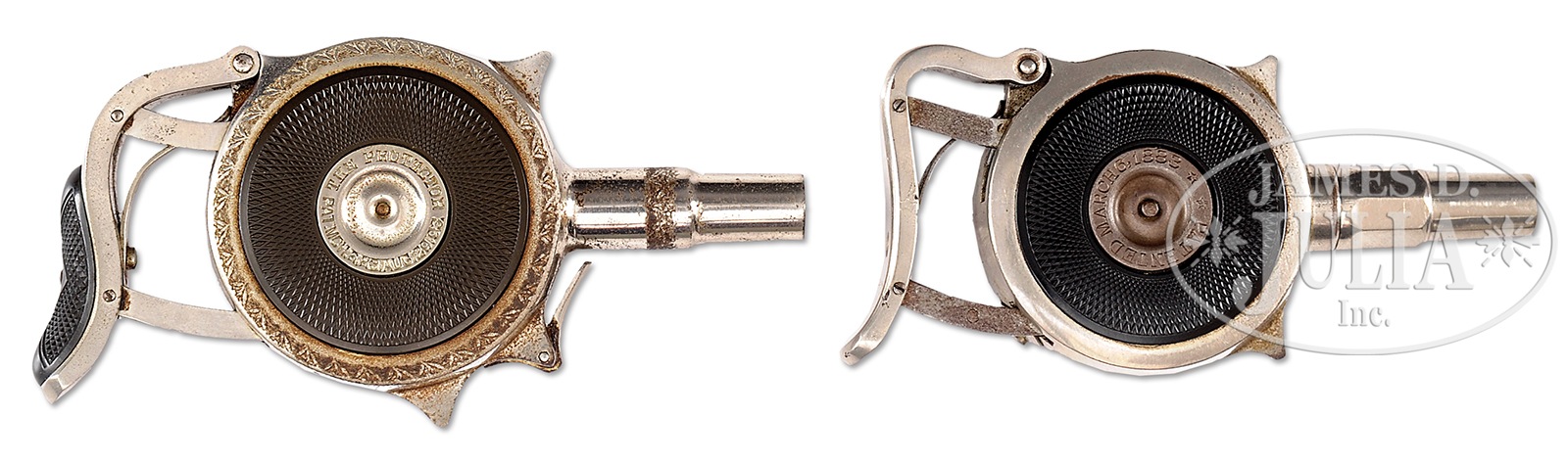 PRIME LOT OF TWO PALM PISTOLS BY CHICAGO ARMS & CHICAGO FIREARMS.SN 3234/750. 1) Cal. 32 XSRF. Chicago Firearms Co., Chicago, IL, Protector Palm Pistol. 7-shot squeezer fired. Nickel finish with hard rubber grips and palm plate. Manufactured in the early 1890’s with a total production estimated at 12,800. 2) Cal. 32 XSRF. Minneapolis Firearms Co. Squeezer Palm Pistol known as The Protector according to Flayderman’s Guide to Antique American Firearms and Their Values. Production was estimated at 3000 total and were actually manufactured by James Duckworth Co. of Springfield, Mass. 7-shot capacity with 1-3/4″ bbl, nickel finish exterior with hard rubber grip panels. Squeezer type pistols have always intrigued arms collectors as they are curious and ingenious and a piece of mechanical art. CONDITION: Item 1. Very good overall, with most all nickel finish remaining with slight finish loss on edges at point of engraving but should clean up. Action, bore and magazine all function correctly. Item 2. Full nickel coverage with excellent hard rubber grip panels and appear to have no finish loss except in very high points. Bore and magazine are very fine, however, mechanics work intermittently. 51030-11 TDW (2,500-4,500) – Lot 2333