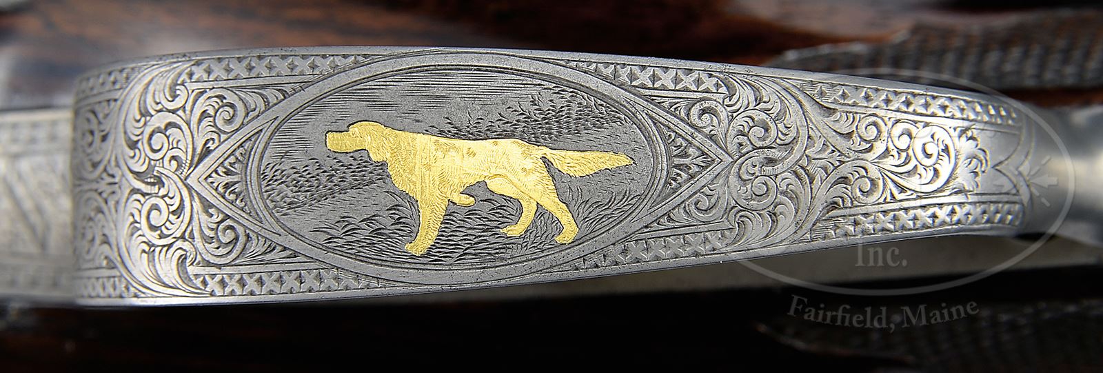 *RARE AND DESIRABLE OPTIMUS GRADE LEFEVER.SN 51044. Cal. 12 ga. This top of the advertised line Lefever has 30″ Whitworth steel bbls with flat, matted rib. Tops of bbls are engraved “Lefever Arms Co Optimus.” and “Whitworth Fluid Steel”. There are 1″ pyramids of geometric and scroll engraving, as well as gold bands, at breech ends which also have typical Lefever filed-in engraved bosses, as found on their high grade guns. There are also a band of geometric engraving at muzzles. Bottoms of bbls are stamped with SN and Whitworth sheaf of wheat trademarks. Typical late Lefever sideplated action has single piece cocking hook with tall arch extractor, and internal ejectors. Action also features automatic safety (SAFE engraved) visible through rectangular window through top of safety slide, which is gold inlaid with bands. Cocking indicators and triggers with checkered blades are gold-plated. Action is filed with fillets and beads along with rebated lock tails and relief shamrocks on fences. Engraving is of usual Lefever quality and style, far superior to that offered on most other American shotguns. Action has about full coverage of exceptionally well cut various sized shaded scroll with some geometric highlights, as well as geometric and acanthus borders. This fine engraving is background for gold inlaid game scenes; a gold inlaid duck flying across a marsh on bottom of action, and a flying grouse gold inlaid on opening lever, which also has nicely filed and checkered thumbpiece. Lockplates are also scroll engraved, and have a combination of geometric and knot-work borders surrounding well rendered gold inlaid dogs. Game birds are gold inlaid at front portions. A setter is at edge of field on left, and appears to be intently watching a flushing quail at front of lockplate, with a pointer in open uplands pointing a flushing woodcock on right. “LEFEVER ARMS CO” is in scroll terminated riband under a trio of blossoms on each lockplate. Trigger plate is engraved with patent dates, the latest being ’94. Scroll engraved trigger guard has oval vignette of gold inlaid pointing setter on bow, and SN on tang, which extends to horn grip cap with inset gold oval on top. Nicely veined and lightly figured European walnut capped pistol grip buttstock measures 14-1/8″ over checkered composition buttplate. Borderless fancy pattern checkering with ribbons through pattern and large extension into butt, is at grip. Drop points are inlet clock hand shaped horn with bone or ivory accent dots. A gold shield on top of comb is engraved “M G Schwind”. Matching splinter forend with fancy inlet horn tip and central escutcheon gold inlaid with head of a spaniel, has spring tension release. Bore diameter: left -.729, right -.729. Bore restrictions: left -.038 (full), right -.037 (full). Wall thickness: left -.029, right -.035. Drop at heel: 2-3/4″, drop at comb: 1-5/8″. Weight: 7 lbs 12 oz. LOP: 14-1/8”. CONDITION: Fine, as partially refinished. Bbls retain essentially all of a fine satin re-black, engraving sharp and clear. Action cleaned to coin finish over some light pitting. All engraving remains sharp and clear. Details of gold inlays are excellent. Cocking indicators and triggers have been re-plated and retain all of that gold. Stocks retain essentially all of a fine hand rubbed oil finish. There is evidence of some repaired cracks at wrist. Lower left horn of head of stock shows a repair and has moved slightly away from lockplate. Checkering is excellent and competently re-run. Newer buttplate is fine. Bores are excellent with slight frosting at breech ends, and there is evidence of a dent being raised, about 10″ back from muzzle on left bbl. Action is tight. Ejectors are in time. 47909-1 MGM46 (27,500-45,000) – Lot 2334
