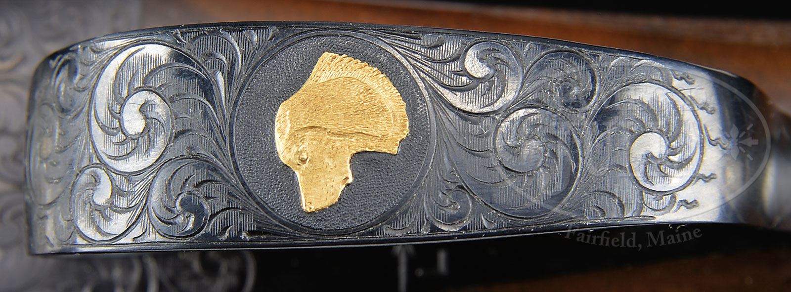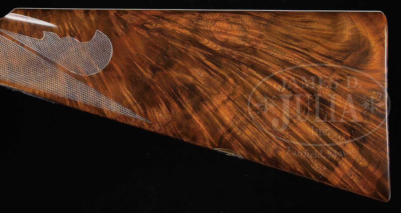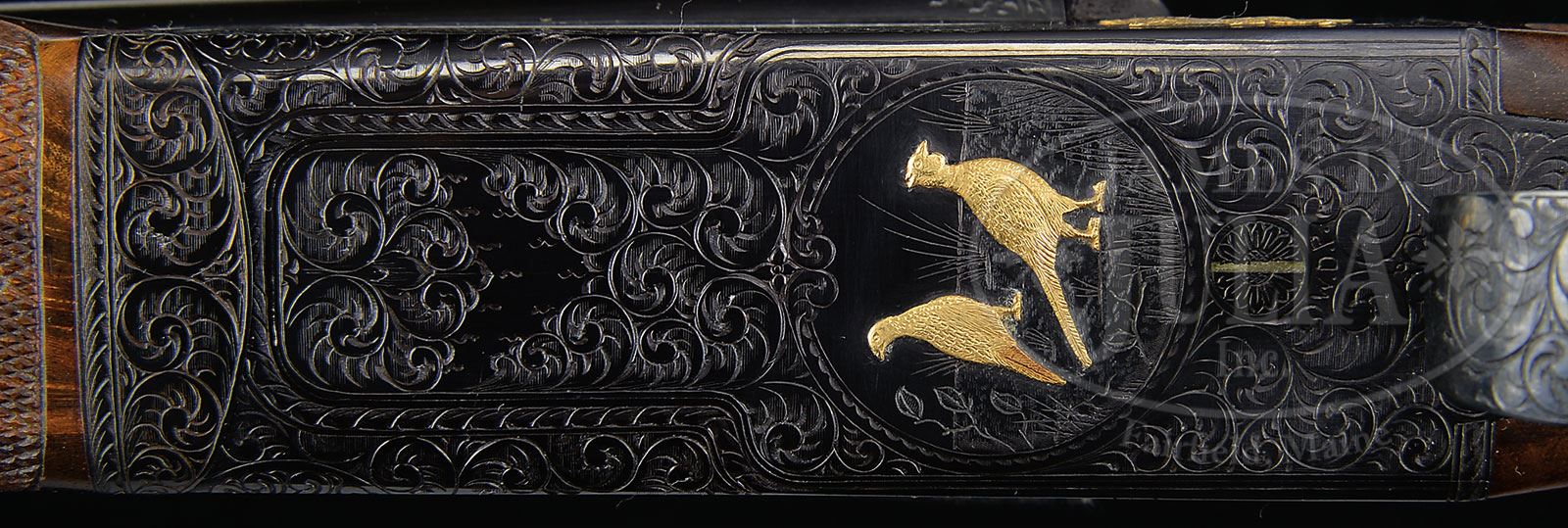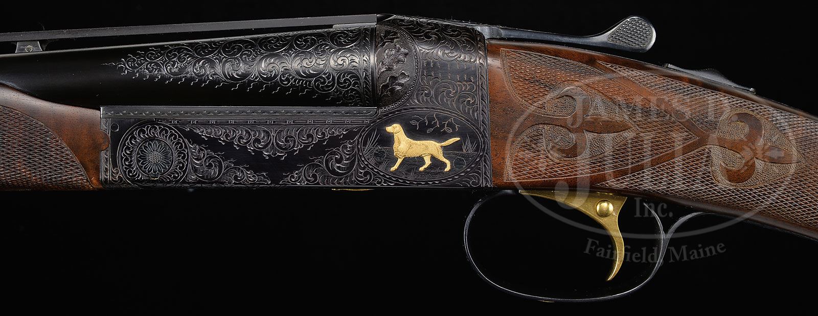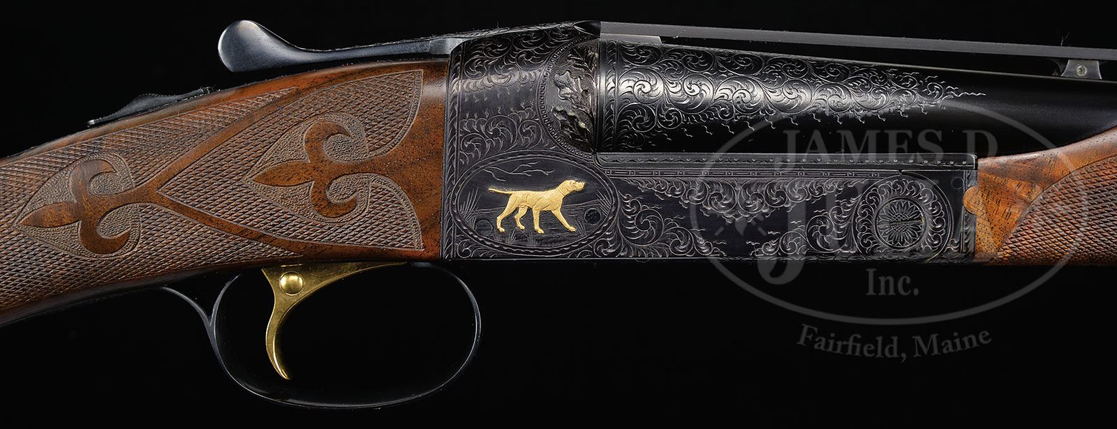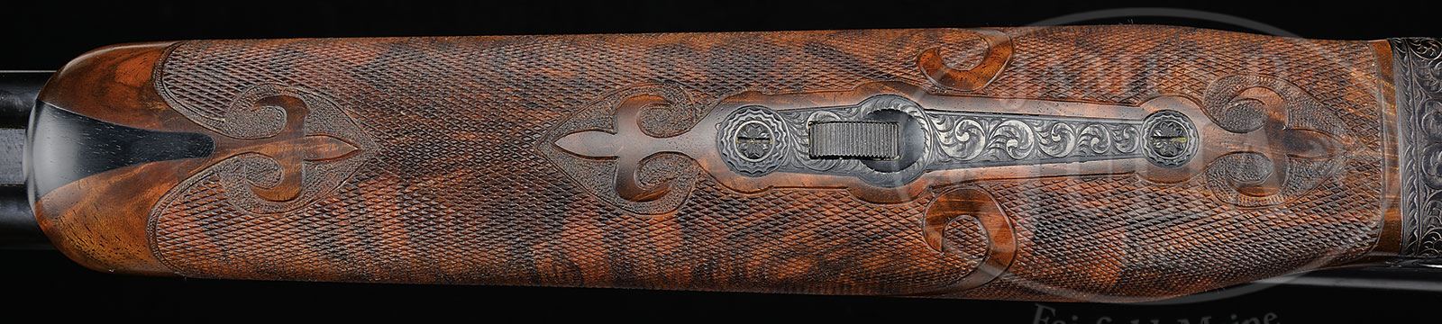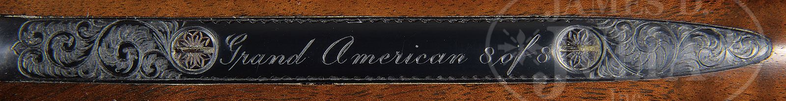 *EXEMPLARY WINCHESTER MODEL 21 .410 “GRAND AMERICAN”, NUMBER “EIGHT OF EIGHT”.SN W34013. Cal. .410. 3″ Chambers. A single set of 26″ ventilated rib bbls, are choked Mod and Full. Milled out portions of ribs are engraved “.410 MATCHED SET”. There are 3-1/4″ triangles of medium scroll at breech ends of bbls. Flat sided action featuring milled out, engine turned water table, non-automatic safety, and gold-plated single selective trigger is engraved in “Grand American” style with medium scroll outlining relief gold inlaid dogs on sides of action; a pointing setter on left and pointer on right. Trigger plate has relief gold hen and cock pheasant in open meadow. Trigger guard bow has left side portrait of spaniel, and “Grand American” “8 OF 8” is engraved on trigger guard tang. Initials “W.D.P.” are at rear of trigger plate screw. Exceptional dark feather crotch figured “full fancy” American walnut straight grip buttstock measures 14-1/4″ over checkered wood butt. Stock is checkered and carved in “21-B” style. A gold oval on toe line depicts Winchester horse and rider. Matching beavertail forend has black wood inset tip, and engine turned internals. Drop at heel: 2-1/4″. Drop at comb: 1-1/2″. Weight: 7 lbs. 3 oz. LOP: 14-1/4″. Red and white Winchester box has correct end label. PROVENANCE: Factory letter. Work order. Final test report. The Bill Phifer Collection. CONDITION: Essentially as new. Does not appear to have ever been assembled since factory proof and pattern firing, (before assembly here for display and photographic purposes). It is difficult to find even the tiniest flaw in wood or metal finishes. Box is very slightly soiled. Label is excellent. 4-51835 MGM153 (35,000-55,000) – Lot 2337 Click here to view provenance
