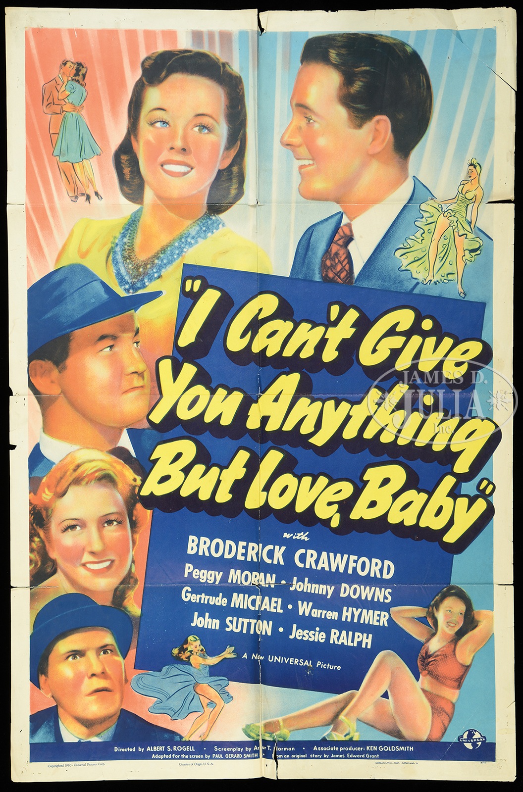 SEVEN OLD MOVIE POSTERS.Including an advertisement for “National Velvet” featuring Elizabeth Taylor and Mickey Rooney dated 1945. A Danny Kaye, “Knock on Wood”, a Broderick Crawford “I Can’t Give You Anything But Love, Baby”, Ginger Rogers and Carol Channing in “The First Traveling Saleslady”, Betty Grable in the “Farmer Takes a Wife”, Richard Carlson and Martha O’Driscoll in “My Heart Belongs to Daddy”, and George Murphy and Anne Shirley in “The Mayor of 44th Street”. SIZE: All approx. 41″ h x 12″ w. CONDITION: There are some tears on the sides. All have creases; some have separations on folds. 49103-8 (200-400) – Lot 2337 Auction: Advertising, Toy & Doll - Spring 2015 Please Note: All prices include the hammer price plus the buyer’s premium, which is paid by the buyer as part of the purchase price. The prices noted here after the auction are considered unofficial and do not become official until after the 46th day. |
