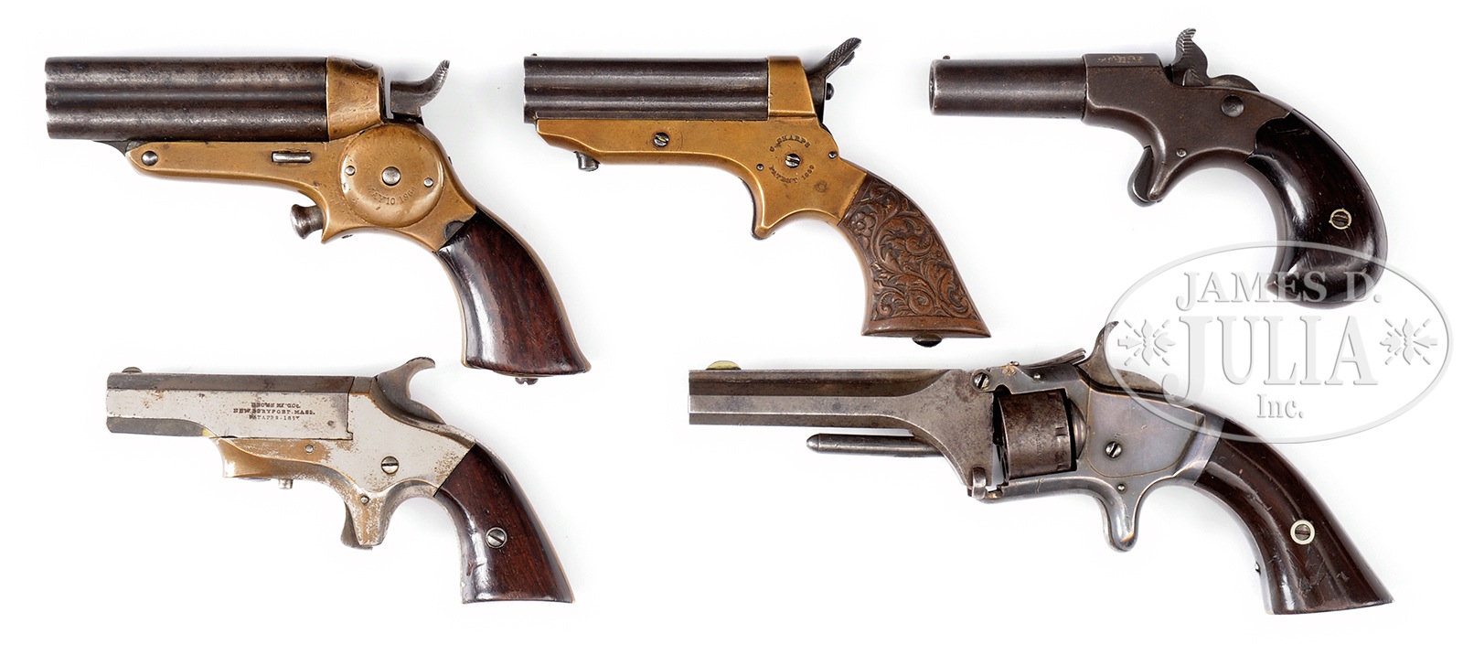 SUPERB LOT OF FIVE PEPPERBOXES AND POCKET PISTOLS.1) STAR MERRILL FIREARM 2ND MDL. NSN. Cal. 32 RF. Starr 4 bbl Derringer by Eben Starr of New York City. Second model 5th variation brass frame with 2-pc walnut grips, side hammer with rotating firing pin. Marked on left side “Starr’s Pat’s May ‘10.1864.” PROVENANCE: The Estate of G. W. “Bill” Stewart of Sonora, Texas. CONDITION: Very fine overall. Brass frame has turned an attractive mustard colored patina. Bbls have traces of blue finish remaining in protected areas. Bore and mechanics seem fine, however, firing pin does not want to rotate. 2-pc walnut grips are very fine with no breaks or material loss. 2) SHARPS & HANKINS MDL 1 A PEPPERBOX. SN 48926. Cal. 22 RF. Sharps 4 bbl pepperbox Model 1 with 2-1/2″ bbl and 4 position rotating firing pin. Brass frame with elaborate gutta percha grips. Matching numbers on frame and bbl. Bore and mechanics are fine. PROVENANCE: The Estate of G. W. “Bill” Stewart of Sonora, Texas. CONDITION: Very fine overall, with a pleasant patina on brass frame and a somewhat more contemporary blue finish on bbls. Gutta percha grips are excellent with no chips or material loss whatsoever. A very nice Sharps 4 bbl. 3) REMINGTON ELLIOT SINGLE SHOT. SN 6244. Cal. 41 RF. Remington-Elliot single shot derringer with 2-pc walnut grips and nickel silver escutcheons. 2-1/2″ bbl marked “Remington’s.Ilion.N.Y.Elliot.Pat.Aug.27.1867.” PROVENANCE: The Estate of G. W. “Bill” Stewart of Sonora, Texas. CONDITION: Very fine overall. Traces of period nickel finish remain on breech and bbl in protected areas. Balance has turned an even plum. Bore is dark. Mechanics are fine. Manufactured 1867 through 1888 with approximately 10,000 mfg. 4) BROWN MFG CO DERINGER. SN 6271. Cal. 41 RF. Brown Manufacturing Co. brass frame “Southerner” single shot pistol. 2-1/2″ oct bbl with 2-pc walnut grips. Nickel finish with spur trigger. Matching numbers on frame and bbl. PROVENANCE: The Estate of G. W. “Bill” Steward of Sonora, Texas. CONDITION: Very fine overall, with much period nickel finish remaining. Traces of case colors remain on hammer. 2-pc walnut grips are very fine with most original finish remaining and no material loss whatsoever. Bore and mechanics are fine and extractor functions. A very fine specimen overall. 5) SMITH & WESSON #1 REV. SN 86181. Cal. 22 RF. Smith & Wesson Model 1 tip-up revolver SN 86181 with 2-pc rosewood grips with nickel silver escutcheons. Silver wash over brass frame with matching assembly numbers on frame, bbl and cyl. Grips are matching numbers to frame. 3-3/16″ oct bbl. Single action with spur trigger. PROVENANCE: The Estate of G. W. “Bill” Stewart of Sonora,Texas. CONDITION: Exceptionally fine overall with most silver wash remaining on frame and grips. Bore and mechanics are very fine. A nice Smith & Wesson Model 1 tip-up. 49973-185, 49973-186, 49973-191, 49973-199, 49973-204 TDW (1,800-2,800) – Lot 2337 Click here to view provenance