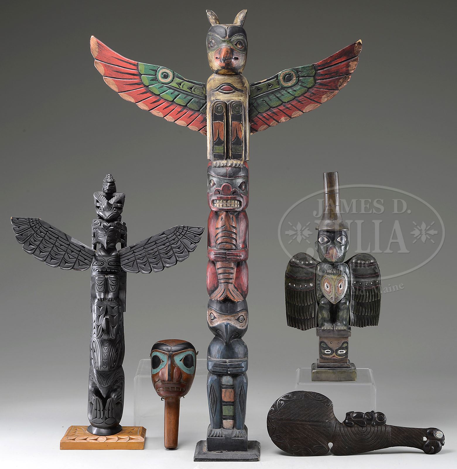 GROUP OF FIVE ETHNIC CARVINGS, NORTHWEST COAST NATIVE AMERICAN AND MAORI. Collection consists of a well carved and painted Northwest coast Native American raven clan shamans rattle, early to mid-20th century. Piece two is a very intricately carved Maiori war club with figure. Well detailed carving emulating Maori warrior tattoos, dark hardwood with inset mother of pearl. Together with three mid to late 20th century carved Northwest Native American Totems. SIZE: Rattle: 9-1/2″. Club: 16″. Totems: 19-1/2″ to 40″ t. PROVENANCE: From a fine Kentucky Estate. CONDITION: All in good condition. 9-92258 (1,000-2,000)