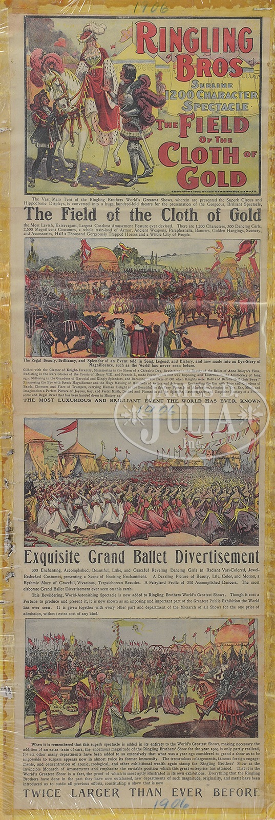 RINGLING BROTHERS FIELD OF THE CLOTH OF GOLD LITHO.This colorful, four paneled elongated poster is dated 1905 and was printed by Strombridge Litho Company. Each of the panels depict extravagant scenes with what seems like hundreds perhaps thousands of participants. SIZE: 33-1/3″ h x 11-3/4″ w. CONDITION: Some horizontal creases. The edges including the sides and top have been reinforced with tape and someone has written 1906 on the front of the poster. 49103-6 (350-650) – Lot 2338 Auction: Advertising, Toy & Doll - Spring 2015 Please Note: All prices include the hammer price plus the buyer’s premium, which is paid by the buyer as part of the purchase price. The prices noted here after the auction are considered unofficial and do not become official until after the 46th day. |