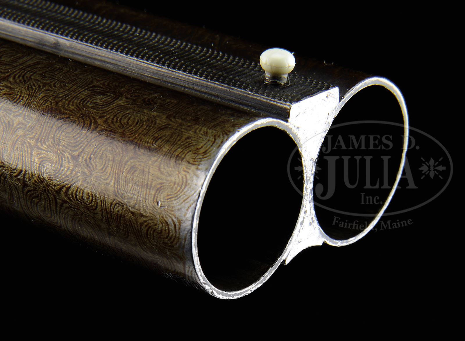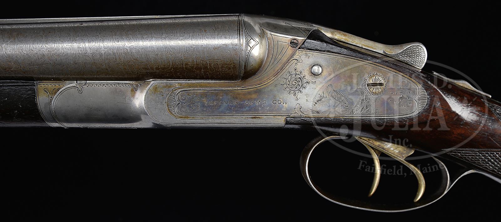 *LEFEVER SPECIAL ORDER FE GRADE WITH WHAT APPEAR TO BE ORIGINAL 27″ BARRELS.SN O36285. Cal. 12 ga. 2-3/4″ Chambers. 27″ Damascus bbls are fitted with slightly raised, matted rib. There are no Lefever markings to be found. Interesting SN with “O” prefix is on bottom of left bbl. This prefixed SN is also on water table along with grade. Inspection of muzzles shows the bbls lay together and full keels are present, leading one to believe that these bbls are orig length. Typical case hardened action features automatic safety, automatic ejectors, and double triggers. Cocking indicators are not operable. Action is engraved with sprays of scroll within line and geometric borders. A well engraved grouse sits in open woodlands on left lockplate, and a duck is flying toward viewer from marsh on right. “LEFEVER ARMS CO” is on each plate. Lightly streaked European walnut capped pistol grip buttstock measures 13-1/2″ over orig Lefever composition buttplate. Point pattern checkering is at grip. Matching splinter forend with large steel central escutcheon and steel tip, has usual spring release. Bore diameter: left -.738, right -.738. Bore restrictions: left -.010 (IC), right -.011 (IC). Choke in left bbl begins 2″ from muzzle. Wall thickness: left -.028, right -.030. Drop at heel: 2-3/4″, drop at comb: 1-3/4″. Weight: 6 lbs 14 oz. LOP: 13-1/2″. Special Note: This item contains or is made of ivory. Do not bid on this lot unless you have read and agreed to our "Ivory Position Statement" and the "Waiver of Legal and Financial Risk to James D. Julia in regards to your Purchase of an Ivory Object." This information is located in the front section of our catalog. CONDITION: Very fine. Bbls retain 70 – 80% orig bold Damascus finish, thinning and silvering from normal hand wear. Action retains approx 30% orig case hardening color, vivid where protected, thinned and silvered around bottom and on fences. Lockplates retain over 90% of their orig case hardening color which is quite strong. Stocks retain most of what appears to be their orig finish, as well, with numerous marks. Forend considerably worn, and with many dents. Checkering soiled and gummed. Bores are very fine, lightly frosted, and with a few scattered light pits. There is evidence of a dent being raised 8″ behind muzzle of left bbl. Action is tight. Bbls are on face. Ejectors are strong and in time. An “as found” example of this relatively scarce Lefever grade, which was in competition with the G. H. E. Parker and L. C. Smith 2 grade. “Certifiable pre-ban ivory” rear bead. 49224-12 MGM72 IVORY (2,000-4,000) – Lot 2338
