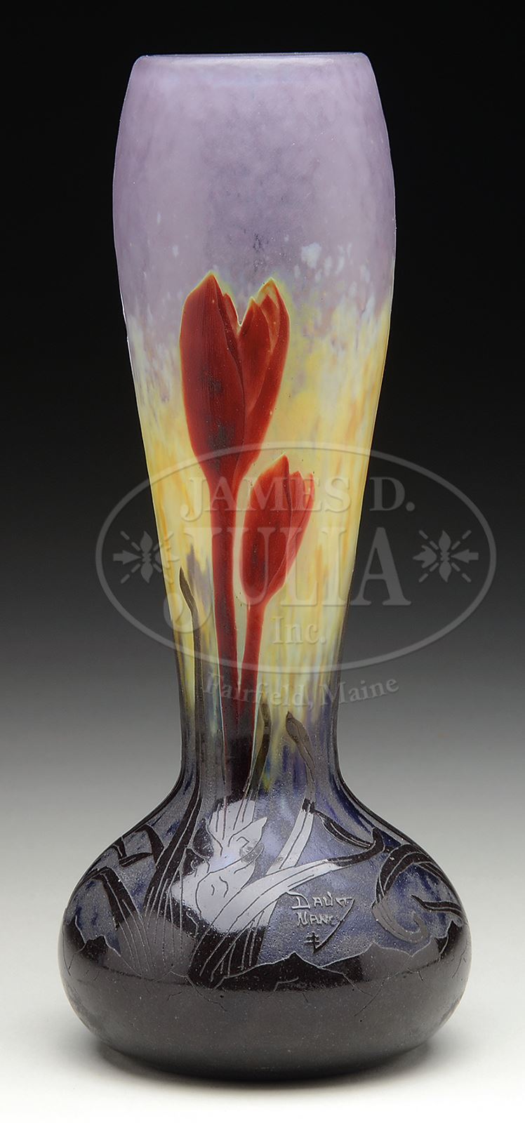 Daum crocus vase has dark green cameo glass, stems and leaves ascending from the bulbous foot leading to padded and wheel-carved crocus flowers. The crocus flowers are done in dark purple and red-orange over white all set against a martele background of rich mottled purple, yellow and lavender. Vase is signed on the side of the foot with cameo signature “Daum Nancy” with the cross of Lorraine. SIZE: 12″ t. PROVENANCE: From an Unreserved Texas Collection. CONDITION: Minor wear around the bulbous body above the foot, otherwise very good to excellent. 50006-12 (7,000-10,000) – Lot 2339