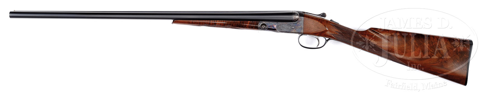 Please Note: Gun is identified in the Parker Gun and Serialization book as originally having 28″ barrels and pistol grip stock, now has 26″ barrels (probably reduced to this length) and straight stock – both of which were likely done at the time of restoration. *SCARCE PARKER GHE 20 GA SHOTGUN WITH CASE.SN 233345. Cal. 20 ga. 2-5/8″ chambers. Full length matted top rib with steel front bead. Chokes are Mod/Mod. #0 frame. Non-selective Miller sgl trigger, auto ejectors, auto safety. Straight grip buttstock with nickel-Shield engraved “M” of flame grained American Walnut checkered in three-point pattern with 14-1/8″ LOP over Parker DHBP. Splinter forearm checkered in standard GH pattern with Deeley release and steel tip. Receiver engraved in standard G grade pattern with pheasants on right and bottom, quail on left surrounded by light scroll. Housed in a light brown toe-under type case with maroon interior and modern Parker label. Case has cleaning rods and cleaning accessories. Weight: 6 lbs. 5 oz. PROVENANCE: The Forest R. Marshall Collection. CONDITION: Extremely fine as restored likely by Del Grego. Bbls retain nearly all of their restored rust-blued finish. Doll’s head ever so slightly rounded. Buttstock and forearm are excellent and retain nearly all of their professionally restored finish with a couple of scattered light handling marks. Receiver retains nearly all of its Del Grego cyanide restored case color. Bores are bright and shiny with minor orange peel. Mechanics are crisp, trigger works well, ejectors are in time. Case and accessories are excellent. 51143-1 JSL (5,500-9,500) C&R – Lot 2341