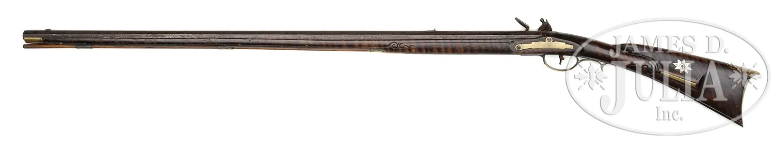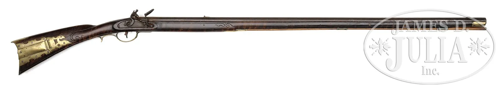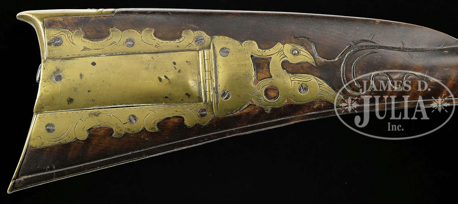 INCISED CARVED LEBANON SCHOOL SIGNED N. BEYER RIFLE.SN NSN. 42-1/2″ full oct 52 Cal. rifled bbl signed “N. Beyer”. Four piece engraved brass patchbox with a finial identical to Number 93 in Kindig’s Thoughts on the Kentucky Rifle in its Golden Age. Kindig refers to this as an unusual and very charming patchbox head, an interesting bird with somewhat of a Pennsylvania Dutch feeling. He notes he has seen this head on only a few of N. Beyer’s rifles. Rifle is incised carved forward of the cheekpiece and extending over the wrist to the patchbox side. Incise carved panels run on each side from the lock and sideplate mortises to the nosecap, broken only at the rear ramrod entrance ferrule. Gun has a 5-1/4″ engraved brass toeplate behind a football shaped brass inlay. Nicholas Beyer was a very prolific gunsmith. Many Beyer rifles have survived and many have different features. Beyer is listed as a gunsmith in Dauphin County in 1807 and 1810 and he generally signed his guns in script on the bbl. CONDITION: Professionally repaired crack in stock 12″. There is evidence of some barely visible minor wood repair in the area of the trigger guard. 8-87716 RG61 (8,000-15,000) – Lot 2343