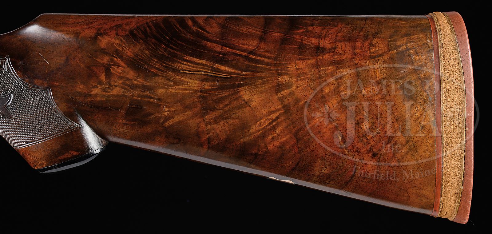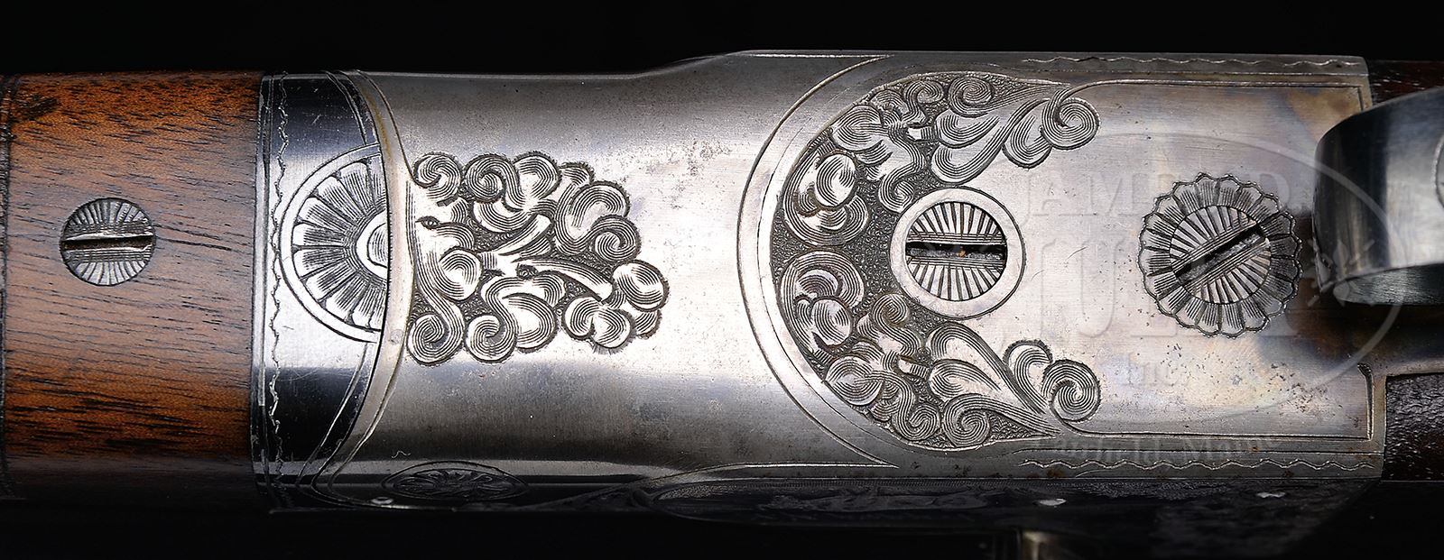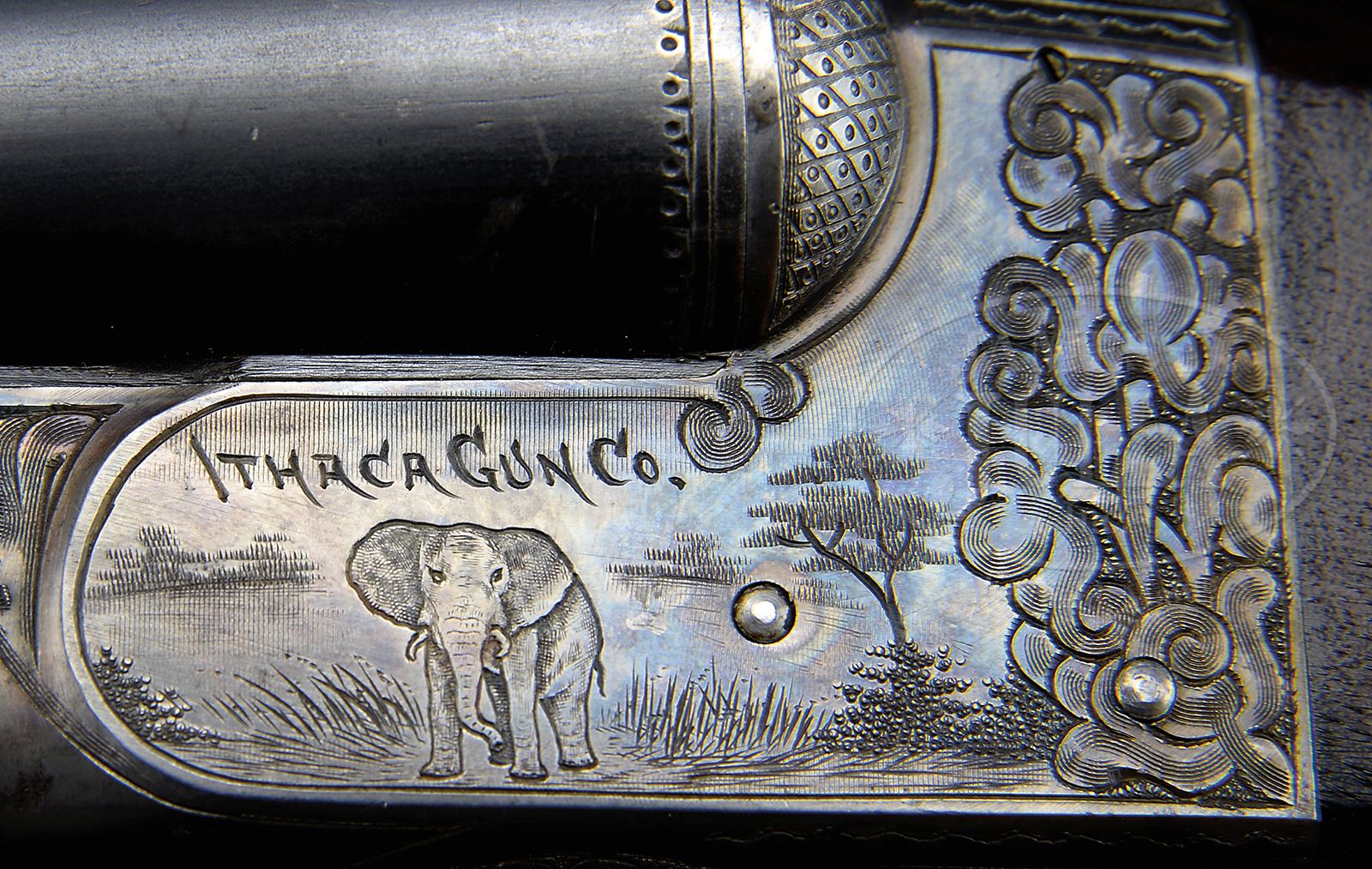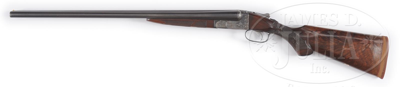 *ONE OF A KIND ITHACA NID GRADE 4-E 16 GAUGE WITH ORIGINAL ELEPHANT AND WILDEBEEST ENGRAVING.SN 433720. Cal. 16 ga. 2-9/16″ Chambers. Factory 25″ Bbls with matted, concave rib, are unengraved and unmarked as to makers name. Engine turned bbl flats are stamped with SN and grade. Typical case hardened action with pin type cocking indicators which protrude through top, features Miller type sgl selective trigger with selector incorporated with safety. Action is engraved in typical “4” style with 70% coverage large, shaded acanthus, and geometric “checkering” on fences. This engraving surrounds very unusual vignettes of African game on sides under “Ithaca Gun Co”. Left side depicts a face-on elephant, trunk down, in savannah with tree in background. Right side depicts what must be a wildebeest, or Guar, or could also be a stylized cape buffalo, also in open savannah. This unique engraving is undoubtedly factory original, and correspondence with Walt Snyder, Ithaca Gun Co historian, states “I am pleased to say that I found a pull of the elephant and a rubbing of the water buffalo among Bill McGraw’s collection of his engraving “pulls”.” SN is at grip. Finely feather crotch figured American walnut capped pistol grip buttstock measures 13-3/4″ over old Jostam pad with exposed foam center. Stock features no “4” grade style checkering with fleur-di-lis intrusions and ribbons through pattern, as well as a vacant gold shield on toe line. Matching splinter ejector forend has inset ebony tip, and typical Deeley type release. Bore diameter: left -.664, right -.664. Bore restrictions: left -.020 (mod), right -.004 (IC). Wall thickness: left -.032, right -.029. Drop at heel: 2-7/8″, drop at comb: 1-5/8″. Weight: 6 lbs 10 oz. LOP: 13-3/4″. PROVENANCE: Letter from Walt Snyder regarding the unusual engraving on this gun with some rubbings of this exact engraving, one of which has notation “Rufous Takim”, most likely client for whom this gun was made, along with a notation “I think you have a uniquely engraved gun in the truest sense of the word!” Special Note: This item contains or is made of ivory. Do not bid on this lot unless you have read and agreed to our "Ivory Position Statement" and the "Waiver of Legal and Financial Risk to James D. Julia in regards to your Purchase of an Ivory Object." This information is located in the front section of our catalog. CONDITION: Excellent, original, as found. Bbls retain 80 – 85% orig blue, thinning overall from normal hand wear, with a number of light marks and scratches. Action retains approx 70% orig case hardening color, thinned and silvered on bottom, fences, and top lever. Color is strong and vivid on sides. Trigger guard is silvered on edges of bow. Forend iron and latch retain over 90% of their blue. Stocks retain approx 90% of their orig finish, thinned somewhat on high points, worn through at bottom of forend from normal hand wear, and some loss and added oil around rear of butt from installation of pad. Checkering is somewhat worn and slightly dirty. Bores are excellent. Action is tight. Ejectors are strong. Trigger works. A really neat “off the wall” Ithaca. “Certifiable pre-ban ivory” bead sight. 49365-1 MGM395 IVORY (5,000-8,000) – Lot 2344 Click here to view provenance