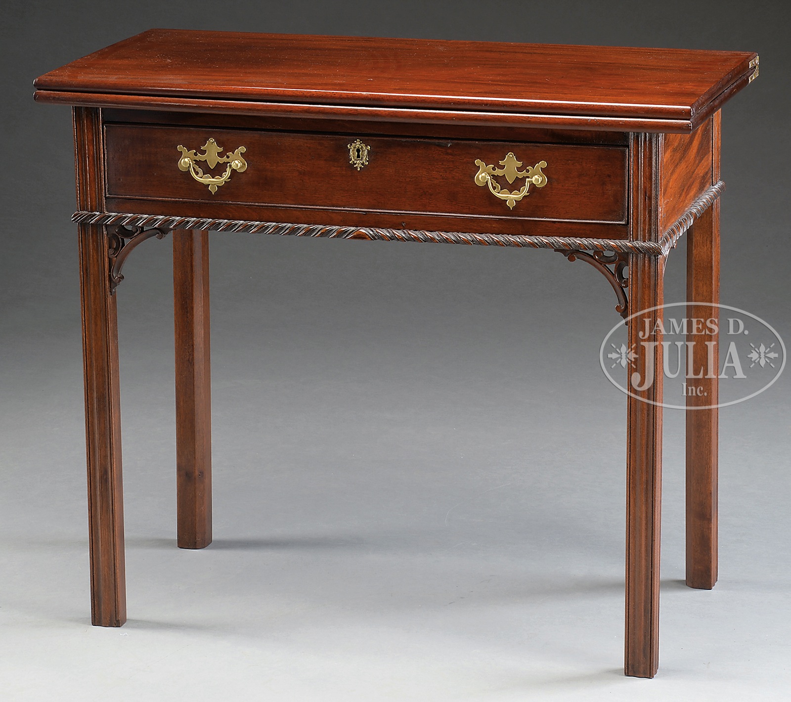 CHIPPENDALE CARVED MAHOGANY SQUARE CARD TABLE.Second half 18th century, probably Philadelphia. The rectangular hinged top above the conforming frieze fitted with a single long drawer with cock-beaded edges, the apron with gadrooned edges raised on square channeled and chamfered legs with pierced carved brackets, the top supported with one gate. The table with white pine secondary, the rear apron of oak, the drawer sides of poplar. SIZE: 29″ h x 34″ w x 16-1/2″ d. PROVENANCE: From a fine private Long Island, NY collection. CONDITION: The Santo Domingan figured mahogany surfaces with deep rich color and patina. Brackets appear original. Hardware later replacements. Minimal and minor restoration to drawer glides. No restoration of significance observed. 9-93318 (3,000-4,000) – Lot 2347