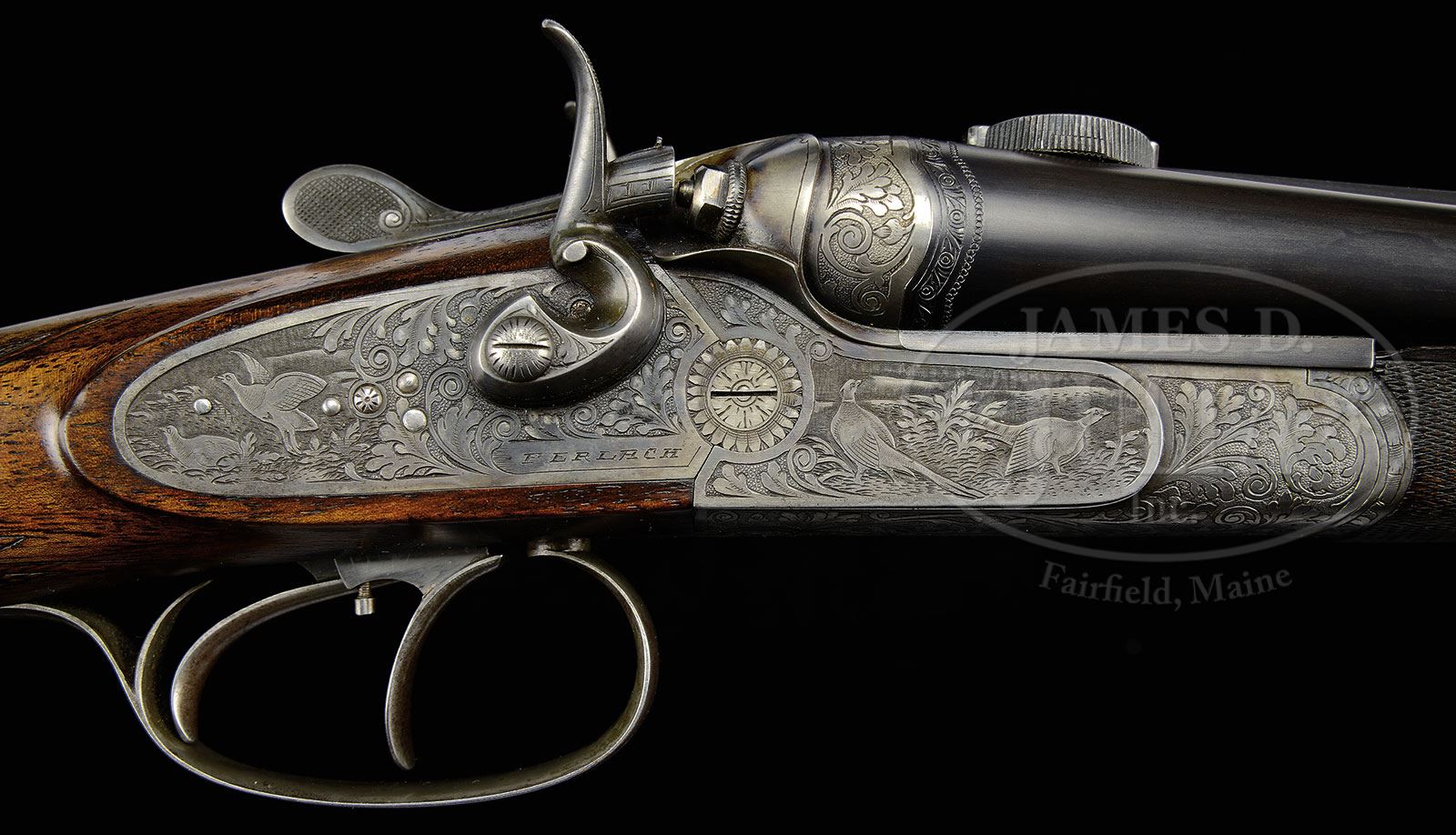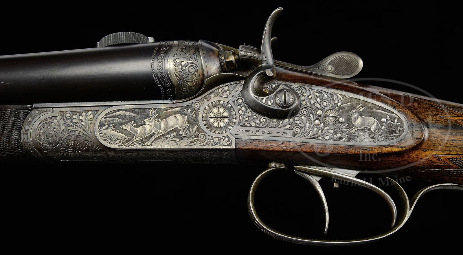 *UNUSUAL HIGH ORIGINAL CONDITION PRE-WAR FRANZ SODIA TOP LEVER HAMMER CAPE GUN WITH SCOPE.SN 236. Cal. 16 ga x 7x72R. 2-1/2″ Shotgun chamber. 23-3/4″ Dovetailed bbls with full length matted rib are engraved “Franz Sodia Ferlach” on unmatted portion of rib, at rear. Rib is fitted with silver front bead, one standing leaf rear sight, and claw scope bases. Bbl flats are stamped with 1938 Ferlach proofs. Bottom of rifle bbl is stamped “BOHLER BLITZ STAHL”. Case hardened top lever action is fitted with back action rebounding locks with serpentine hammers, and features hidden crossbolt third fastener, side clips, and double triggers (front set). Action and lockplates are engraved with scrolls and acanthus, in stippled background, which surrounds game scenes; a roebuck and doe are on left, and a pair of pheasant are standing on right side of action. Left lockplate depicts a hare and right lockplate, a pair of grouse. Left lock is engraved “F. R. Sodia”, and right lock “FERLACH”. Relatively plain, with light streaking, European walnut capped pistol grip buttstock measures 14″ over ribbed horn buttplate, and features Bavarian right hand cheekpiece, point pattern checkering with broad mullered borders, horn grip cap, and a sling loop on toe line. Matching splinter forend has Deeley release. Bore diameter: -.663. Bore restriction: -.031 (full). Minimum wall thickness: -.031. Drop at heel: approx 2-7/8″, drop at comb: approx 1-5/8″. Weight without scope: 6 lbs 12 oz. LOP: 14″. Hensoldt Dialytan 4X scope with single post reticle is in soldered on claw rings, rear ring has windage adjustment. Scope has orig leather lens caps. PROVENANCE: George Reeb Collection. CONDITION: Excellent. Bbls retain nearly all of what appears to be their orig satin rust blue with a few light scratches. Action and lockplates retain 85-90% orig case hardening color, somewhat faded, and silvered on fences and bottom. Stocks retain nearly all of their orig finish with numerous very light marks and scratches, checkering slightly worn. Bores are excellent. Action is tight. Locks are crisp. Set trigger works. Scope is excellent, optically clear. 4-53730 (4,000-6,000) – Lot 2349