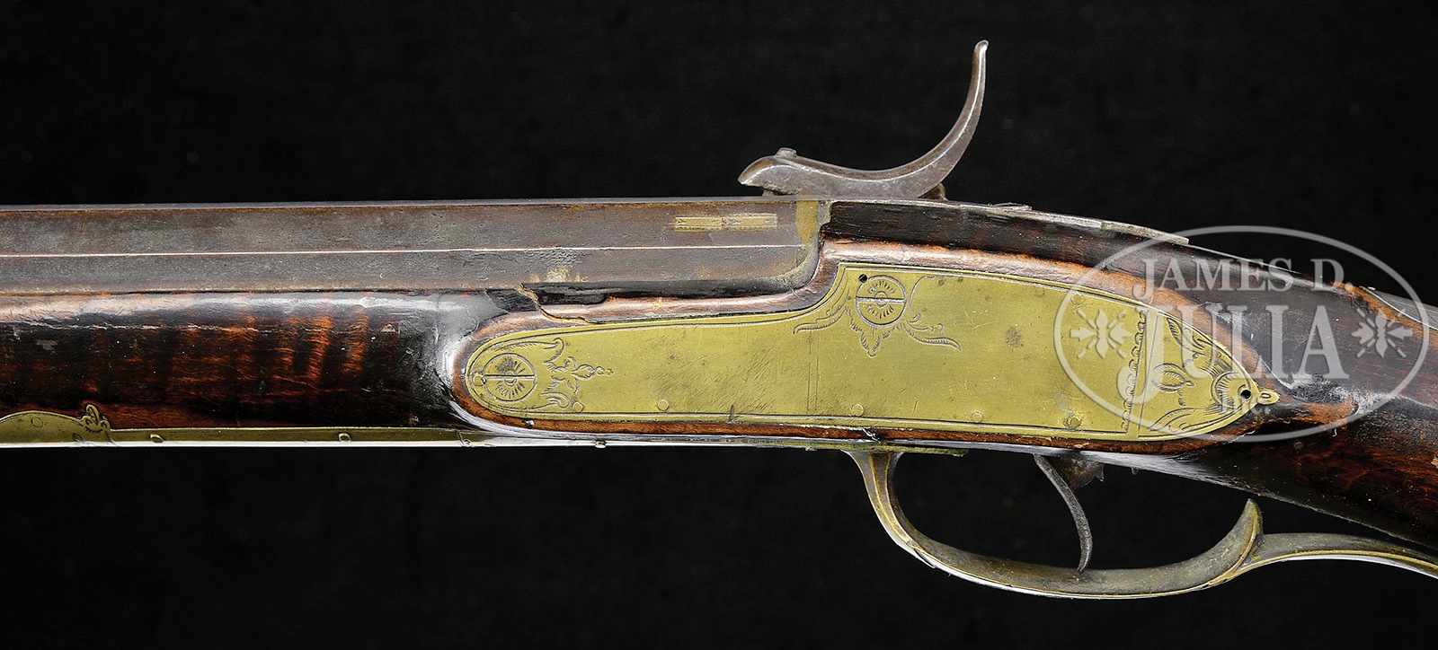 SN NSN. Cal. .50. 42″ full oct smooth bbl signed “HENRY YOUNG”. Overall length 56-1/2″ with a 4-1/4″ high X 1-3/8″ wide butt. The bbl of this attic condition rifle is held to the curly maple stock with 3 bbl wedges, each of which is surrounded by an oval silver inlay. The excellently engraved brass 2-piece patchbox with one piercing has the customary Young family door, hinged on the bottom and contained within the brass plate encircling the door. The patchbox release is in the 3-3/4″ brass engraved toe plate and there is an engraved 9″ comb inlay. The cheekpiece side of the rifle features an engraved oval silver inlay on the cheek depicting the American eagle and an elaborate 4-1/2″ long engraved pick holder with 2 piercings. There is an attractive 1/4″ wide brass decorative engraved inlay that running along the buttplate on the left-hand side. There is a very nice engraved 10″ long saddleplate from the trigger guard to the rear ramrod entrance pipe. The full brass engraved side plate features two engraved lock screws, the actual lock screw being under the hammer on the lockplate side. The lockplate is handsomely engraved as is the pill lock hammer suggesting this gun was produced very early in the percussion period. The pill lock precedes both tube lock and percussion cap. The pill itself was a tiny pellet filled with what literature calls simply ‘detonating powder’. A hammer fell upon the pill, setting it off, which in turn exploded fire into the powder charge in the breech. Longrifles and pistols made by the Young family of Easton, PA have a proud heritage spanning four generations and over 100 years. There were five members of this family that were gunsmiths. Their names were Henry, John, John, Jr., Peter, and John K. Young. Henry Young, the progenitor of this famous family, was born about the year 1720. The old stone, one-story building which served as the first of the Young’s two gun shops still stands along the Sullivan Trail in north Easton. The building is reportedly the oldest building still extant in the city of Easton. The Young gun shop enterprise was established in 1759 making it one of the few remaining orig gun shops in the United States dating from the Colonial period. Henry Young taught his son, John, the profession and art of gun making. The Northhampton County tax list includes Henry Young as a locksmith 1774 and John as a gunsmith at the time of the American Revolution. Both are listed as gunsmiths in the tax lists of 1779. The Young family made flintlock rifles and pistols for private customers, the Continental Congress and later the United States Government. It is interesting to note Henry Deringer, Jr. apprenticed to the Young family before beginning his business in Philadelphia where he invented the famous Deringer pistol. The Young gun shop at Easton was a place of importance and the family became generally known, not only in PA, but throughout the other colonies. John and Henry Young took the Oath of Allegiance on October 17th and 26th, 1778, respectively. CONDITION: Excellent attic condition. The orig stock finish shows the expected dents and bruises associated with age. There is an 11″ long X 1/8″ wide wood sliver missing along the right-hand side of the bbl from the muzzle. The first silver oval wedge inlay is missing on the left-hand side at the muzzle. There are a number of brass pins missing on the side plate and all pins should be reset. There is a about a 1″ by 1/4″ piece of wood missing at the forward end of the lock. This rifle is the way everyone would like to find it, untouched for those who like attic condition and easily restored by a conservator to wonderful condition. 4-51106 RG109 (7,500-12,500) – Lot 2351
