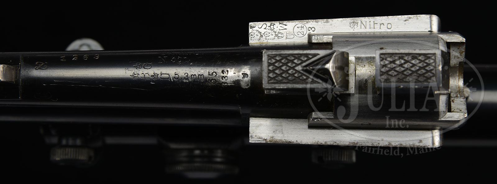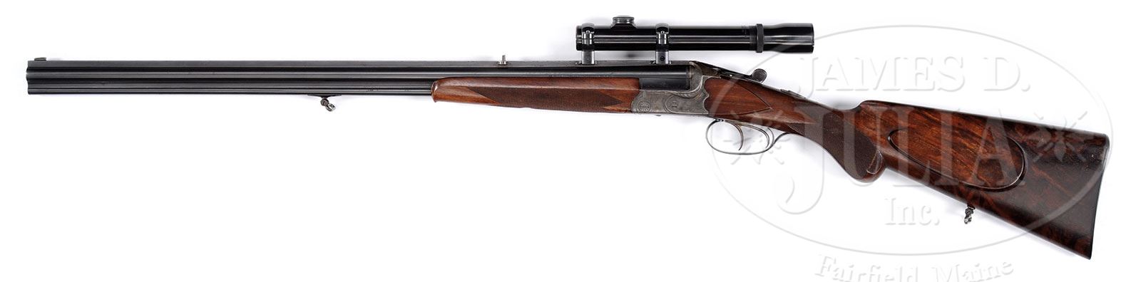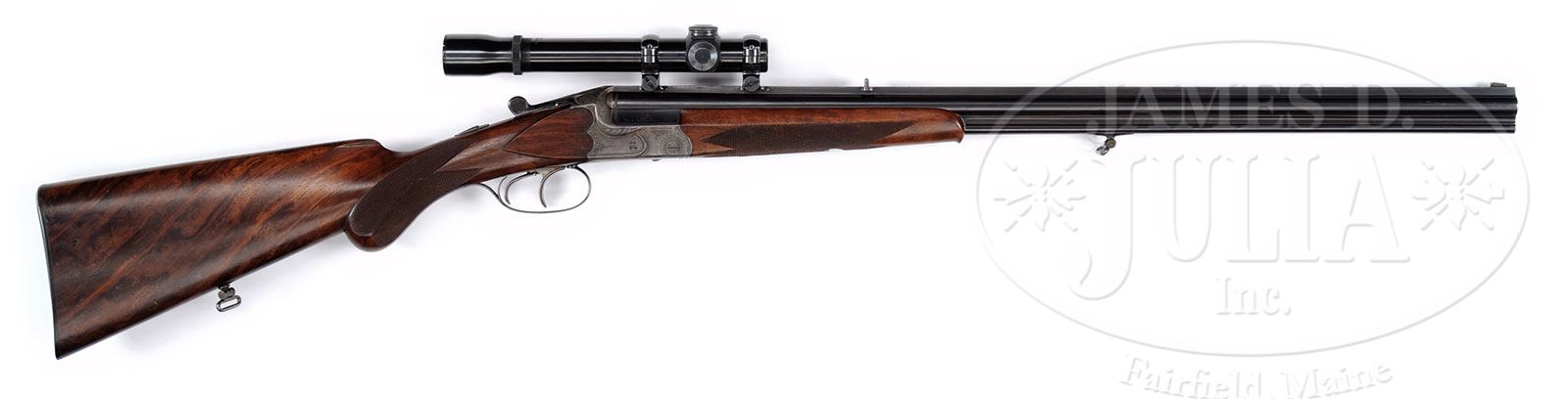 *DAINTY W. EBLEN 24 GAUGE/ 22 VIERLING OVER-UNDER COMBO GUN WITH SCOPE.SN 1269. Cal. 24 ga x 22 Vierling (hornet). 25-3/4″ Demi bloc bbls are fitted with full length matted rib engraved “W. Eblen Stuttgart” on milled out portion. Rib is fitted with one standing leaf rear sight, and Krieghoff type dovetailed scope bases. Left sides of bbls are stamped “KRUPP LAUFSTAHL”. Bbl flats are stamped with German Imperial proofs for 24 gauge, and “5.3 X 35″ as well as proof date of 3/32. Scallop backed case hardened OU Blitz action features non-automatic safety, pin type cocking indicators, dolls head third fastener, reinforcing bolsters, and double triggers (front set). Action is engraved with sprays of scroll within stamped scroll borders. Blued trigger guard has scroll on bow. Nicely marbled European walnut round knob pistol grip buttstock measures 13-3/4″ over checkered horn buttplate, and features small right hand shadow line cheekpiece, diamond hand, point pattern checkering, and a sling loop on toe line. Small slim one piece schnabeled forend has Deeley release. Bore diameter: top -.588. Bore restrictions: top -.030 (full). Minimum wall thickness: top -.038. Drop at heel: approx 3-1/8″, drop at comb: approx 1-3/4″. Weight without scope: 5 lbs 5 oz. LOP: 13-3/4”. Weaver K 1 scope with crosshair reticle is in modified Weaver type steel mounts. PROVENANCE: George Reeb Collection. CONDITION: Excellent. Bbls retain 80 – 90% orig blue with light flecking overall, and high edge wear. Action retains 60 – 70% orig case hardening color, fading and graying at bottom. Top lever and trigger guard retain over 80% of their orig bright blue. Stocks retain approx 90% orig finish with oil rubbed in over marks and dings on butt. Checkering is lightly worn, with a few compressions at grip, and a couple of deep scratches on left side. Bores are excellent. Action is tight. Scope optics are clear. 4-54798 (3,000-5,000) – Lot 2352
