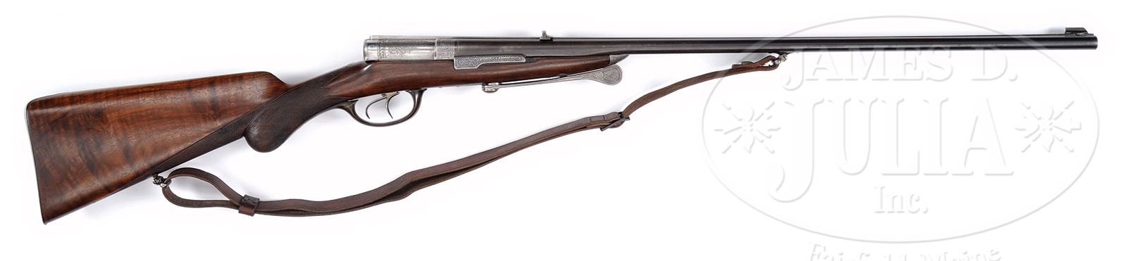 UNUSUAL F. V. DREYSE DOUBLE RIFLE WITH CARTRIDGES.SN 34230. Cal. 11mm Mauser. 25-3/4″ Bbls are gold inlaid “F. V. DREYSE SOMMERDA” on silver wire inlaid bordered area on full length matted rib. One standing, one folding leaf rear sight is dovetailed through rib, as is a silver bead front sight. Bottoms of bbls are stamped with German imperial black powder proofs and SN. Unusual action with in-line coil spring strikers, a holdover from needle fire design, is combined with a long steel forward pivoting underlever similar to that found on Collath guns. Moving lever to the left and back cams bbl set forward away from breech discs, and then pivots them to the right side, at the same time cocking action. Gun automatically closes when lever is returned to forward position. “Cal: 11 mm” is engraved on water table and exposed when action is open. Firing pin housing, trigger plate, and other metal parts are engraved with exceptionally well cut, various sized open shaded scroll. There is more scroll silver wire inlay on rib extension. Both triggers are set. Trigger guard is of horn. Nicely fiddle figured European walnut stock measures 14-1/4″ over engraved steel buttplate with trap, which covers space for three cartridges. Stock has small right hand cheekpiece and point pattern checkering with mullered borders at grip, as well as checkered panels that extend along toe line, and around sling loop matching that on bottom of bbls. Drop at heel: approx 2-3/4″, drop at comb: approx 1-5/8″. Weight: 6 lbs 15 oz. LOP: 14-1/4″. Also included are 35 custom cartridges and 5 empty brass in Winchester Western boxes marked “11 MM Mauser 387 GRS”. CONDITION: Good, as partially refinished. Bbls retain a considerable amount of what appears to be their orig blue, with considerable light frosting and thinning overall. All other metal parts are cleaned to coin finish. Stock retains nearly all of a hand rubbed oil finish over light marks, checkering cleaned up. Bores are very fine, strong rifling throughout, dark in grooves at breech ends. Action works smoothly. Triggers set. Older custom cartridges are slightly tarnished. A really neat lightweight rifle. 4-54053 (3,000-5,000) – Lot 2353