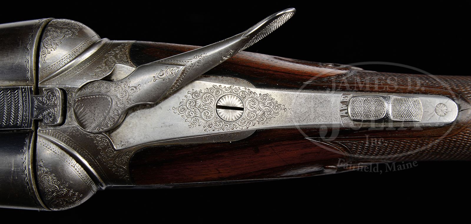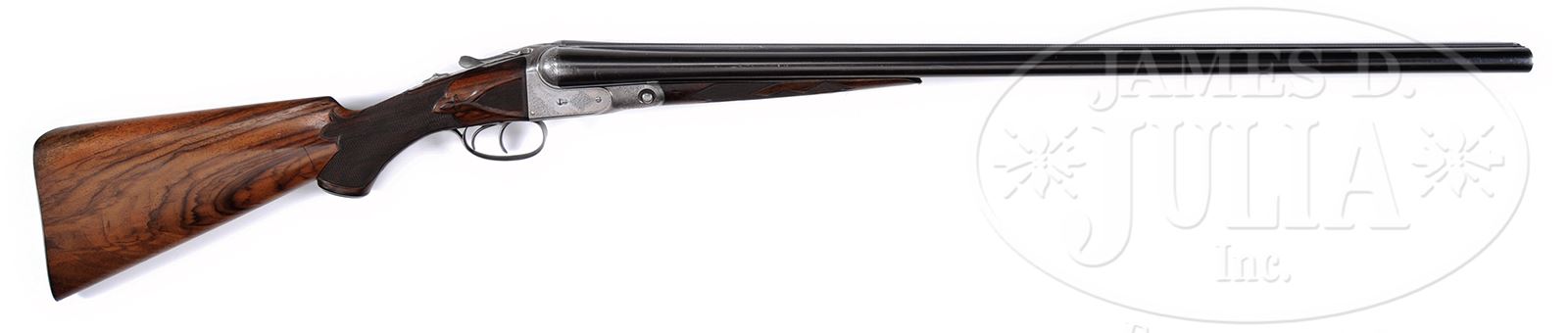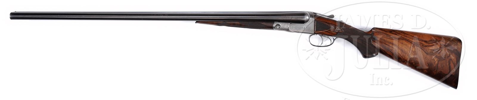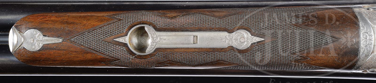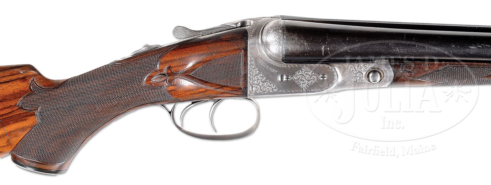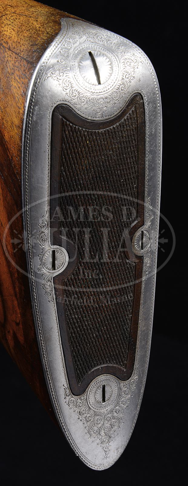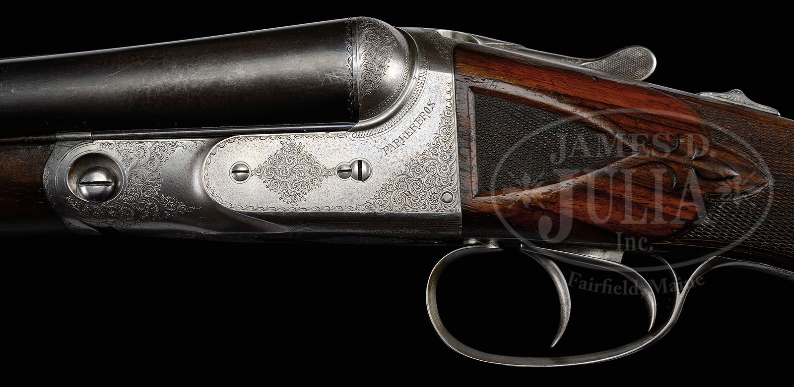 SN 165194. Cal. 12 ga. No. 2 Frame. 2-3/4″ Chambers. 30″ Bbls with wide matted rib are marked with Parkers Meriden CT address, and “ACME STEEL”. All correct marks are on lumps and bbl flats. Typical action features automatic safety (SAFE engraved), and double triggers. Action is nicely filed with chevron on top lever and single beads around fences. It is engraved with about 60% coverage of small interwoven scroll per special request. “PARKER BROS” is on each side following line of fence beads. Scroll engraving extends to trigger guard bow and onto tang, which is also engraved with SN. Factory records indicate, under special instructions: “chamber 2-3/4″, scroll engraving no game, no gold ornaments, and nice stock”. The stock is of exceptional, beautifully marbled and nicely figured circassian walnut, and measures 14-1/4″ over scroll engraved skeleton steel buttplate. It is of capped pistol grip design with cap of hard rubber with large vacant gold oval inset on top. Side panels are inset and checkered and have fleur-di-lis drop points. Grip checkering has fancy mullered borders with portion of fleur-di-lis flaring up toward comb, all in classic “A” grade style. Matching splinter ejector forend has typical release and nicely filed steel tip. All specifications match PARKER IDENTIFICATION & SERIALIZATION ledger. Bore diameter: left -.730, right -.730. Bore restrictions: left -.031 (full), right -.037 (full). Minimum wall thickness: left -.030, right -.030. Drop at heel: 2-5/8″, drop at comb: 1-5/8″. Weight: 7 lbs 12 oz. LOP: 14-1/4″. PROVENANCE: Two factory letters, one dated Nov 19, 2001, with specs, the other Aug 20, 2013, indicates gun was to be shipped to S. W. C. Trexler at the Racquet Club of Philadelphia. CONDITION: Fine, as found. Bbls retain approx 70 – 80% of what appears to be orig blue, considerably faded at breech ends with numerous light marks, scratches, and rubs, and a few patches of cleaned rust. Action has been cleaned, and is now overall pewter gray. Stocks retain most of their orig finish with numerous bumps, marks, and minor dents, with some oil added to butt as maintenance. Stock head has slightly raised grain in orig untouched finish. Checkering is lightly worn. Bores are very fine, lightly frosted in patches toward breech ends. Action is tight. Bbls are on face. Ejectors are out of time. 49623-1 MGM156 (11,000-15,000) – Lot 2353