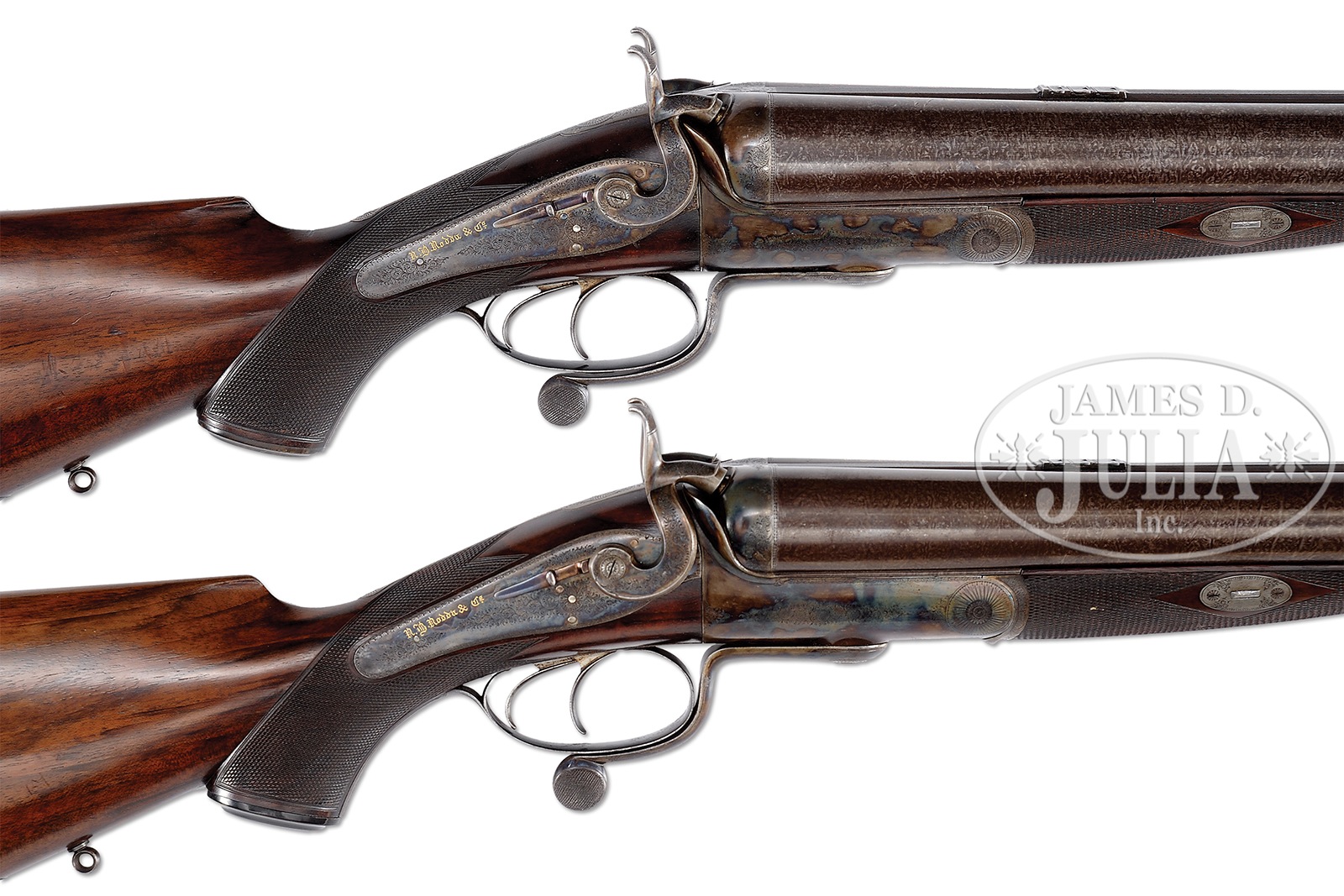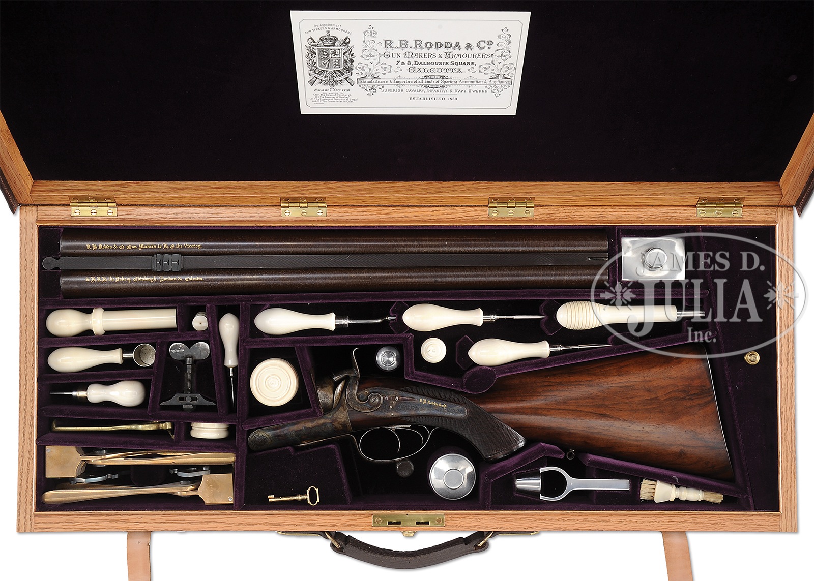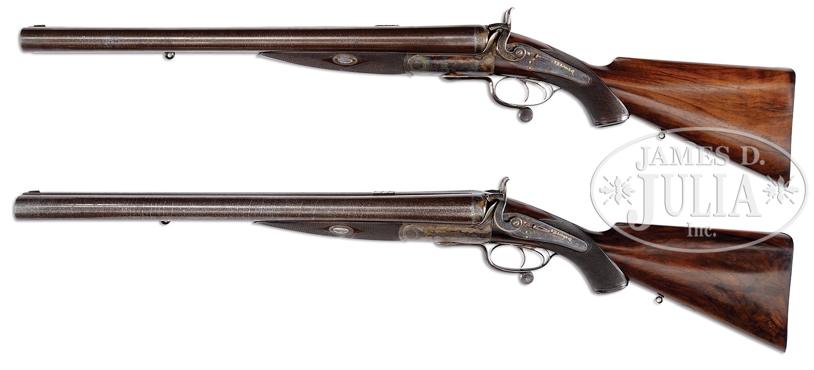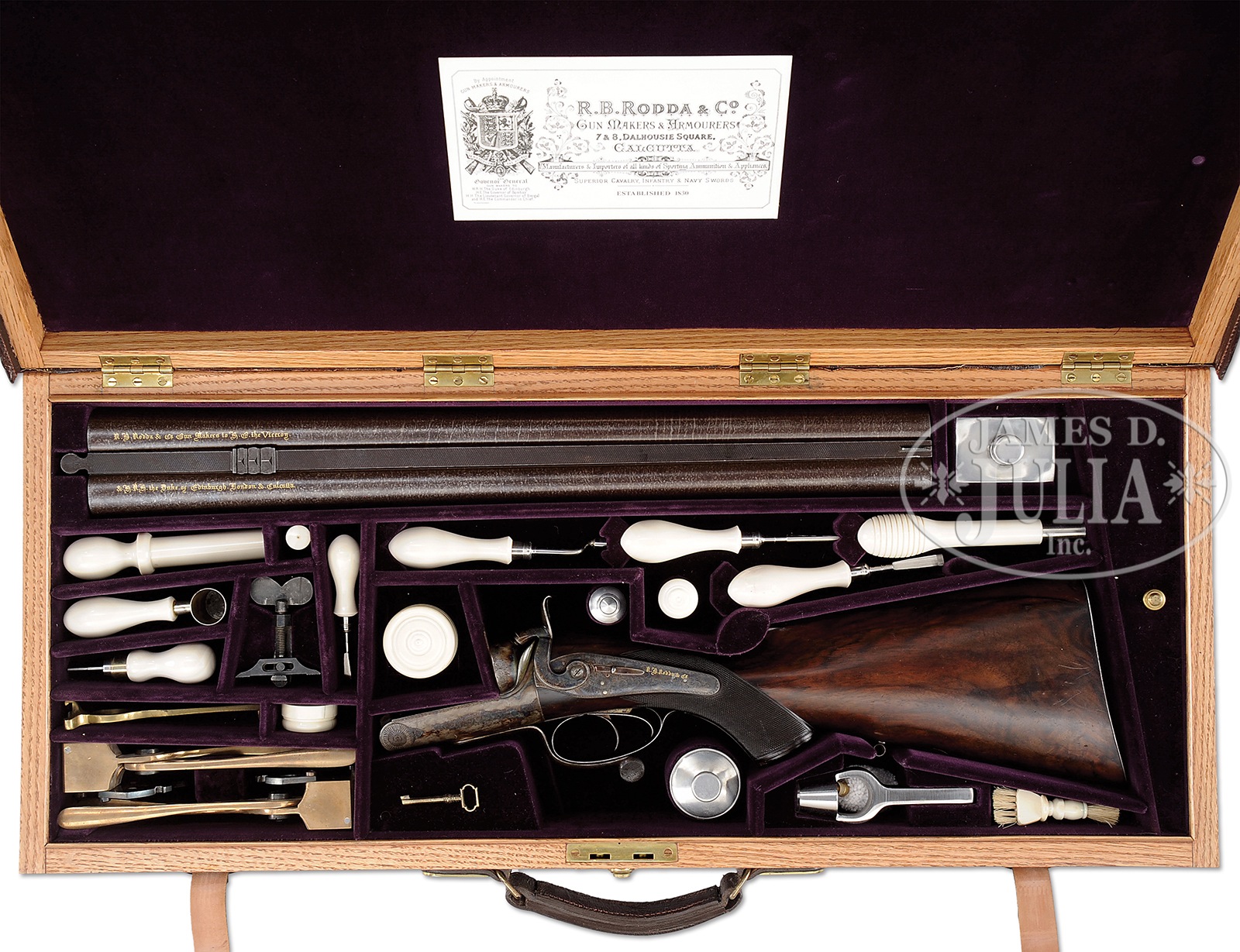 UNEQUALED HIGH ORIGINAL CONDITION PAIR OF FOUR BORE R. B. RODDA DOUBLE RIFLES WITH OVER-THE-TOP EEL SKIN CASES AND BEST IVORY HANDLED ACCESSORIES.SN 20676/ 20677. (ca 1875 ?) Cal. 4 bore. (.960 groove diameter, 11 very narrow lands) 24″ Fine stub Damascus bbls with dolls head extensions, are fitted with full length herringbone matted ribs holding three folding leaf express rear sights, marked for 100, 150, and 200 yards. Silver front beads are longitudinally dovetailed into muzzle ends. Tops of bbls are gold inlaid in English script “R. B. Rodda & Co Gunmakers To H. E. The Viceroy.” and “& H. R. H. The Duke of Edinburgh. London & Calcutta”. Bbl flats are stamped with London black powder proofs for 6 bore. Bottoms of bbls are stamped with SNs. (Many Rodda guns and rifles were sourced from W. & C. Scott, and the numbers on these rifles correspond to Scott’s numbers for 1875.) Massive, round bodied, Jones underlever actions are fitted with non-rebounding peninsula back locks fitted with tall, flat-sided, serpentine hammers with tall spurs and back sliding safeties that engage at half cock. Actions are engraved with approx 50% coverage well cut scroll. “R. B. Rodda & Co” is gold inlaid on each lockplate. Blued trigger guards have SNs on tangs, which extend to large horn grip caps. Dense, lightly marbled, and somewhat figured European walnut capped pistol grip buttstocks measure 14-1/4″ over flat top checkered steel buttplates with short spurs. Buttplates are engraved “SHOT WITH SPHERICAL BALL” “CHARGE OF POWDER 9 drs” “CURTIS & HARVEY’S NO. 6”. Stocks feature typical point pattern checkering at grips, with sling eyes somewhat smaller than those soldered to bottom of bbls, and vacant silver ovals on toe lines. Matching splinter forends with nicely shaped steel tips attach to bbls by captive side nails through engraved oval steel escutcheons. Gun “20676”: Drop at heel: approx 2-3/8″, drop at comb: approx 1-3/4″. Weight: 20 lbs. 8 oz. LOP: 14-1/4″. Gun “20677”: Drop at heel: approx 2-1/4″, drop at comb: approx 1-11/16″. Weight: 20 lbs. 14 oz. LOP: 14-1/4″. Matching cases are of oak with very unusual eel skin leather covering. They are further reinforced with shaped brass corners. Cases are lined in purple velvet, and have paper R. B. Rodda reproduction labels in lid. Cases are semi french fitted for rifles, and a spectacular array of newly made accessories, many with ivory handles or made of ivory. (Ivory was sourced from a large legally trophy hunted tusk (1980) supplied to the case maker by the consignor.) Each case has an identical complement of accessories including two brass molds (one for spherical ball, the other for conical), broken case extractors marked “4”, mainspring vices, wad punches, one large circular oil bottle, one smaller, another rectangular large oil bottle, and the key. “Certifiable pre-ban elephant ivory” accessories include wad rammer, cartridge base decapper, vaseline jar, striker bottle, and dusting brush. Ivory handled accessories include hollow pointing pin for conical mold, old German silver powder measure marked “10 Drs”, three turnscrews, striker key, chamber brush handle, and handle for fine quality large diameter 3-pc cleaning rod with joints of German silver (?) and bodies of ebony. Covered compartments contain five 4 bore brass cases marked with ” R. B. Rodda” and each guns SN. Both also have pull through cleaning kit and mop. PROVENANCE: Thad Scott 1982 correspondence and invoice for sale of these rifles. These rifles are pictured in color on p. 99 of THE TREASURY OF SPORTING GUNS by Charles F. Waterman, where they are described as “big Rodda four bores are fully rifled and very rare.” Listing for a pair of similar rifles with much less condition by Cape Outfitters Oct 1989. Special Note: This item contains or is made of ivory. Do not bid on this lot unless you have read and agreed to our "Ivory Position Statement" and the "Waiver of Legal and Financial Risk to James D. Julia in regards to your Purchase of an Ivory Object." This information is located in the front section of our catalog. CONDITION: Both rifles are in excellent orig condition, showing very little use and only some minor handling marks on wood and metal. Bbls retain well over 95% of their orig Damascus finish. There are some small patches of light oxidation on bbls of rifle 20676. Actions and locks retain nearly all of their orig case hardening color, silvered somewhat on sharp edges and top tangs, and rear portions of lockplates. There is also some light rust flecking on bottom and right side of action on 20677. Charcoal blue of trigger guards remains brilliant, with some silvering and flaking on rifle 20677. Stocks have numerous scratches and marks. Wood is somewhat below metal of buttplates (natural shrinkage). There is some very small repaired damage and checking on 20677 at top rear of left lock. Both rifles show some compression of checkering of forends. Bores are excellent. Bbls are on face. Locks are crisp. Safeties work. Cases are excellent with some very light staining and marks in leather, and minor compressions and rubs on interior cloth. All accessories are excellent. An incredible, unheard of pair of high condition big bore rifles, wonderfully presented. 49958-13 MGM93 IVORY (80,000-120,000) – Lot 2353 Click here to view provenance