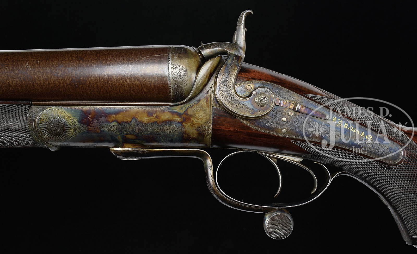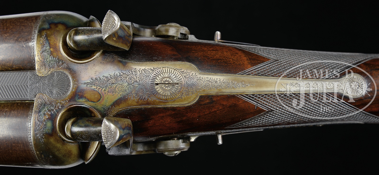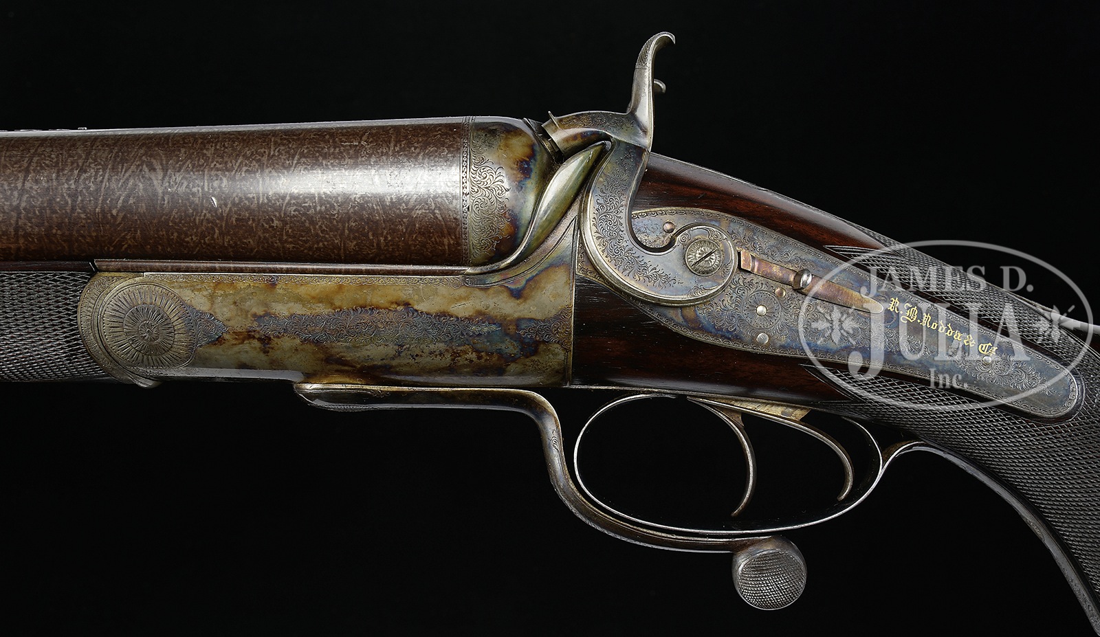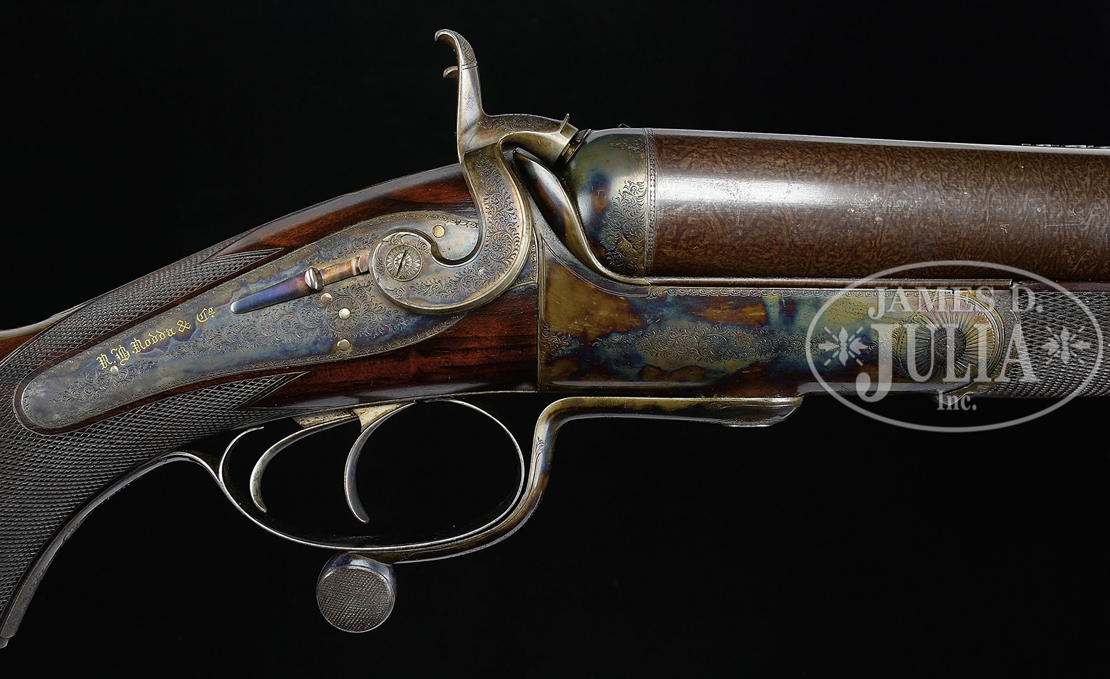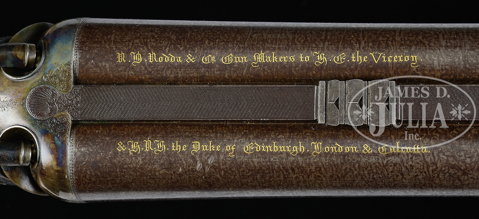 UNEQUALED HIGH ORIGINAL CONDITION PAIR OF FOUR BORE R. B. RODDA DOUBLE RIFLES WITH OVER-THE-TOP EEL SKIN CASES AND BEST IVORY HANDLED ACCESSORIES.SN 20676/ 20677. (ca 1875 ?) Cal. 4 bore. (.960 groove diameter, 11 very narrow lands) 24″ Fine stub Damascus bbls with dolls head extensions, are fitted with full length herringbone matted ribs holding three folding leaf express rear sights, marked for 100, 150, and 200 yards. Silver front beads are longitudinally dovetailed into muzzle ends. Tops of bbls are gold inlaid in English script “R. B. Rodda & Co Gunmakers To H. E. The Viceroy.” and “& H. R. H. The Duke of Edinburgh. London & Calcutta”. Bbl flats are stamped with London black powder proofs for 6 bore. Bottoms of bbls are stamped with SNs. (Many Rodda guns and rifles were sourced from W. & C. Scott, and the numbers on these rifles correspond to Scott’s numbers for 1875.) Massive, round bodied, Jones underlever actions are fitted with non-rebounding peninsula back locks fitted with tall, flat-sided, serpentine hammers with tall spurs and back sliding safeties that engage at half cock. Actions are engraved with approx 50% coverage well cut scroll. “R. B. Rodda & Co” is gold inlaid on each lockplate. Blued trigger guards have SNs on tangs, which extend to large horn grip caps. Dense, lightly marbled, and somewhat figured European walnut capped pistol grip buttstocks measure 14-1/4″ over flat top checkered steel buttplates with short spurs. Buttplates are engraved “SHOT WITH SPHERICAL BALL” “CHARGE OF POWDER 9 drs” “CURTIS & HARVEY’S NO. 6”. Stocks feature typical point pattern checkering at grips, with sling eyes somewhat smaller than those soldered to bottom of bbls, and vacant silver ovals on toe lines. Matching splinter forends with nicely shaped steel tips attach to bbls by captive side nails through engraved oval steel escutcheons. Gun “20676”: Drop at heel: approx 2-3/8″, drop at comb: approx 1-3/4″. Weight: 20 lbs. 8 oz. LOP: 14-1/4″. Gun “20677”: Drop at heel: approx 2-1/4″, drop at comb: approx 1-11/16″. Weight: 20 lbs. 14 oz. LOP: 14-1/4″. Matching cases are of oak with very unusual eel skin leather covering. They are further reinforced with shaped brass corners. Cases are lined in purple velvet, and have paper R. B. Rodda reproduction labels in lid. Cases are semi french fitted for rifles, and a spectacular array of newly made accessories, many with ivory handles or made of ivory. (Ivory was sourced from a large legally trophy hunted tusk (1980) supplied to the case maker by the consignor.) Each case has an identical complement of accessories including two brass molds (one for spherical ball, the other for conical), broken case extractors marked “4”, mainspring vices, wad punches, one large circular oil bottle, one smaller, another rectangular large oil bottle, and the key. “Certifiable pre-ban elephant ivory” accessories include wad rammer, cartridge base decapper, vaseline jar, striker bottle, and dusting brush. Ivory handled accessories include hollow pointing pin for conical mold, old German silver powder measure marked “10 Drs”, three turnscrews, striker key, chamber brush handle, and handle for fine quality large diameter 3-pc cleaning rod with joints of German silver (?) and bodies of ebony. Covered compartments contain five 4 bore brass cases marked with ” R. B. Rodda” and each guns SN. Both also have pull through cleaning kit and mop. PROVENANCE: Thad Scott 1982 correspondence and invoice for sale of these rifles. These rifles are pictured in color on p. 99 of THE TREASURY OF SPORTING GUNS by Charles F. Waterman, where they are described as “big Rodda four bores are fully rifled and very rare.” Listing for a pair of similar rifles with much less condition by Cape Outfitters Oct 1989. Special Note: This item contains or is made of ivory. Do not bid on this lot unless you have read and agreed to our "Ivory Position Statement" and the "Waiver of Legal and Financial Risk to James D. Julia in regards to your Purchase of an Ivory Object." This information is located in the front section of our catalog. CONDITION: Both rifles are in excellent orig condition, showing very little use and only some minor handling marks on wood and metal. Bbls retain well over 95% of their orig Damascus finish. There are some small patches of light oxidation on bbls of rifle 20676. Actions and locks retain nearly all of their orig case hardening color, silvered somewhat on sharp edges and top tangs, and rear portions of lockplates. There is also some light rust flecking on bottom and right side of action on 20677. Charcoal blue of trigger guards remains brilliant, with some silvering and flaking on rifle 20677. Stocks have numerous scratches and marks. Wood is somewhat below metal of buttplates (natural shrinkage). There is some very small repaired damage and checking on 20677 at top rear of left lock. Both rifles show some compression of checkering of forends. Bores are excellent. Bbls are on face. Locks are crisp. Safeties work. Cases are excellent with some very light staining and marks in leather, and minor compressions and rubs on interior cloth. All accessories are excellent. An incredible, unheard of pair of high condition big bore rifles, wonderfully presented. 49958-13 MGM93 IVORY (80,000-120,000) – Lot 2353 Click here to view provenance