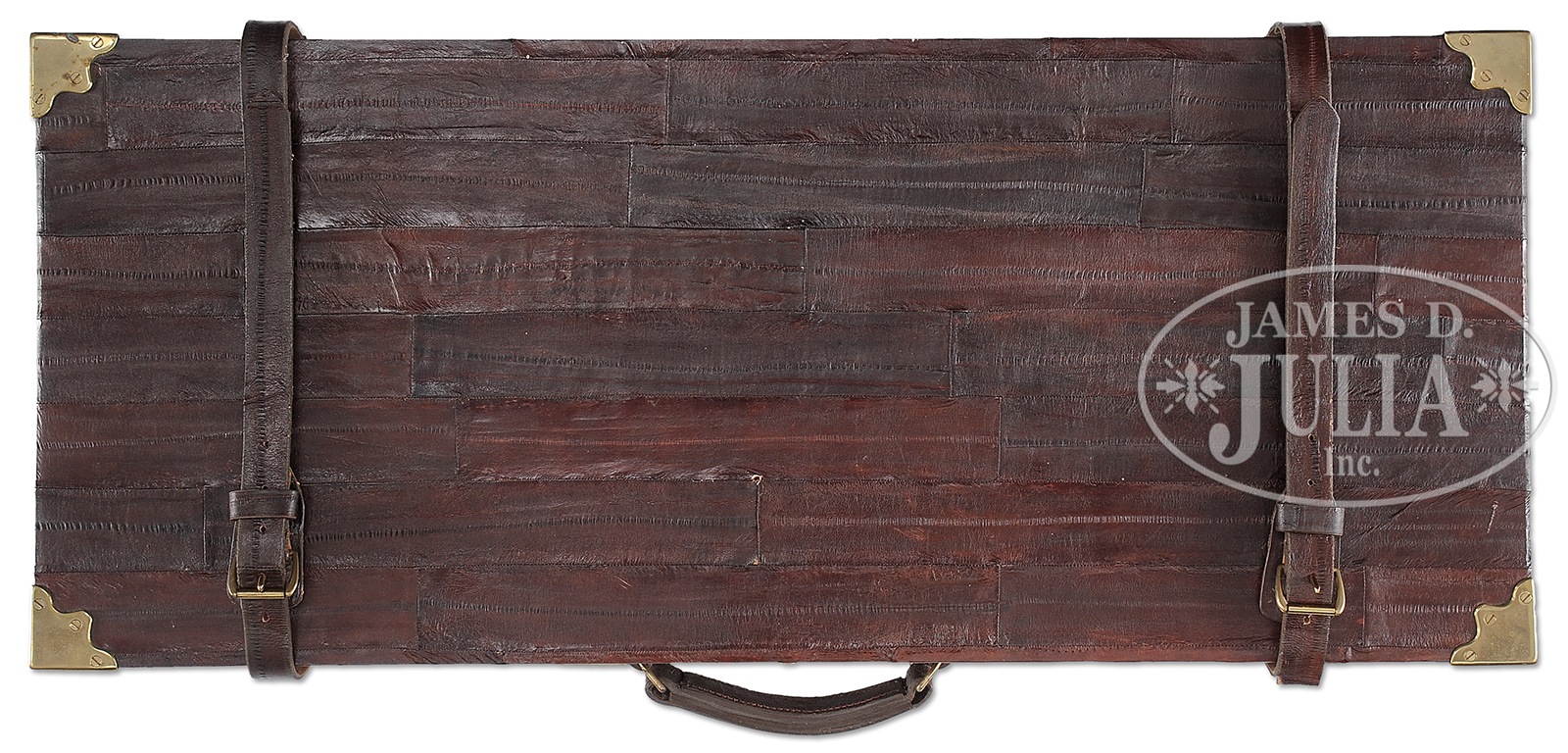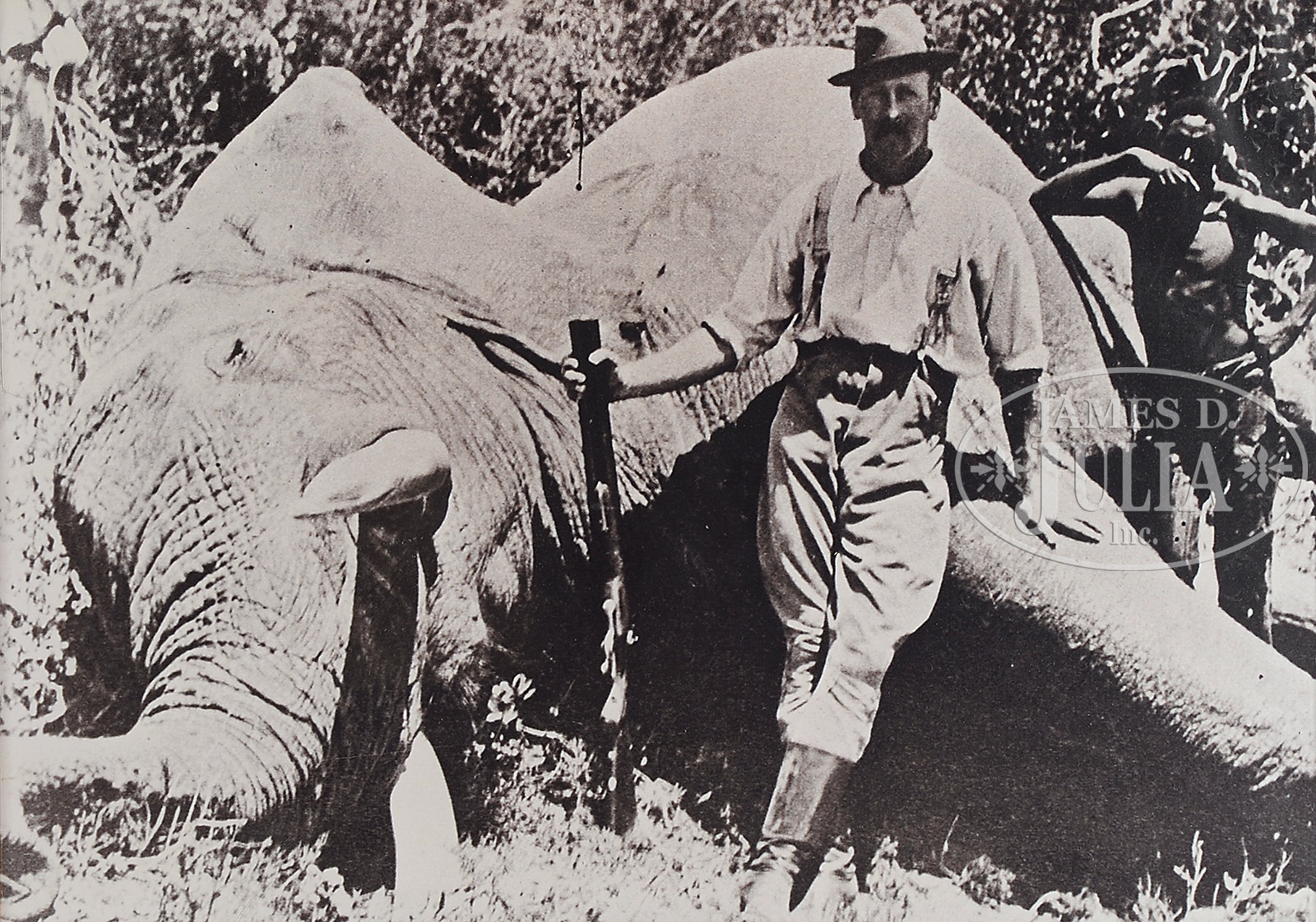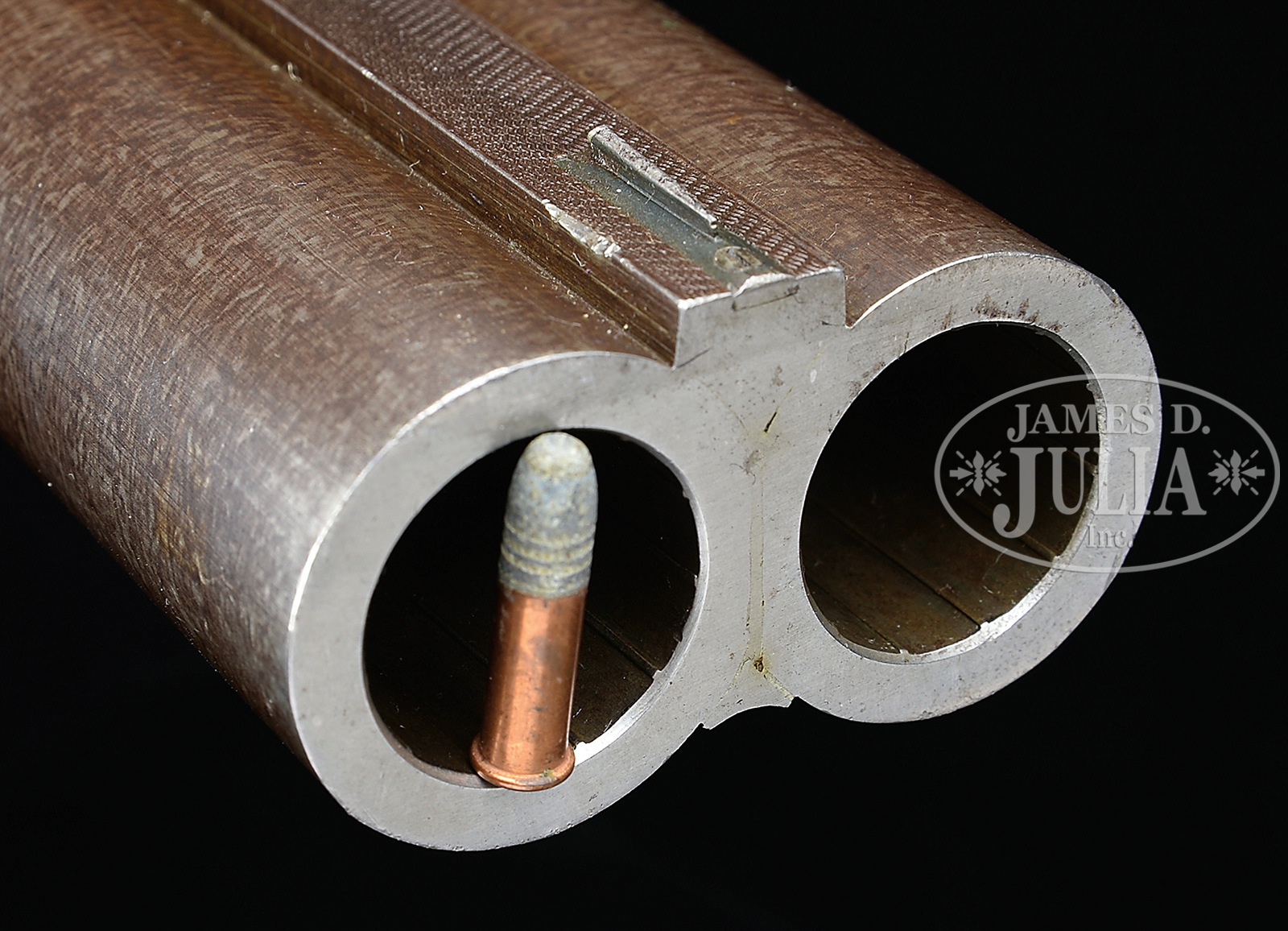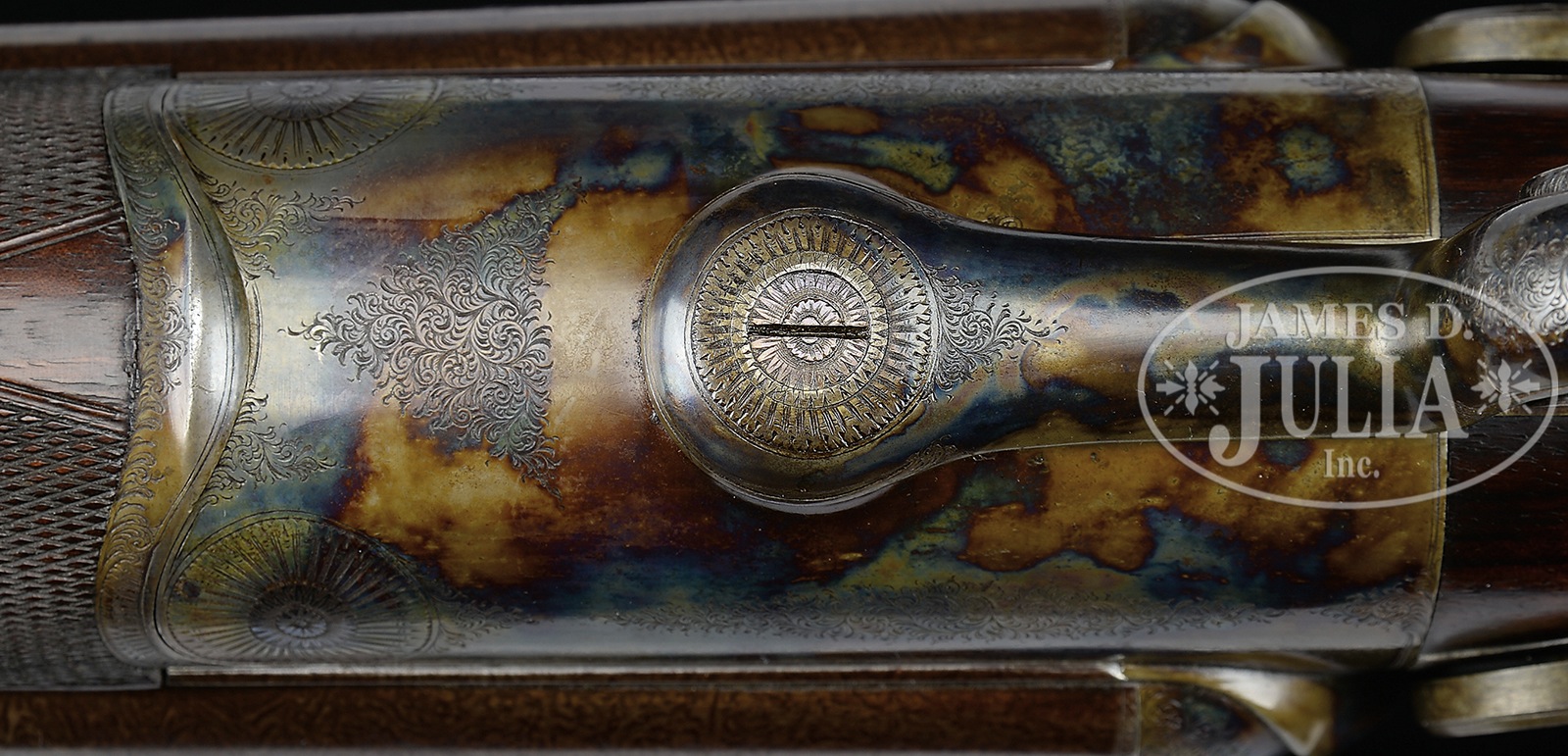 UNEQUALED HIGH ORIGINAL CONDITION PAIR OF FOUR BORE R. B. RODDA DOUBLE RIFLES WITH OVER-THE-TOP EEL SKIN CASES AND BEST IVORY HANDLED ACCESSORIES.SN 20676/ 20677. (ca 1875 ?) Cal. 4 bore. (.960 groove diameter, 11 very narrow lands) 24″ Fine stub Damascus bbls with dolls head extensions, are fitted with full length herringbone matted ribs holding three folding leaf express rear sights, marked for 100, 150, and 200 yards. Silver front beads are longitudinally dovetailed into muzzle ends. Tops of bbls are gold inlaid in English script “R. B. Rodda & Co Gunmakers To H. E. The Viceroy.” and “& H. R. H. The Duke of Edinburgh. London & Calcutta”. Bbl flats are stamped with London black powder proofs for 6 bore. Bottoms of bbls are stamped with SNs. (Many Rodda guns and rifles were sourced from W. & C. Scott, and the numbers on these rifles correspond to Scott’s numbers for 1875.) Massive, round bodied, Jones underlever actions are fitted with non-rebounding peninsula back locks fitted with tall, flat-sided, serpentine hammers with tall spurs and back sliding safeties that engage at half cock. Actions are engraved with approx 50% coverage well cut scroll. “R. B. Rodda & Co” is gold inlaid on each lockplate. Blued trigger guards have SNs on tangs, which extend to large horn grip caps. Dense, lightly marbled, and somewhat figured European walnut capped pistol grip buttstocks measure 14-1/4″ over flat top checkered steel buttplates with short spurs. Buttplates are engraved “SHOT WITH SPHERICAL BALL” “CHARGE OF POWDER 9 drs” “CURTIS & HARVEY’S NO. 6”. Stocks feature typical point pattern checkering at grips, with sling eyes somewhat smaller than those soldered to bottom of bbls, and vacant silver ovals on toe lines. Matching splinter forends with nicely shaped steel tips attach to bbls by captive side nails through engraved oval steel escutcheons. Gun “20676”: Drop at heel: approx 2-3/8″, drop at comb: approx 1-3/4″. Weight: 20 lbs. 8 oz. LOP: 14-1/4″. Gun “20677”: Drop at heel: approx 2-1/4″, drop at comb: approx 1-11/16″. Weight: 20 lbs. 14 oz. LOP: 14-1/4″. Matching cases are of oak with very unusual eel skin leather covering. They are further reinforced with shaped brass corners. Cases are lined in purple velvet, and have paper R. B. Rodda reproduction labels in lid. Cases are semi french fitted for rifles, and a spectacular array of newly made accessories, many with ivory handles or made of ivory. (Ivory was sourced from a large legally trophy hunted tusk (1980) supplied to the case maker by the consignor.) Each case has an identical complement of accessories including two brass molds (one for spherical ball, the other for conical), broken case extractors marked “4”, mainspring vices, wad punches, one large circular oil bottle, one smaller, another rectangular large oil bottle, and the key. “Certifiable pre-ban elephant ivory” accessories include wad rammer, cartridge base decapper, vaseline jar, striker bottle, and dusting brush. Ivory handled accessories include hollow pointing pin for conical mold, old German silver powder measure marked “10 Drs”, three turnscrews, striker key, chamber brush handle, and handle for fine quality large diameter 3-pc cleaning rod with joints of German silver (?) and bodies of ebony. Covered compartments contain five 4 bore brass cases marked with ” R. B. Rodda” and each guns SN. Both also have pull through cleaning kit and mop. PROVENANCE: Thad Scott 1982 correspondence and invoice for sale of these rifles. These rifles are pictured in color on p. 99 of THE TREASURY OF SPORTING GUNS by Charles F. Waterman, where they are described as “big Rodda four bores are fully rifled and very rare.” Listing for a pair of similar rifles with much less condition by Cape Outfitters Oct 1989. Special Note: This item contains or is made of ivory. Do not bid on this lot unless you have read and agreed to our "Ivory Position Statement" and the "Waiver of Legal and Financial Risk to James D. Julia in regards to your Purchase of an Ivory Object." This information is located in the front section of our catalog. CONDITION: Both rifles are in excellent orig condition, showing very little use and only some minor handling marks on wood and metal. Bbls retain well over 95% of their orig Damascus finish. There are some small patches of light oxidation on bbls of rifle 20676. Actions and locks retain nearly all of their orig case hardening color, silvered somewhat on sharp edges and top tangs, and rear portions of lockplates. There is also some light rust flecking on bottom and right side of action on 20677. Charcoal blue of trigger guards remains brilliant, with some silvering and flaking on rifle 20677. Stocks have numerous scratches and marks. Wood is somewhat below metal of buttplates (natural shrinkage). There is some very small repaired damage and checking on 20677 at top rear of left lock. Both rifles show some compression of checkering of forends. Bores are excellent. Bbls are on face. Locks are crisp. Safeties work. Cases are excellent with some very light staining and marks in leather, and minor compressions and rubs on interior cloth. All accessories are excellent. An incredible, unheard of pair of high condition big bore rifles, wonderfully presented. 49958-13 MGM93 IVORY (80,000-120,000) – Lot 2353 Click here to view provenance