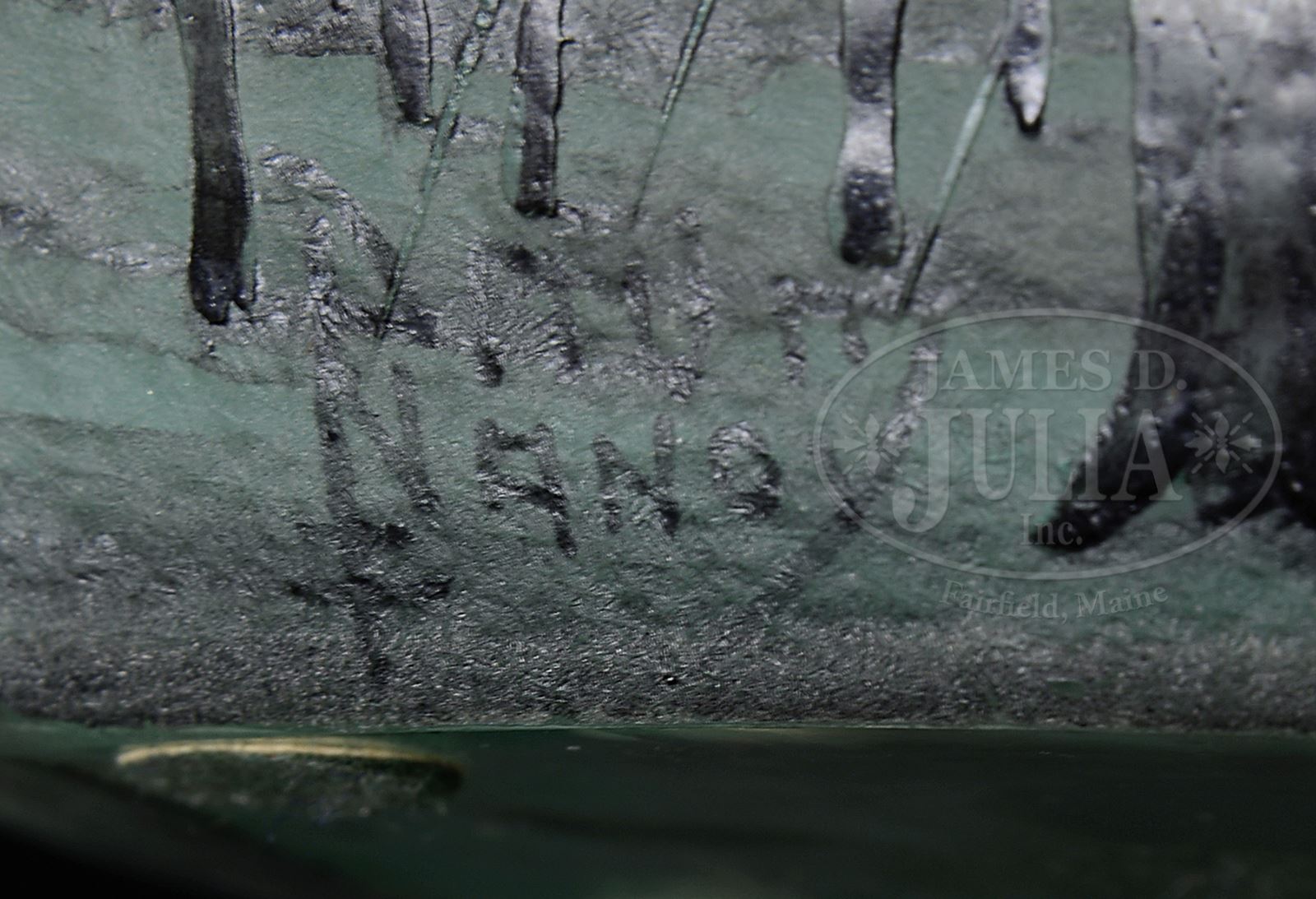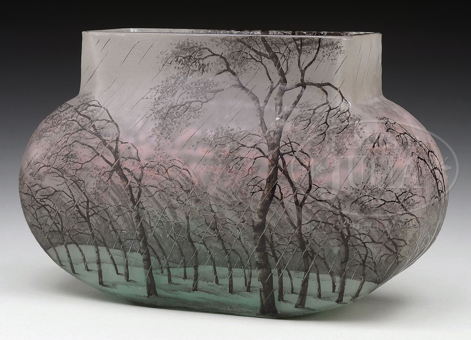 DAUM NANCY RAIN SCENE PILLOW VASE.Daum cameo and enameled pillow shaped vase has scene of barren trees in driving rain set against an acid-textured green, lavender and clear background. Vase is signed on front in black “Daum Nancy” with cross of Lorraine. SIZE: 4-3/4″ t x 7″ w. PROVENANCE: From an Unreserved Texas Collection. CONDITION: Minor roughness to rim, otherwise very good to excellent. 50006-68 (2,500-3,500) – Lot 2353