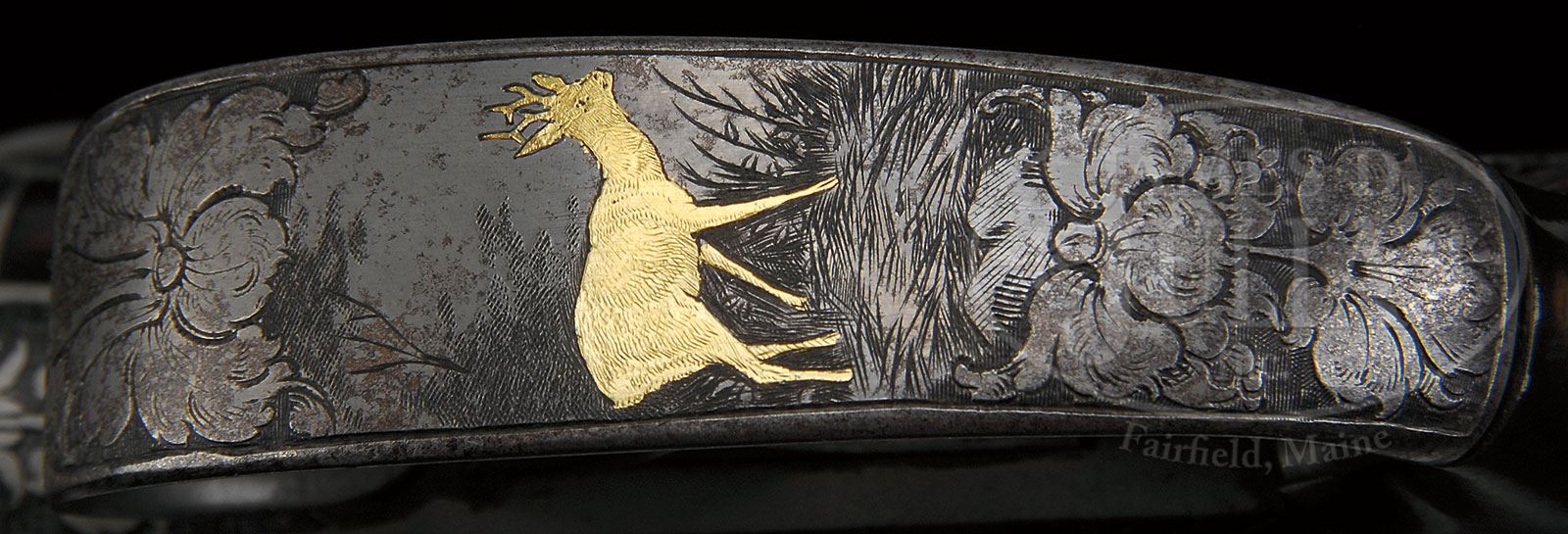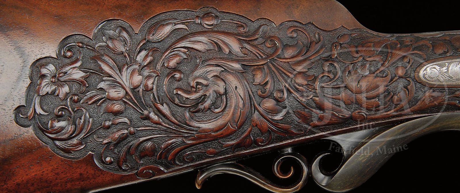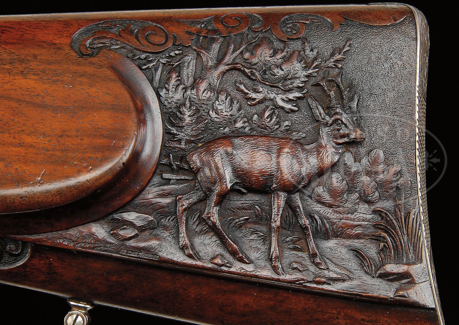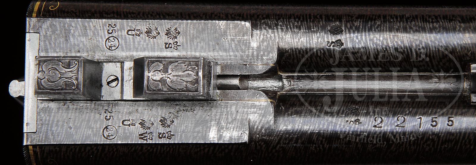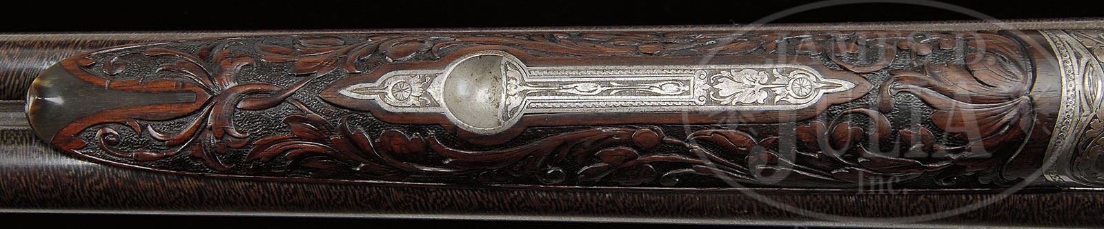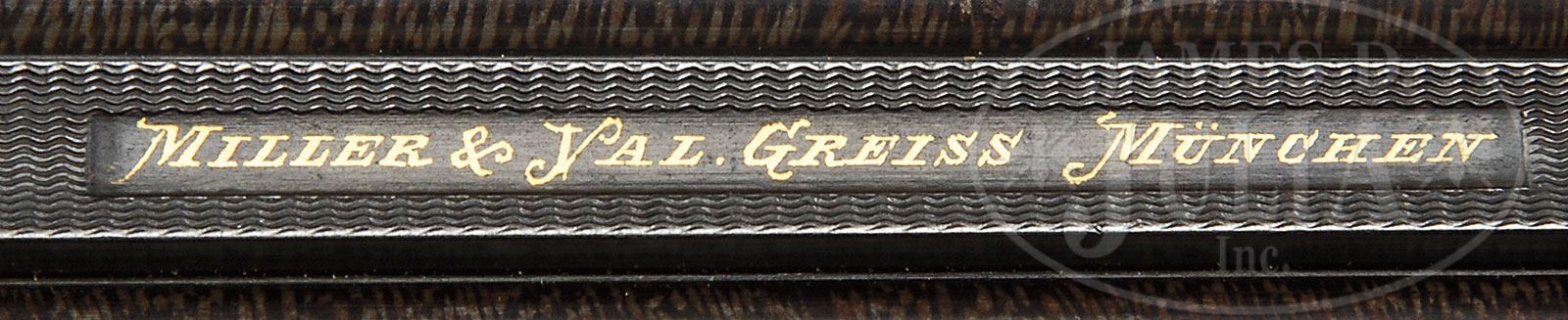 VERY FINE MILLER AND VAL GREISS RELIEF CARVED AND GOLD INLAID 24 BORE TOP LEVER HAMMER GAME GUN.SN 22155. Cal. 24 Bore. 2-3/4″ Chambers. This fine gun by this esteemed Bavarian maker, exhibits the quality of finish expected from them. 26-3/4″ Bernard twist bbls with high matted concave game rib, are inlaid with gold “Miller & Val. Greiss Munchen” in rectangular unmatted portion of rib. Gold band is at breech with 1″ triangle scrolled gold wire inlay. Bbl flats are stamped with German imperial proofs for 24 bore. Bottom of right bbl is stamped with SN. French gray round bar top lever action features dolls head extension and nicely filed flared fences. Back action peninsula locks have short serpentine rebounding hammers. Steel trigger guard has horn semi pistol grip extension with scroll carved finials. Metal parts are engraved with very finely executed shaded scrolled acanthus with gold wire accents at top of fences, top lever, and tops of hammers. Gold inlaid, finely shaded vignettes of game are on action and lockplates; trio of ducks in marsh on left action, covey of quail on right; pointer and setter inlaid on right lockplate, and trio of rabbits on left. Roebuck graces trigger guard bow. Nicely marbled European walnut buttstock measures 12-3/4″ over steel buttplate which is checkered at center, and has shaded scrolled acanthus engraving at toe and heel. SN is stamped at heel. Stock features right hand shadow line cheekpiece, and is exquisitely carved with very fine relief scrolled acanthus carving in place of checkering, with central dragons head in extended panel on right side of stock, and fine rendition of roebuck at edge of meadow on left, behind cheekpiece. Seldom seen carvers signature (Fr. Ch?triebel) appears at bottom of scene behind roebuck. Matching splinter forend has small horn Schnabel tip and Deeley release. Bore diameter: left -.573, right -.573. Bore restrictions: left -.014, right -.002. Wall thickness: left -.039, right -.043. Drop at heel: 2-15/16″, drop at comb: 1-1/4″. Weight: 5 lbs. 7.7 oz, LOP 12-3/4″. CONDITION: Very fine. Bbls retain 85 – 90% orig brown, with most pattern visible, and which has toned to a darker brown, silvered at muzzles, with a few areas cleaned over pinprick pitting. Action and lockplates retain most of their French gray, silvered on high points, and turning to brown around bottom of action, and on lockplate tails. Stocks retain most of their orig finish. Carving remains excellent, but is slightly softened at grip and forend from handling and use. Bores are excellent. Action is tight. Bbls are slightly off face. Locks are crisp. 4-55453 (12,500-22,500) – Lot 2357