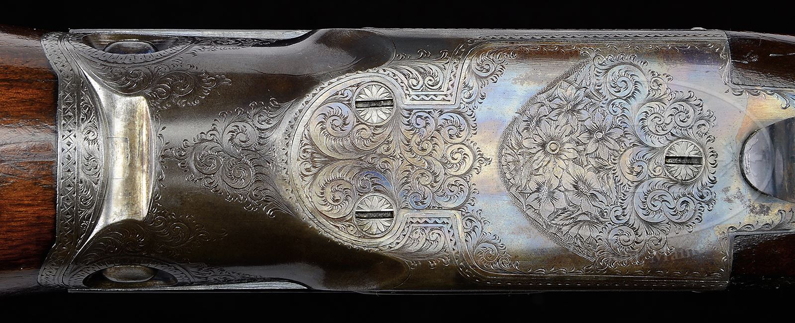 *SCARCE PARKER SB SINGLE BARREL TRAP GUN.SN 184068. Cal. 12 ga. 2-5/8″ Chamber. Unmarked for Frame size. 32″ Bbl has slightly raised ventilated rib engraved with Parker’s Meriden CT address and “ACME STEEL”. Bbl flats are stamped with steel type and weight. Left side of lump is stamped with SN. Typical Parker single trap action is filed in “B” grade style with single bead around fences. All correct numbers and marks are on water table. Action features nickel-plated sgl trigger. Action is engraved with 70 – 80% coverage scroll with floral highlights within geometric borders. “Parker Bros” is engraved on rectangle on rear of both sides. A well cut floral bouquet is on trigger plate. Trigger guard bow is scroll engraved. SN is at grip. Finely marbled and lightly figured European walnut straight grip buttstock measures 14-5/8″ over Silver type pad. Stock is embellished in typical “B” grade style with inset checkered side panels, and deeply carved fleur-di-lis drop points. Checkering has shaped mullered borders with fleur-di-lis intrusions at top into butt. A vacant gold oval is on toe line. Matching large beavertail ejector forend has reinforcing bolt and typical Parker release. Ejector patent date is on iron. Bore diameter: .733. Bore restrictions: .035 (full). Wall thickness: -.068. Drop at heel: 2-5/16″, drop at comb: 1-3/8″. Weight: 7 lbs 15 oz. LOP: 14-5/8″. Special Note: This item contains or is made of ivory. Do not bid on this lot unless you have read and agreed to our "Ivory Position Statement" and the "Waiver of Legal and Financial Risk to James D. Julia in regards to your Purchase of an Ivory Object." This information is located in the front section of our catalog. CONDITION: Exceptionally fine. Bbl retains approx 95% orig blue with some light marks and high edge wear. Action retains approx 90% orig case hardening color, thinned a bit on beads and top tang. Trigger guard retains about half of its orig blue, most loss due to flaking. Stocks retain over 90% of their orig finish with numerous light marks and scratches, with perhaps some extra oil rubbed in at time of installation of newer pad, checkering lightly worn. Bore is excellent. Action is tight. Ejector is strong. An excellent example of this scarce Parker single, with only 68 made in this bbl length and grade according to THE PARKER STORY. “Certifiable pre-ban ivory” bead sights. 49417-17 MGM316 IVORY (4,000-6,000) – Lot 2358