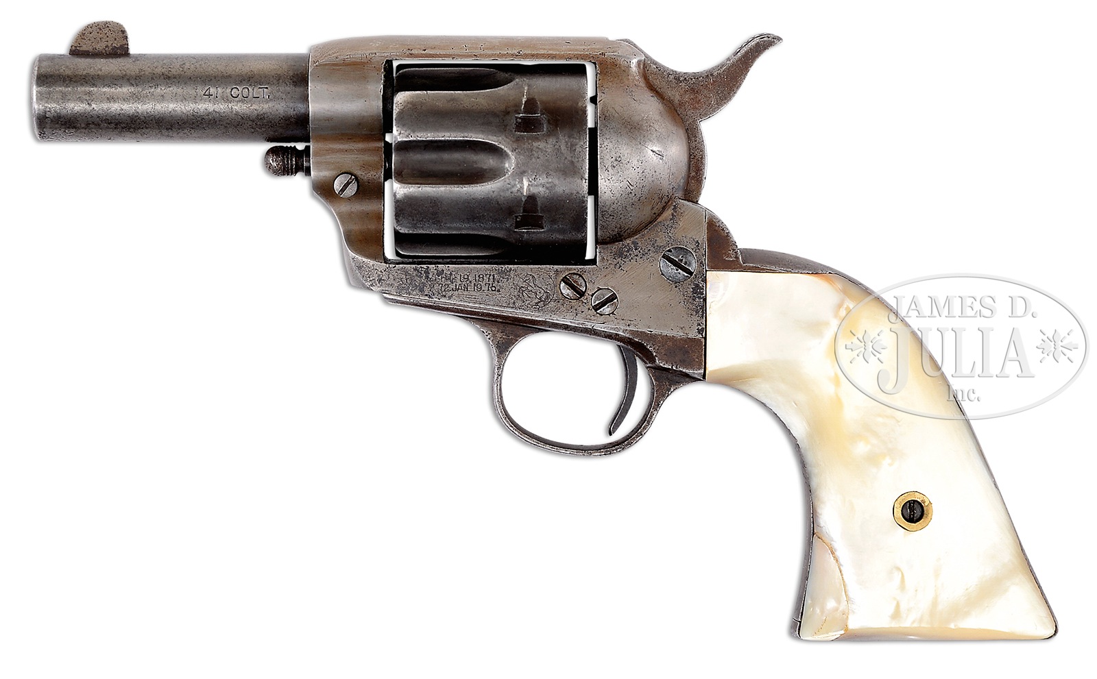 *COLT SINGLE ACTION ARMY EJECTORLESS MODEL REVOLVER.SN 235613. Cal. 41 Colt. 3″ bbl, blue and case color finish, 2-pc Mother of Pearl grips. Bbl has standard 2-line address on top with index mark and cal mark on left side. There is a small “41” stamped on bottom of bbl in front of frame. Frame has 2-line patent mark at forward left side with Rampant Colt logo in circle to the right. Loading gate has assembly number 594 on rear face. Assembly number 594 is also stamped on frame under trigger guard. SN matches on frame, trigger guard and backstrap. Cyl is unmarked. Grips are unmarked and have a “low screw” design. Hammer has course knurling with margin. Frame has correct profile for this model and no evidence of weld. Consignor states that this revolver was found over 50 years ago in pieces in a shoebox with all parts disassembled, including the bbl. Revolver was very rusty and pitted and was cleaned and reassembled with some parts replaced. There is a very slight gap between the breech end of bbl and frame as a result of this cleaning. CONDITION: Very good. Bbl has a silver/gray patina overall with sharp markings and full size front sight. Bore is dark but has visible rifling and some stains. Frame has been cleaned and is slightly undersized at the forward left side where there was some heavy pitting. There is also heavy pitting on the inside of the top strap and inside bottom of frame which has been cleaned. Trigger guard and backstrap are both a dark brown patina that has been cleaned with some staining on the forestrap behind trigger. Backstrap is a plum/brown patina. Main spring has been replaced and some screws have been replaced. All markings are legible. Cyl is a plum/gray patina overall with edge wear and good chambers, with a slight drag mark. Grips have a repair at the toe on the left side and a chip off the heel on the right side. Grips show nice figure. Grips are also heavily rust stained on the inside. A good old Sheriff’s Model six-shooter that has been given a second chance. 50479-1 (3,000-5,000) C&R – Lot 2358