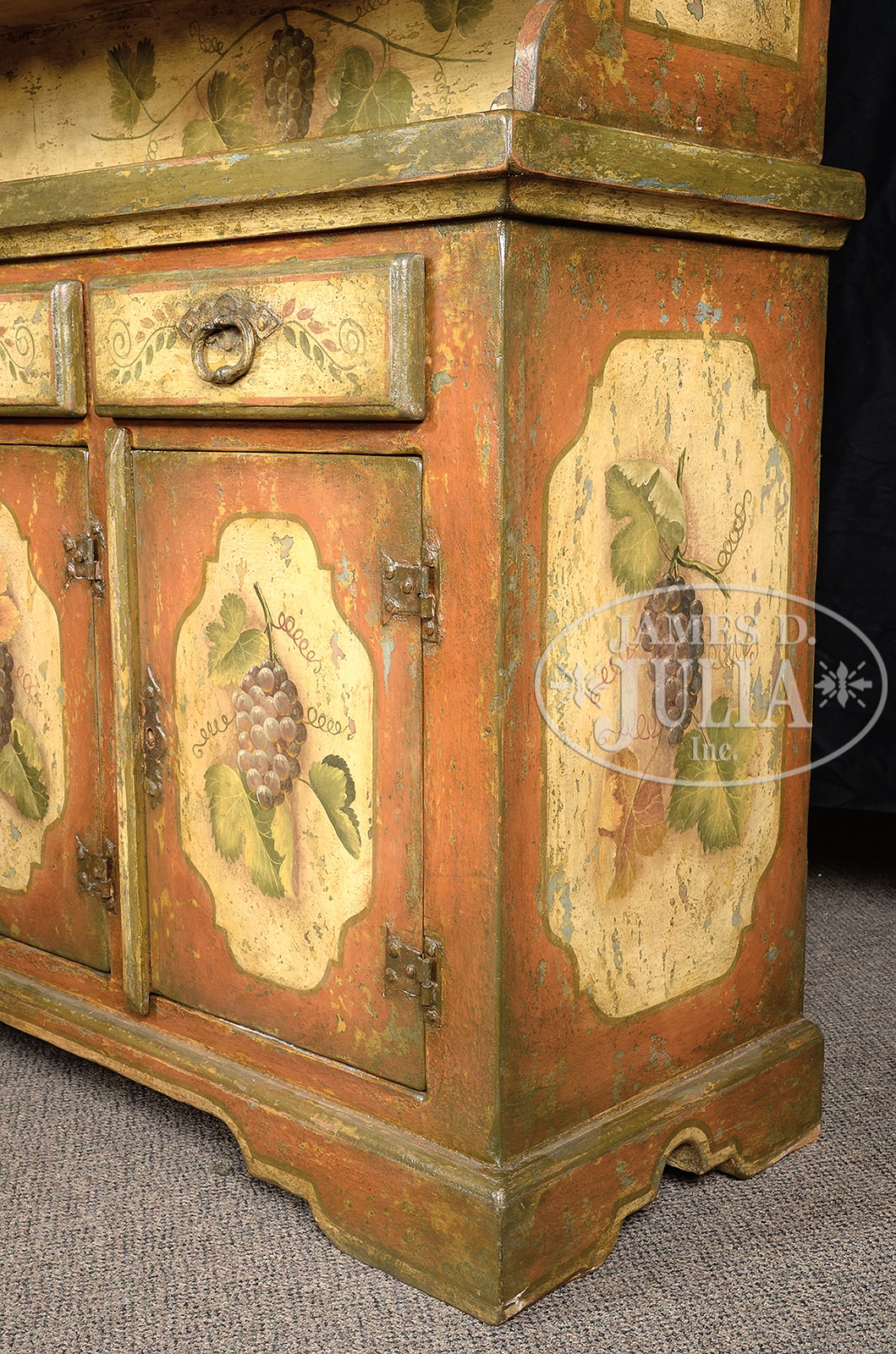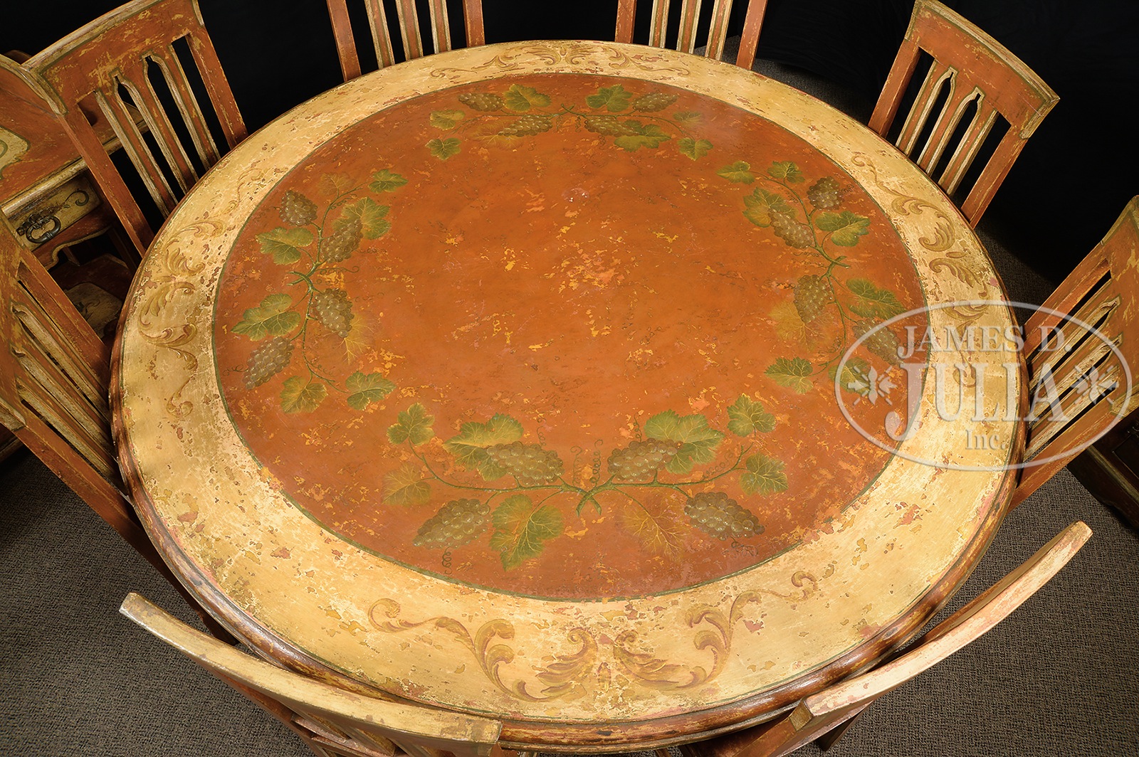 ROBERTA SCHILLING DECORATED DINING SET.1995 – 2006, Brazil. Hand painted set designed by Roberta Schilling comprised of; open side board paint decorated with basket of fruit within a cartouche with foliate borders and stylized spray of fruit amongst leaf tips and tendrils within cartouche. Rectangular shelf with 3/4 splash guard projecting above scrolled apron fitted with 4 aligned short drawers above open shelf, the whole raised on square legs. Fruit decorations on cream ground with wide terra cotta borders and green trim throughout. 2 part hutch with open top decorated with clusters of grapes on vines, upper case of 3 open shelves beneath molded cornice on shaped supports all with scrolling edges, fitted on a rectangular base of 3 aligned drawers above 3 cupboard doors on shaped bracket feet. Set of 10 side chairs each with rectangular crestrail above 3 vertical shaped splats of architectural form joined to the trapezoidal solid seat with beveled edge raised on square legs joined by “H” form stretcher of which 8 chairs are painted in terra cotta with cream and green borders conforming with rest of set. The 2 hostess chairs painted to compliment set it a cream mustered or marigold finish. Large round dining table also decorated with garland of grape clusters and vines on terra cotta ground within wide cream border decorated with foliate scrolls supported by a massive neo-classical pedestal with in curved sides joined to socle raised on “X” form trestle feet. Paint decoration throughout set is by design in Spanish taste and distressed. NOTE: Roberta Schilling, a native of Brazil, comes from a family of designers. She later attended college in Florida where she discovered new ways to apply her knowledge of art, at which time she developed her concept of creating high quality hand painted Brazilian style furniture for an American audience at trade shows. In 1995 she transformed her concept into reality by producing furniture such as the set offered here today. She further expanded her line in 2006 to include contemporary furniture. SIZE: Side board: 36″ h (overall) 32″ h (work surface) x 70″ l x 22″ d. Hutch 84″ h x 57″ l, 60″ l (overall) x 19″ d. Chairs: 44-1/2″ h (back) 19″ h (seat) x 19″ w (seat). Table: 80″ dia x 31″ h. CONDITION: Structurally very good, all painted surfaces as designed with minor age appropriate wear. 49852-2 (20,000-25,000) – Lot 2360