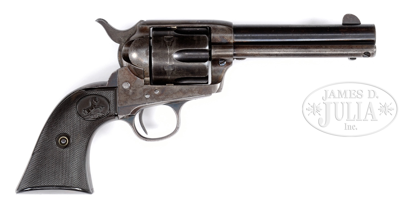 *COLT SINGLE ACTION ARMY REVOLVER.SN 201953. Cal. 38 WCF. 4-3/4″ bbl, blue finish, checkered hard rubber grips. CONDITION: Very good. Revolver retains 40-50% blue finish. Bright in protected areas. Vivid case color in the corners of frame. Nice screws. Orig grips with slight damage at toe of left grip. Hand needs tuning otherwise good honest working gun. 50039-1 (3,000-4,000) C&R – Lot 2360
