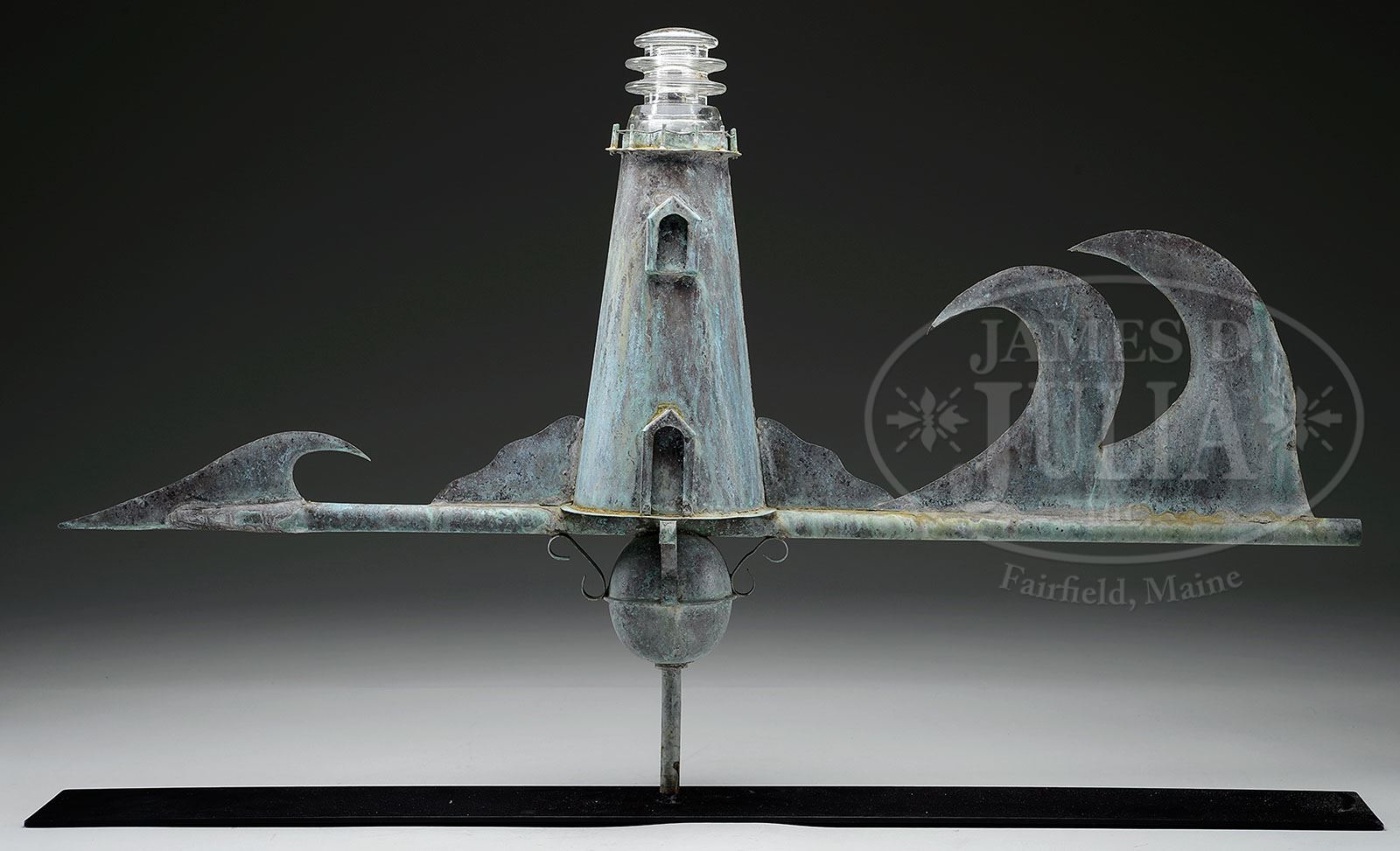 Please Note: Upon inspection we determined that the arrow is actually a cascading wave and never had a bottom helf to the arrow point tip. THREE DIMENSIONAL COPPER LIGHTHOUSE WEATHERVANE. Circa 1920, Cape Cod, Massachusetts. This nice graphic example with conical form lighthouse applied with windows, doors, and widow’s walk, the beacon fashioned from a glass electrical insulator used as light beacon. The lighthouse depicted on a landscape outcrop, with three dimensional waves and arrowhead on a ball with scroll brackets. Now offered with museum stand. SIZE: 41″ L x 25″ T. CONDITION: Very good, nice verdigris surfaces. Widow’s walk railing slightly askew, missing bottom half of arrow point. 9-92079 (2,000-4,000)