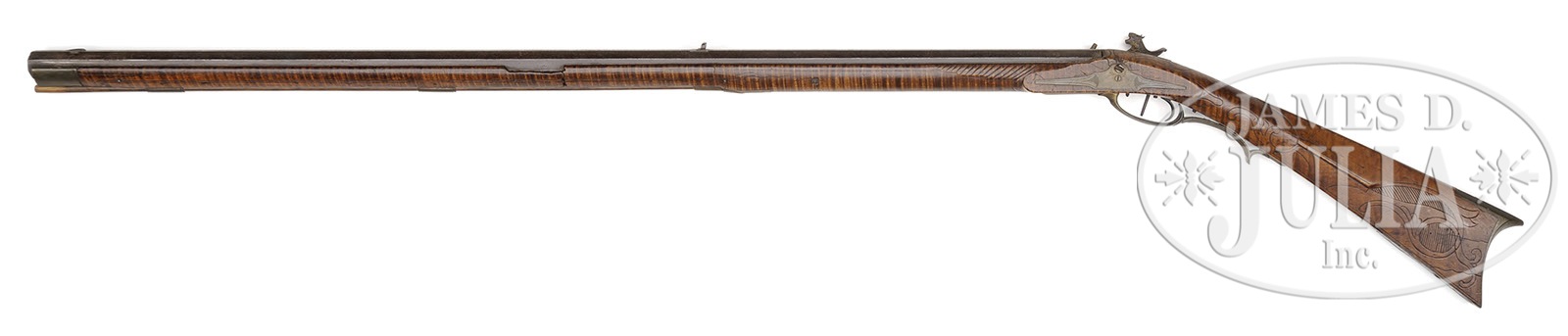 INCISED CARVED CURLY MAPLE PERCUSSION KENTUCKY RIFLE ATTRIBUTED TO DUNMEYER OF SOMERSET COUNTY, PA.SN NSN. Cal. 36. 52″ overall with a 37″ full oct unsigned rifled bbl. Buttplate is 3-1/2″ high x 1-1/4″ wide. Brass 4-pc engraved patchbox with 4 piercings. Brass 5″ long engraved side plate with one lock screw. Incise carved forward and rear of the cheek piece, forward of the patchbox and around the bbl tang. Relief carved feather design extending 4″ forward of the lock and sideplate panels. There seems to be very faint letter “D” on the lockplate suggesting the lock may have been initialed by its maker. The rifle has dbl set triggers. The Dunmeyer family of gunsmiths were active in Somerset County, PA from the 1820’s to 1880’s. CONDITION: Very good. There is a break through the forend, 18″ from the muzzle with a 2 x 1-1/4″ sliver missing on the left hand side and a second break through the forend at the rear ramrod pipe. There are several shrinkage cracks at the toe of the butt. The percussion lock is not working and needs adjustment. This gun appears to be in “as found” condition with no attempt to repair or stabilize any of the breaks or shrinkage cracks. 4-50850 RG104 (1,500-2,500) – Lot 2363